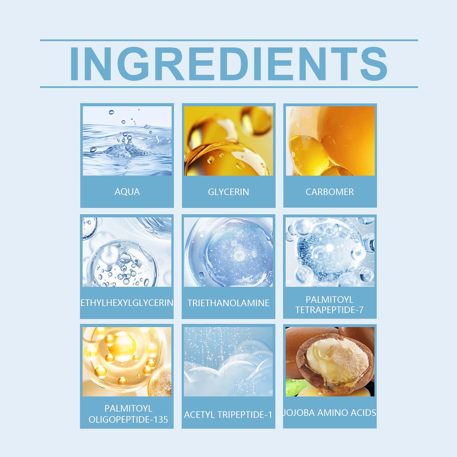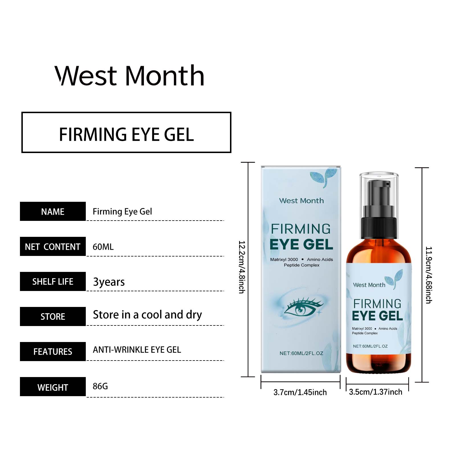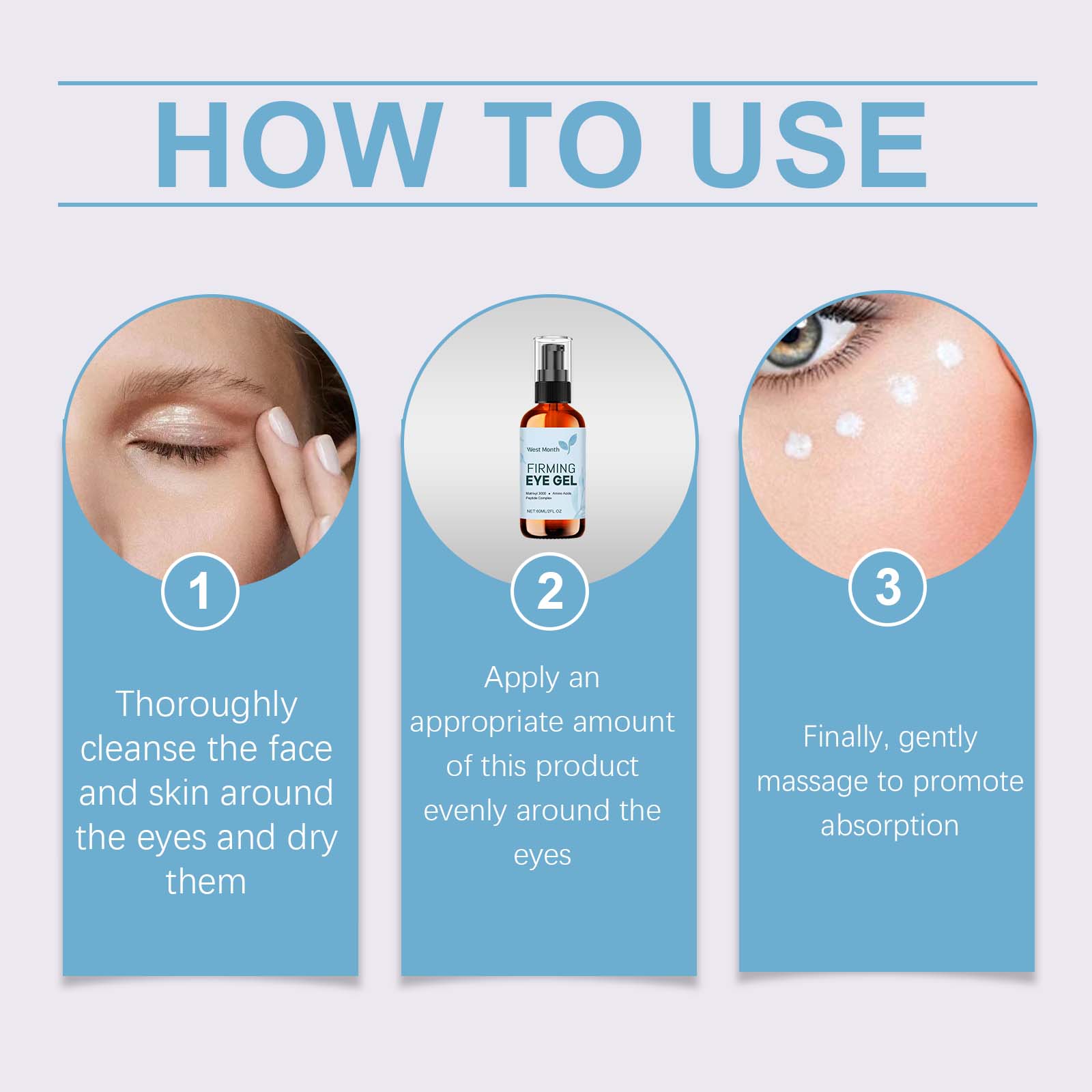 Our eye care gels contain glycerin, carbomer. It can be uniquely formulated to penetrate deep into the skin and effectively reduce fine lines and wrinkles. Improve the elasticity of the skin around the eyes, tighten the bags under the eyes, and improve the black eye roll. Its application method is very simple: thoroughly clean the face and eye skin, and dry it, take a proper amount of this product evenly spoon on the eye. Finally, gently massage to promote absorption. It can also smooth the fine lines around the eyes and make the skin smoother and more delicate.