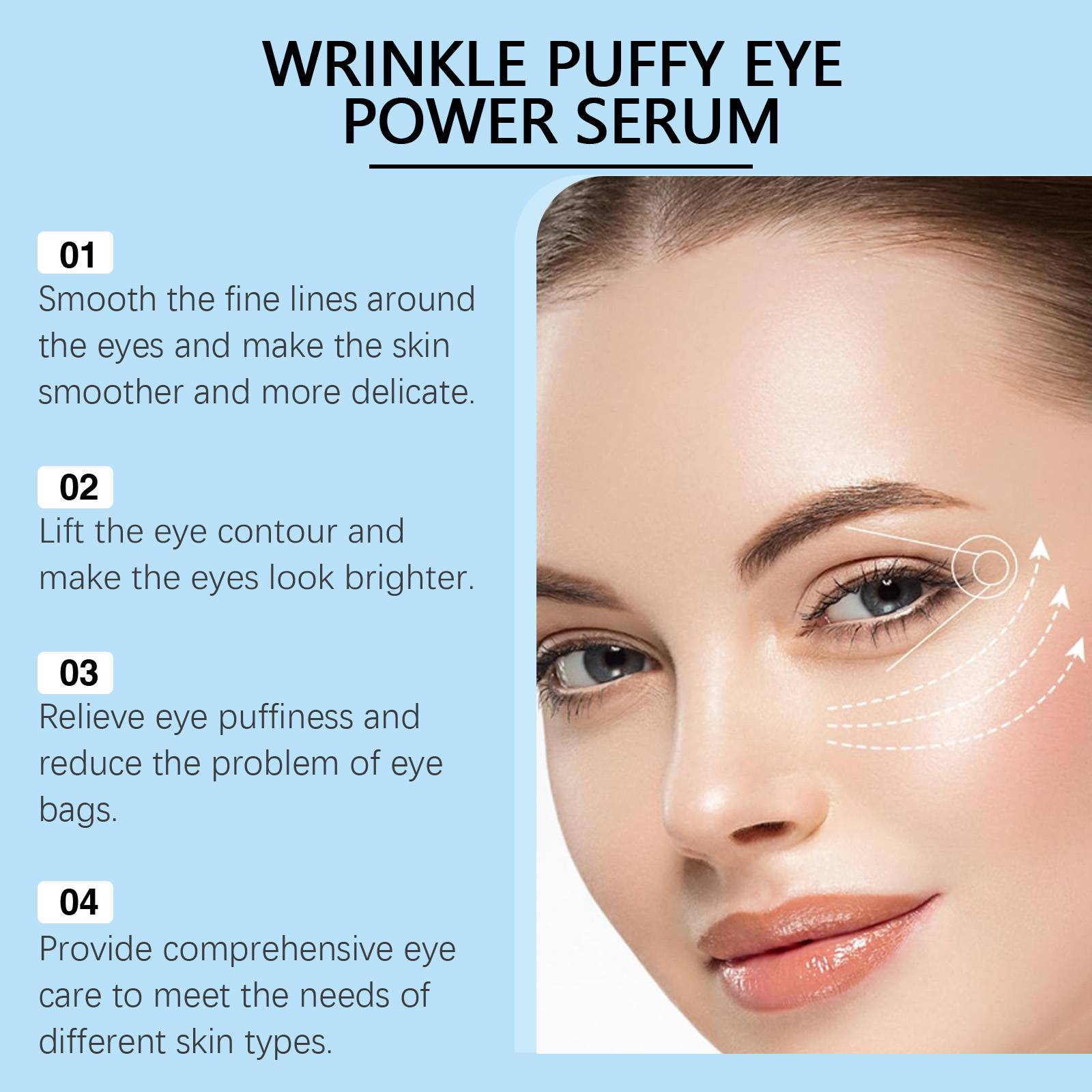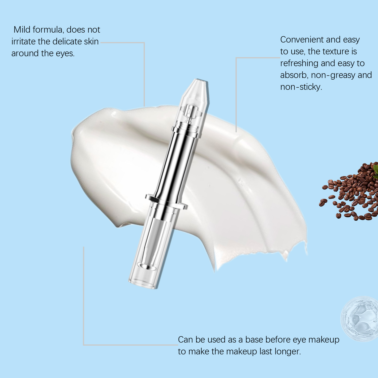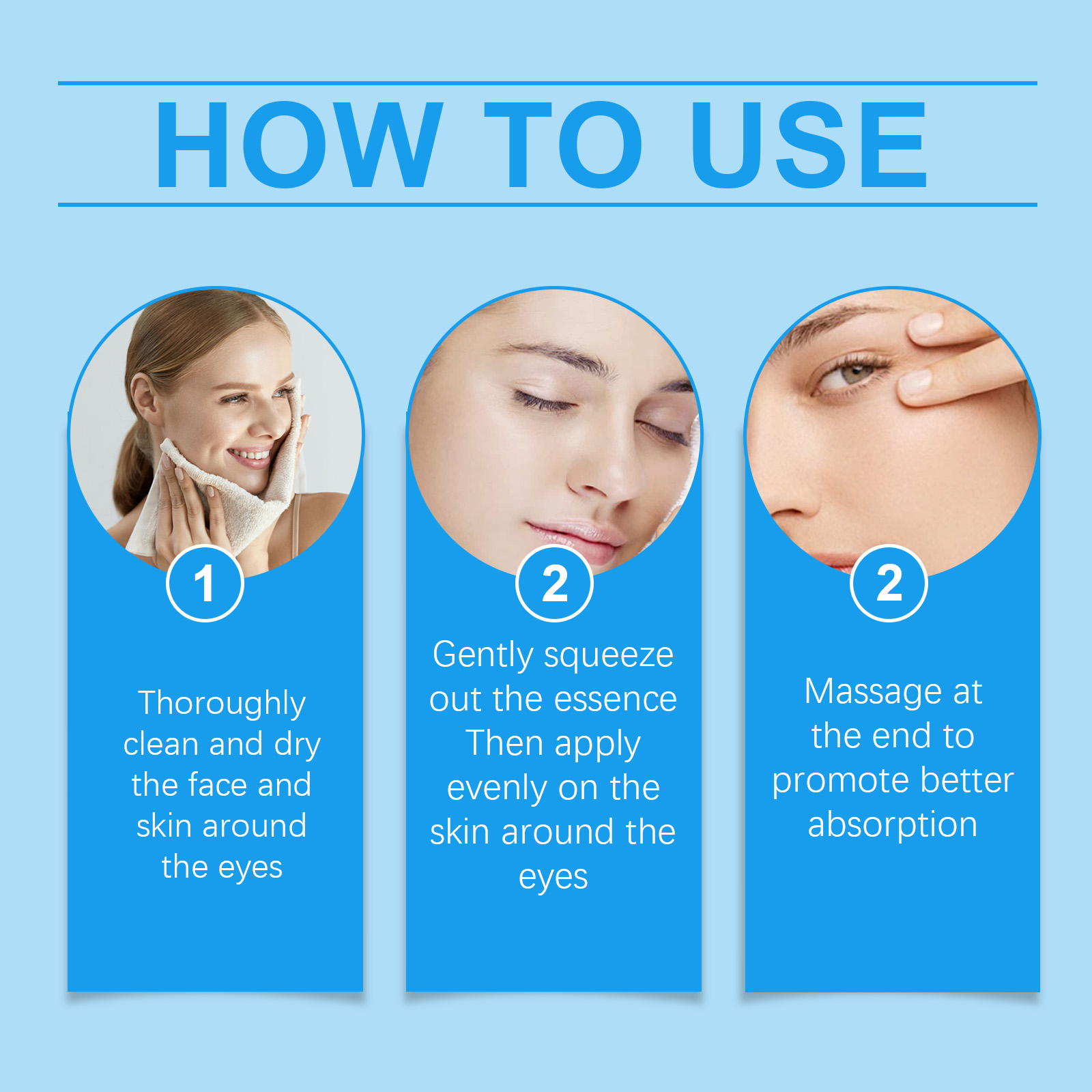 Our eye essence contains small fruit coffee seed extract and hydrolyzed collagen. The application method is very simple: thoroughly clean and dry the face and the area around the eyes, gently squeeze out the essence liquid and then evenly apply it to the area around the eyes, finally perform massage to promote better absorption. It can also enhance the elasticity of the eye area skin, and reduce eye swelling, fine lines and wrinkles.