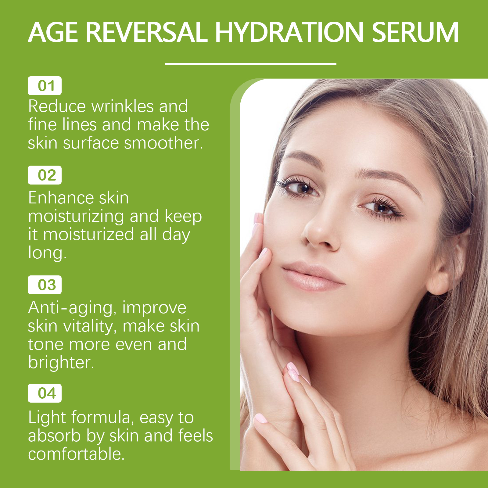 Our anti-aging hydrating serum contains glucan and trehalose. It can improve the overall structure of the skin, make the skin tighter, will not cause skin burden, and has a good long-term use effect. Its application method is very simple: clean facial skin, keep dry, apply appropriate amount of this product evenly on facial skin, massage gently with fingertips until completely absorbed. It is suitable for all skin types, especially those with wrinkles and fine lines.