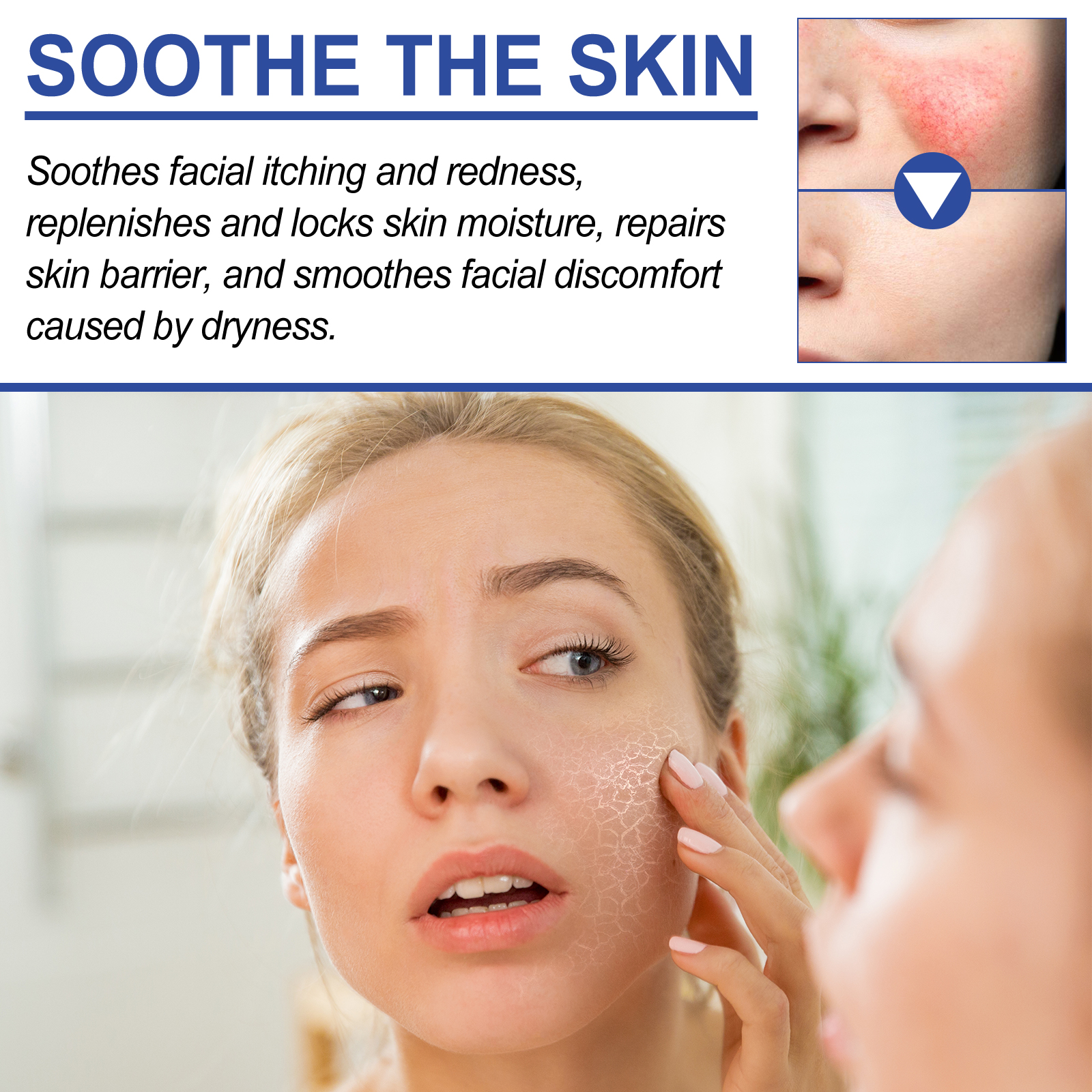 Our facial serum contains glycerin and hydroxyethyl cellulose. It can relieve facial itchiness, redness and swelling, replenish and lock skin moisture, repair skin barrier, and relieve facial discomfort caused by dryness. Its use method is very simple: after cleansing and toning, take 2-3 drops of essence evenly apply to the face skin, gently massage with your hand until absorbed. Moisturize, restore and nourish skin, reduce signs of aging, strengthen and firm skin, increase skin elasticity and reduce wrinkles.