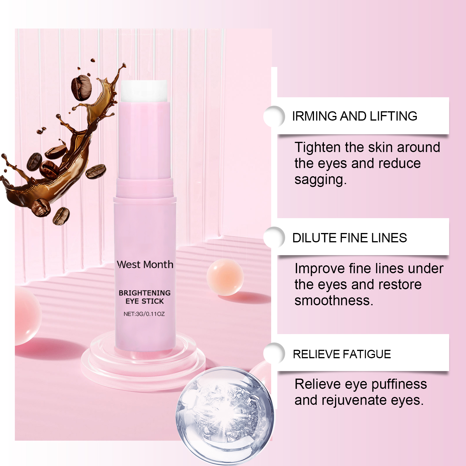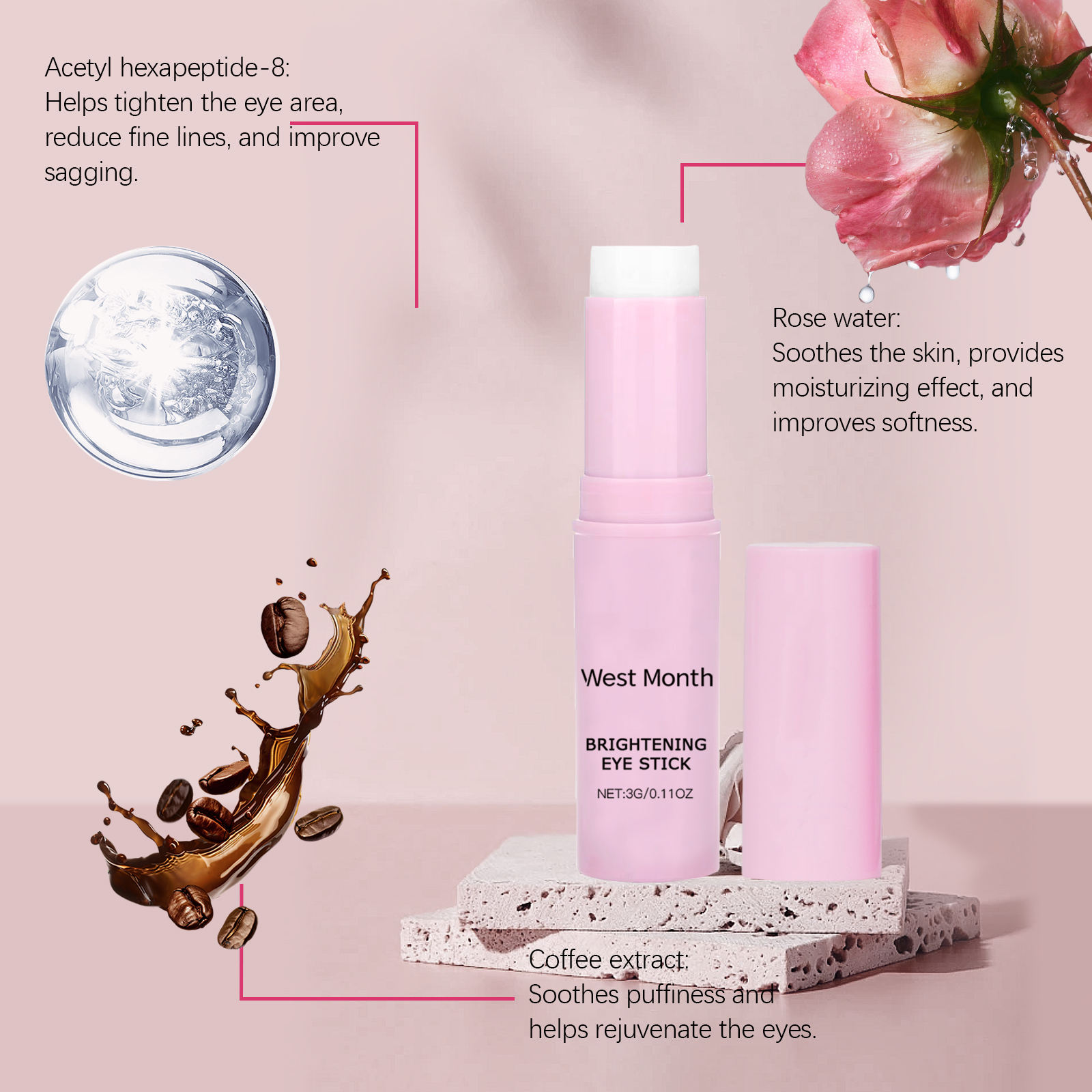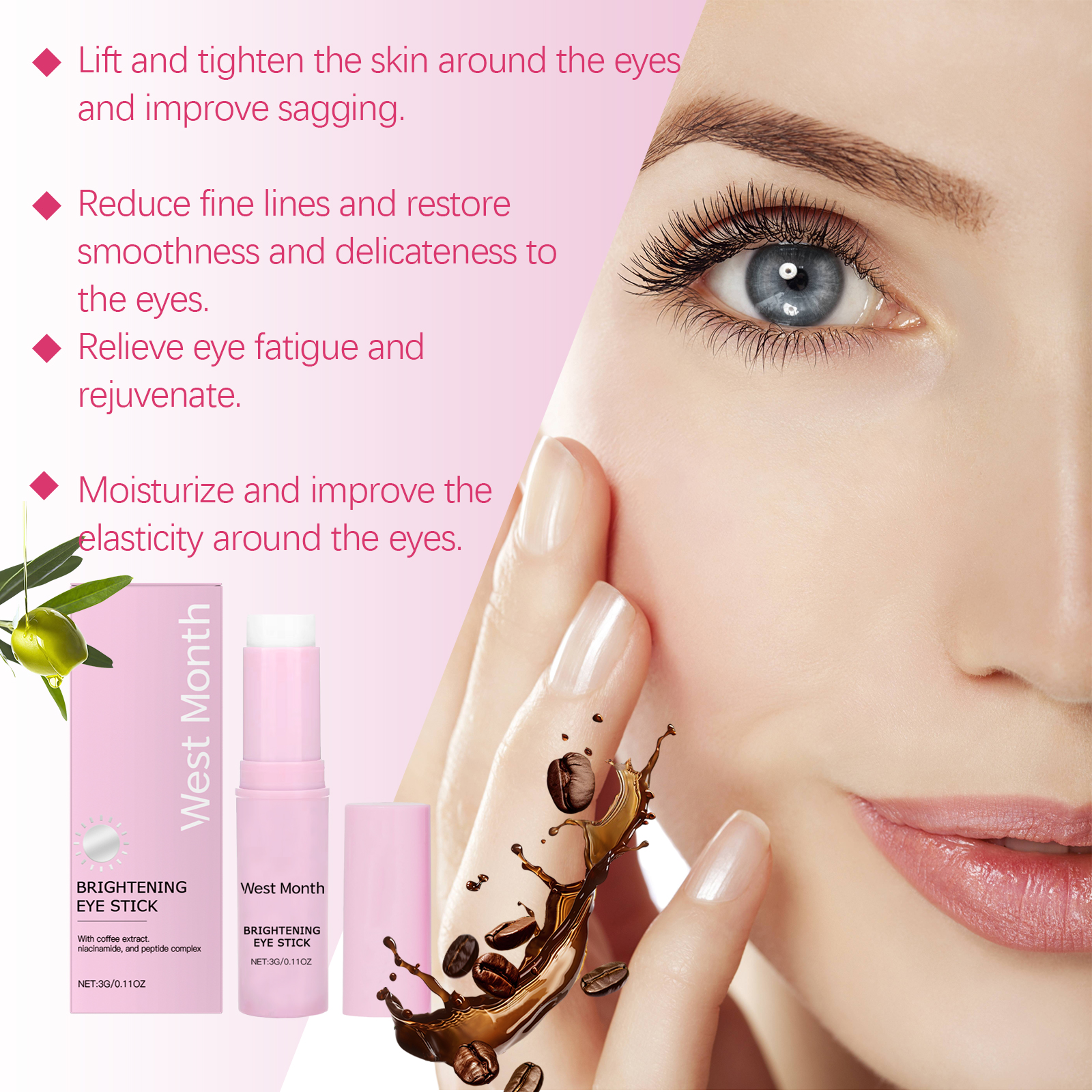 Our firming eye cream sticks contain Jojoba seed oil, coffee extract, and rose water. It can deeply moisturize the skin around the eyes and improve elasticity. Helps to improve dark circles and brightens the skin around the eyes. Its application method is very simple: 1. Clean the skin around the eyes and gently dry it. 2. Gently apply the cream to the entire eye area. 3. Gently pat around the eyes to promote absorption. Long-lasting moisture prevents dryness around the eyes and keeps skin soft. Easy to roll design, easy to use, suitable for daily skin care.