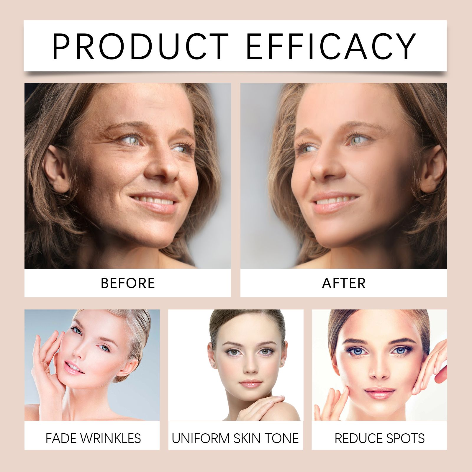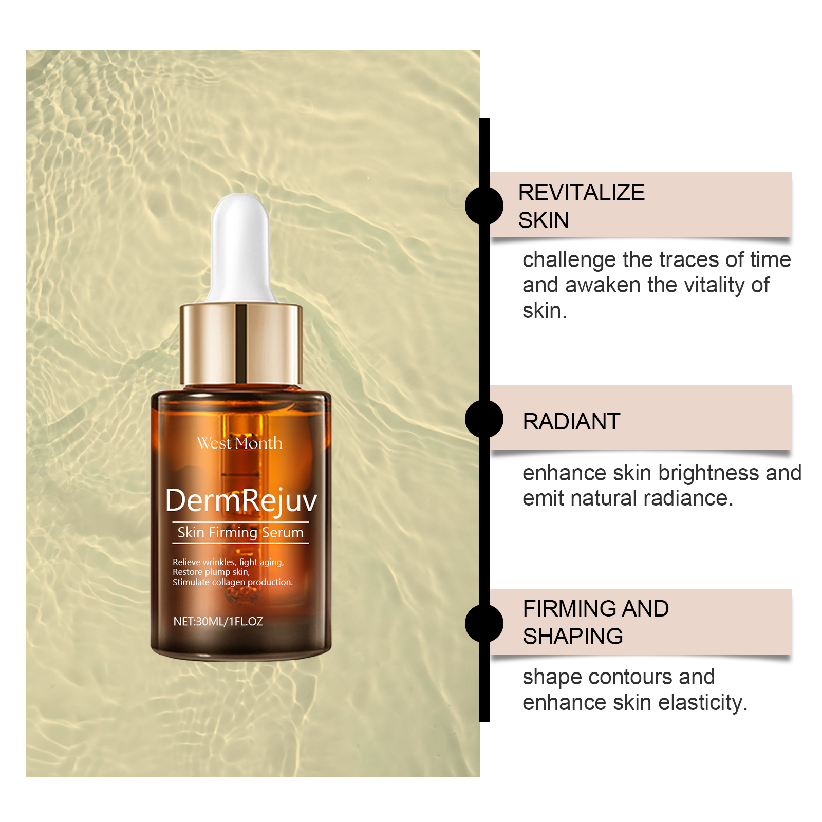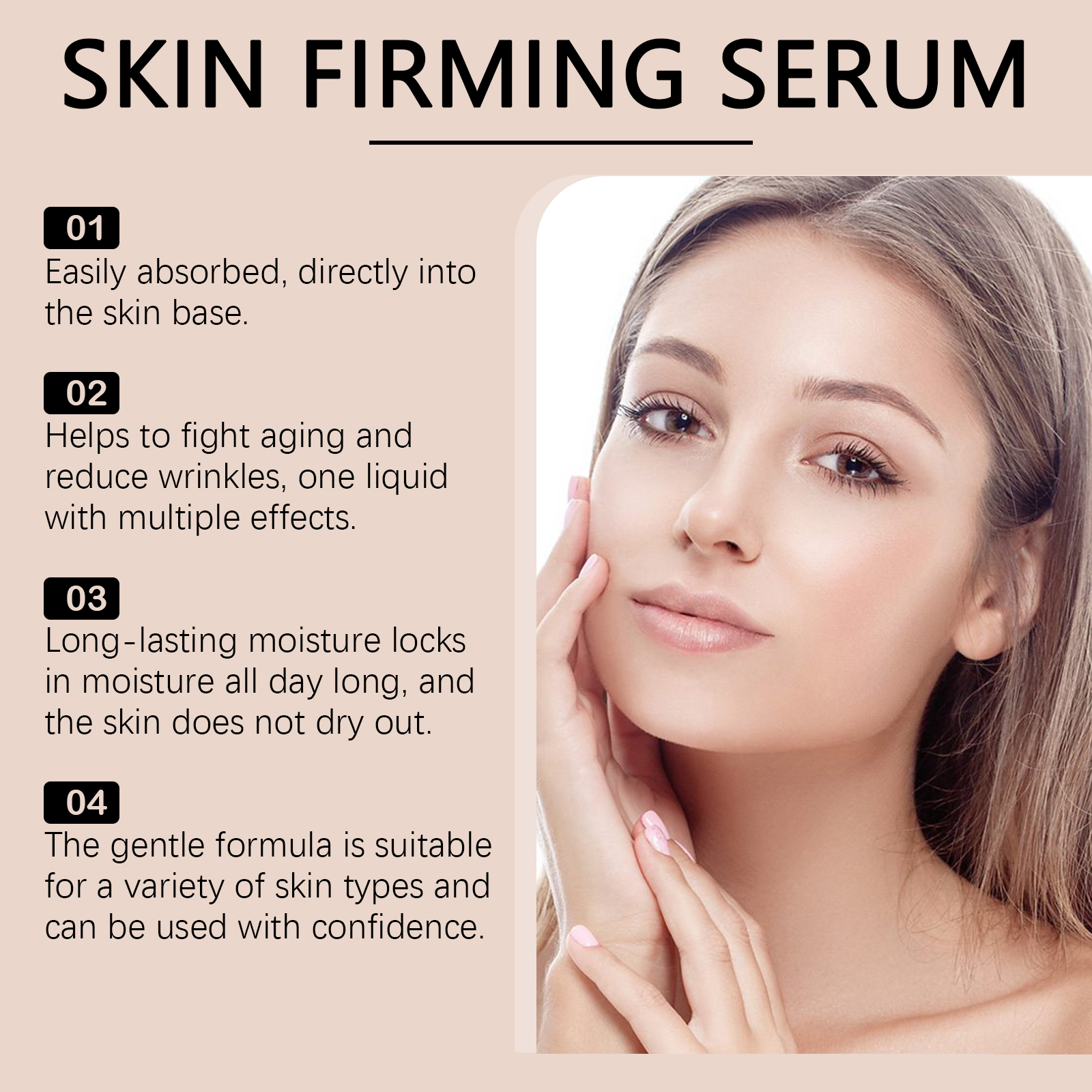 Our skin firming serum contains chlorella extract, tripeptide-1. It strengthens the connection and enhances skin firmness. Long-lasting moisturizing, all-day moisturizing treatment. The way to use it is very simple: clean your face and body to keep dry, take an appropriate amount of essence evenly apply to the face, neck, legs, abdomen, arms and other skin, and then gently massage in circles to promote absorption. And can help fight aging, reduce wrinkles, a liquid multi-effect. Promotes renewal and accelerates cell regeneration.