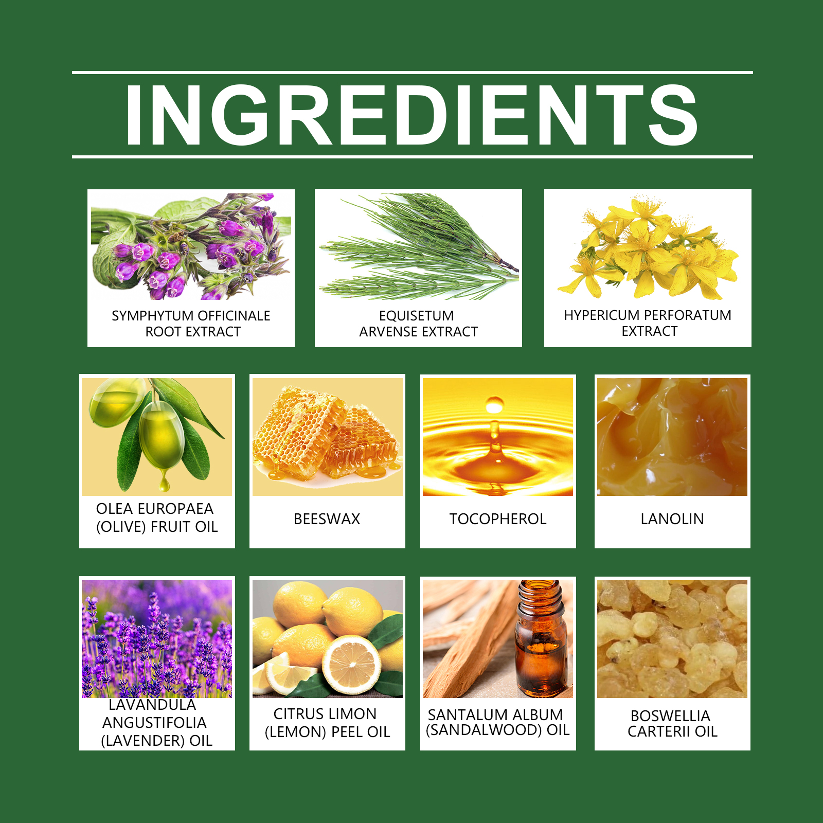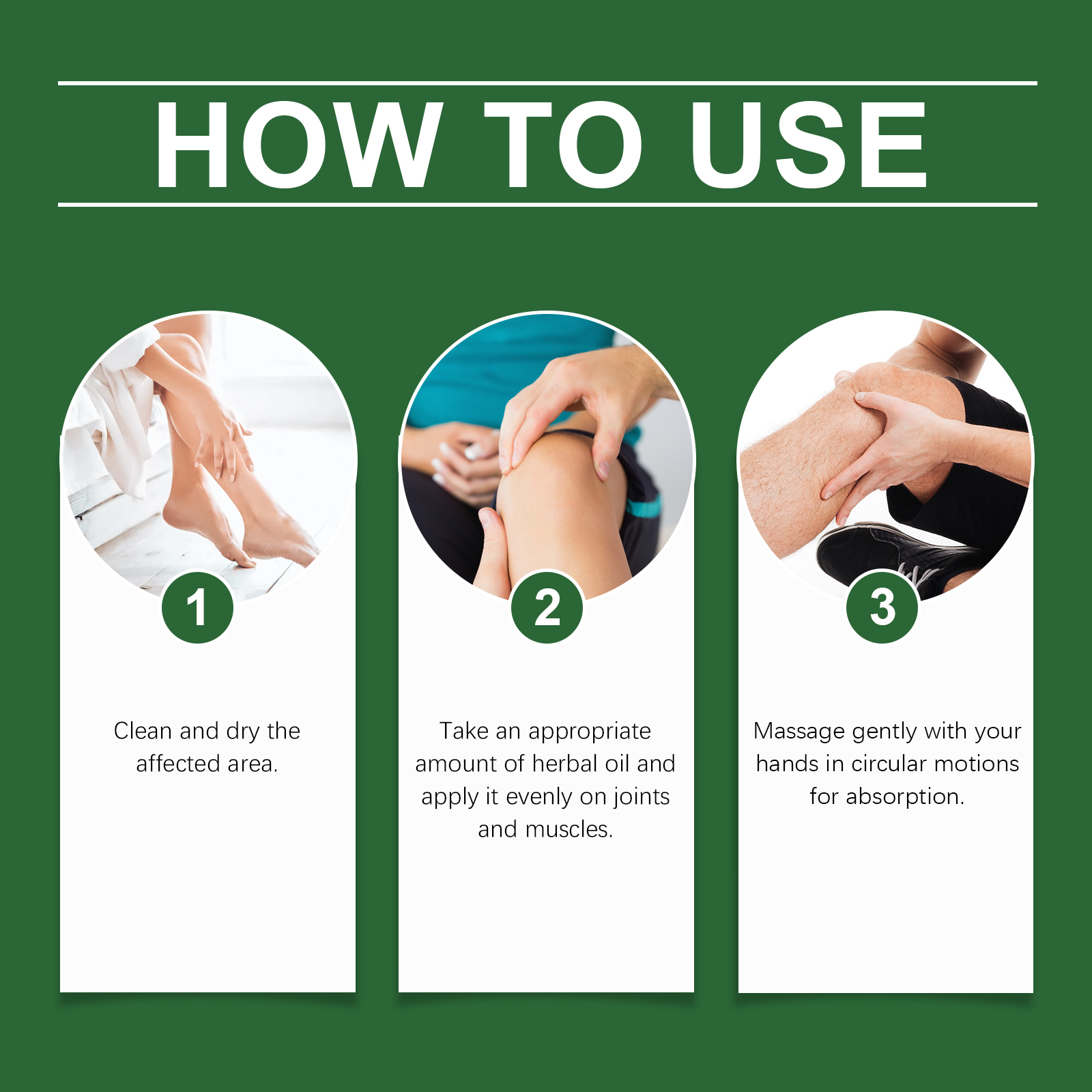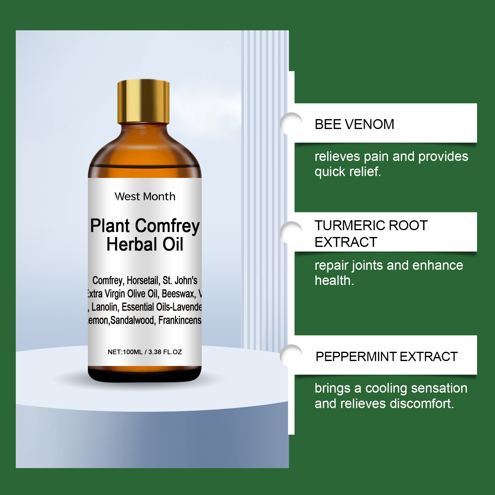Our herbal comfrey oil contains sandalwood oil and frankincense oil. It can improve blood circulation in the joint area, speed up rehabilitation, and improve joint flexibility and mobility. Its application method is very simple: clean and dry the affected area, take an appropriate amount of herbal oil, evenly apply it to the joints and muscles, and gently massage it with the hand in a circular motion to absorb it. And can bring cool feeling, relieve discomfort.