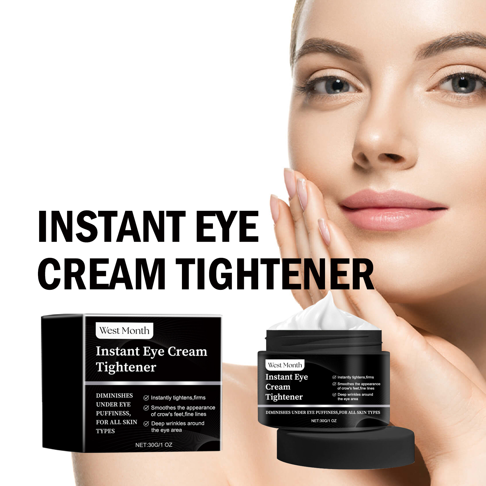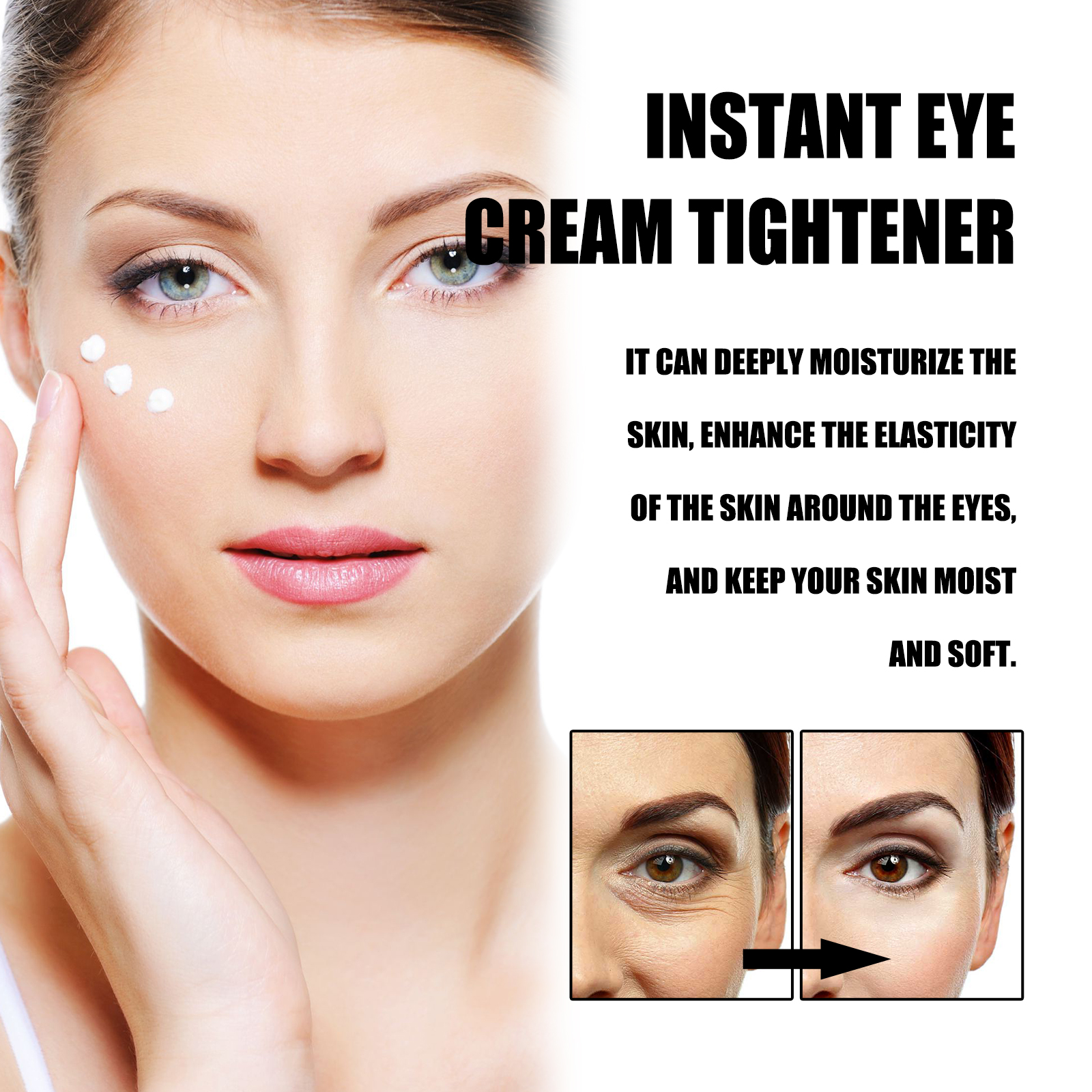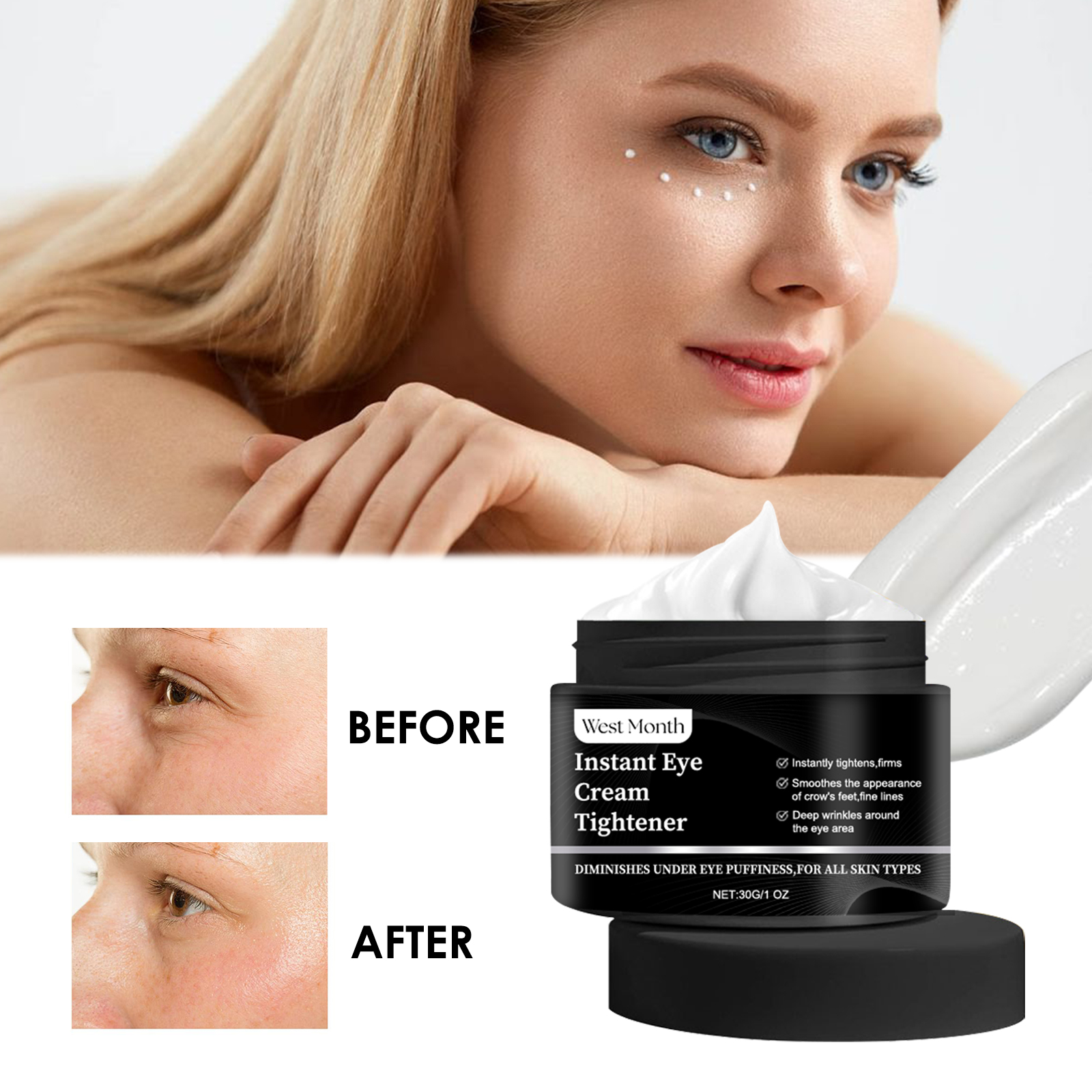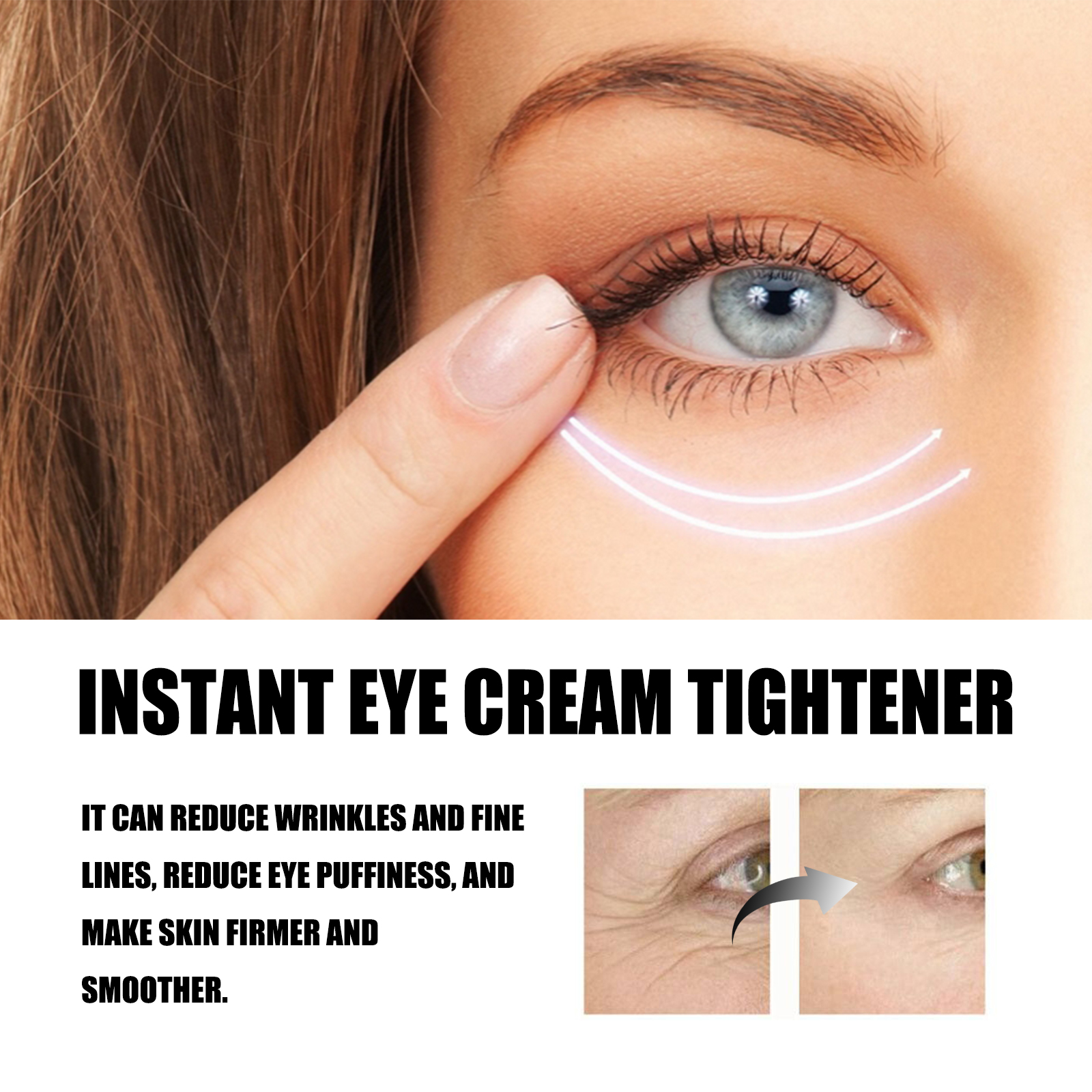Our Instant Eye Cream Tightener contains hyaluronic acid, squalane and vitamin C. It can effectively lighten dark circles, reduce the appearance of bags under the eyes, make the eye skin brighter, reduce wrinkles and fine lines, reduce eye puffiness, and make the skin firmer and smoother. Its application is simple: clean and dry the face, apply a small amount of eye cream to the skin around the eyes, and gently massage until absorbed. It can deeply moisturize the skin, enhance the elasticity of the skin around the eyes, and keep your skin hydrated and soft.