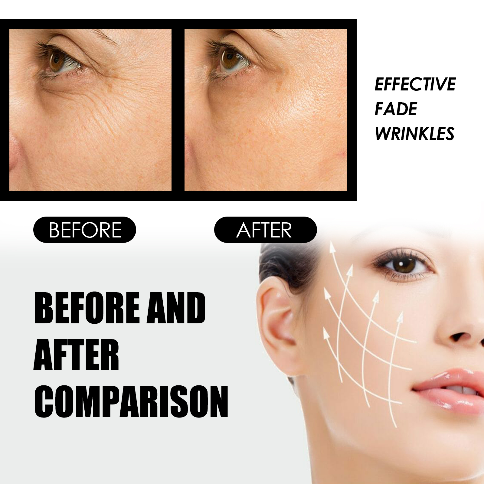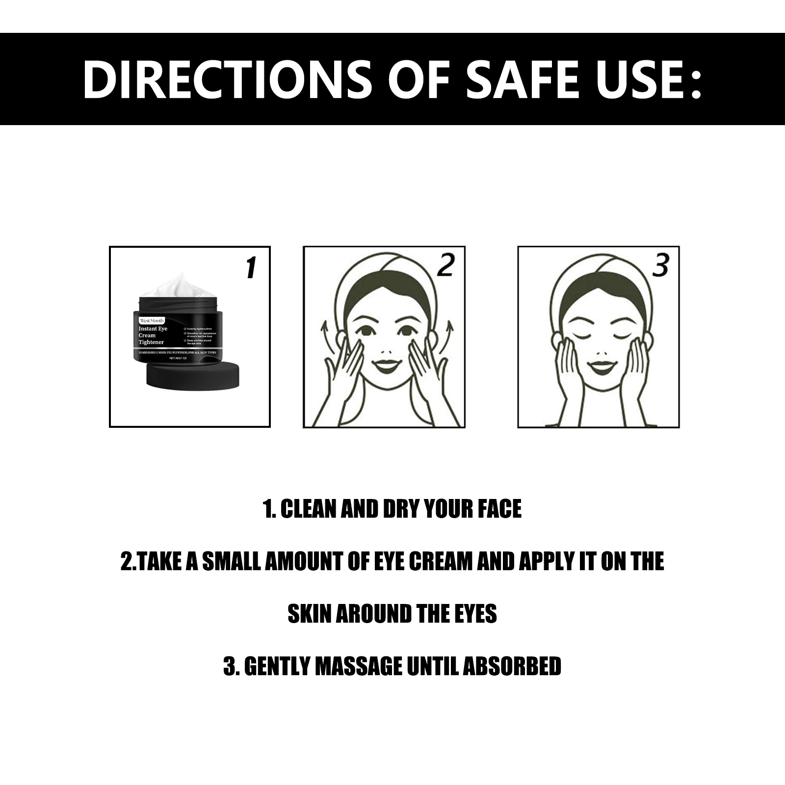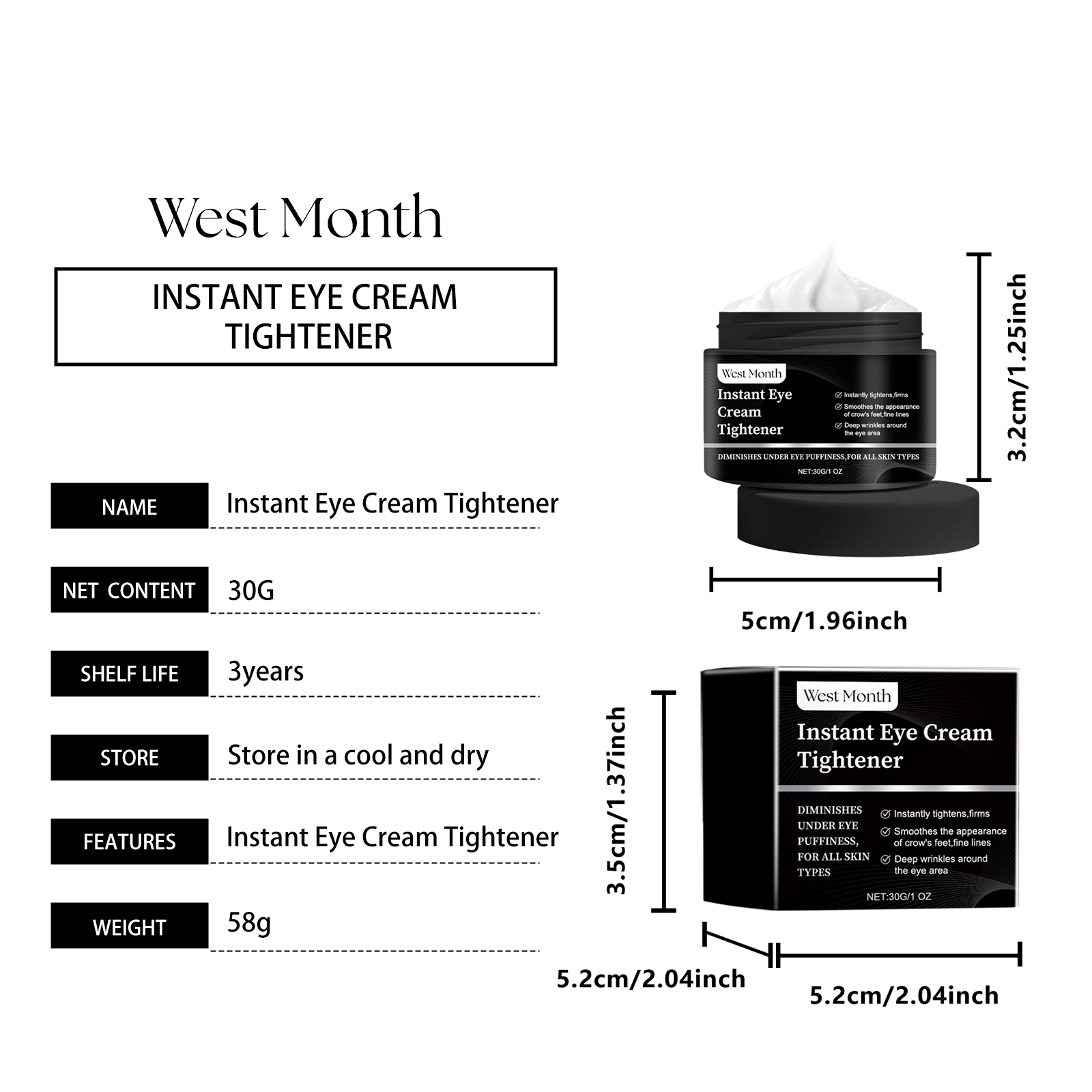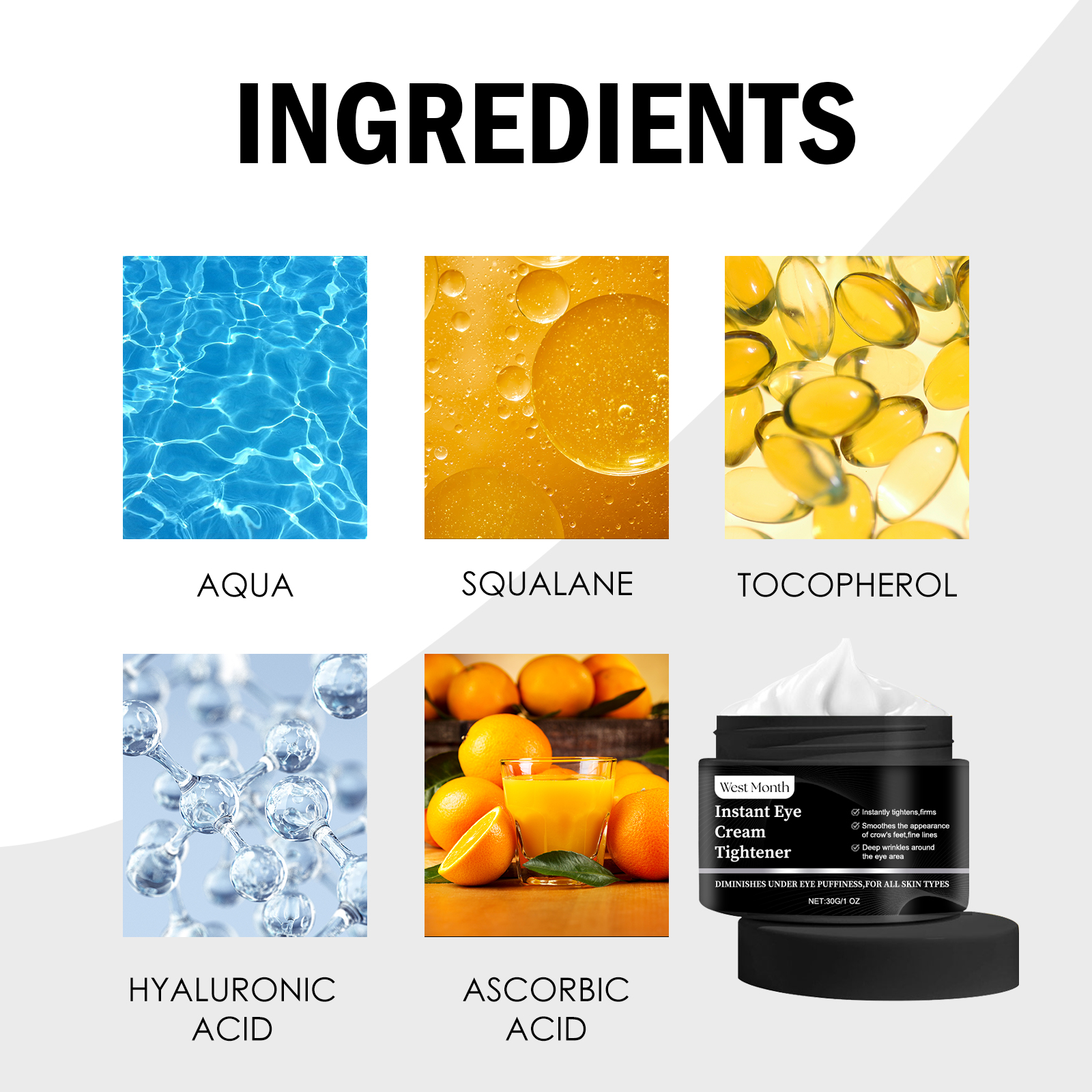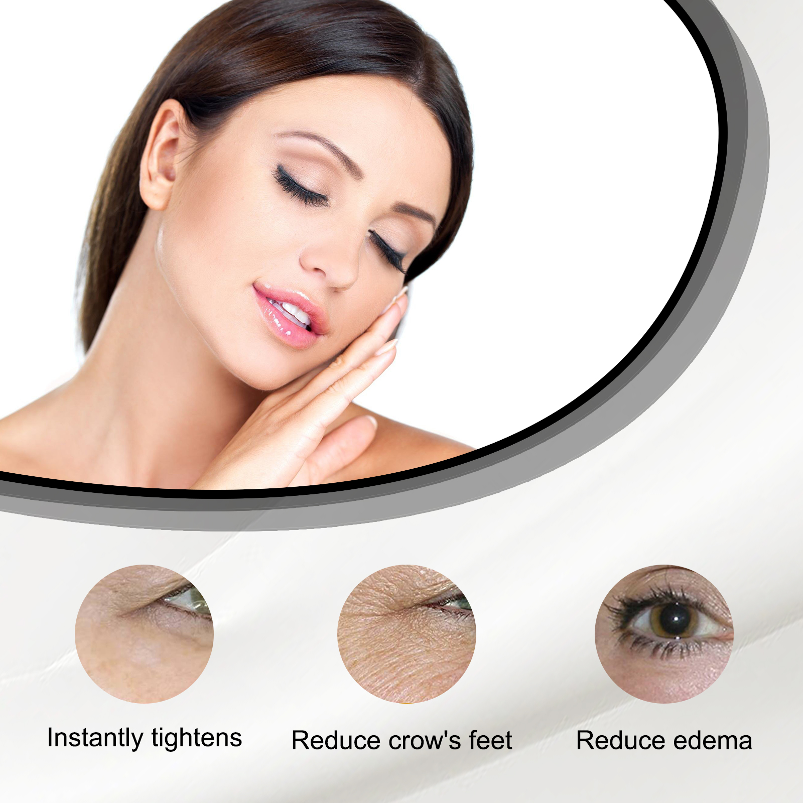 Our Instant Eye Cream Tightener contains hyaluronic acid, squalane and vitamin C. It can effectively lighten dark circles, reduce the appearance of bags under the eyes, make the eye skin brighter, reduce wrinkles and fine lines, reduce eye puffiness, and make the skin firmer and smoother. Its application is simple: clean and dry the face, apply a small amount of eye cream to the skin around the eyes, and gently massage until absorbed. It can deeply moisturize the skin, enhance the elasticity of the skin around the eyes, and keep your skin hydrated and soft.