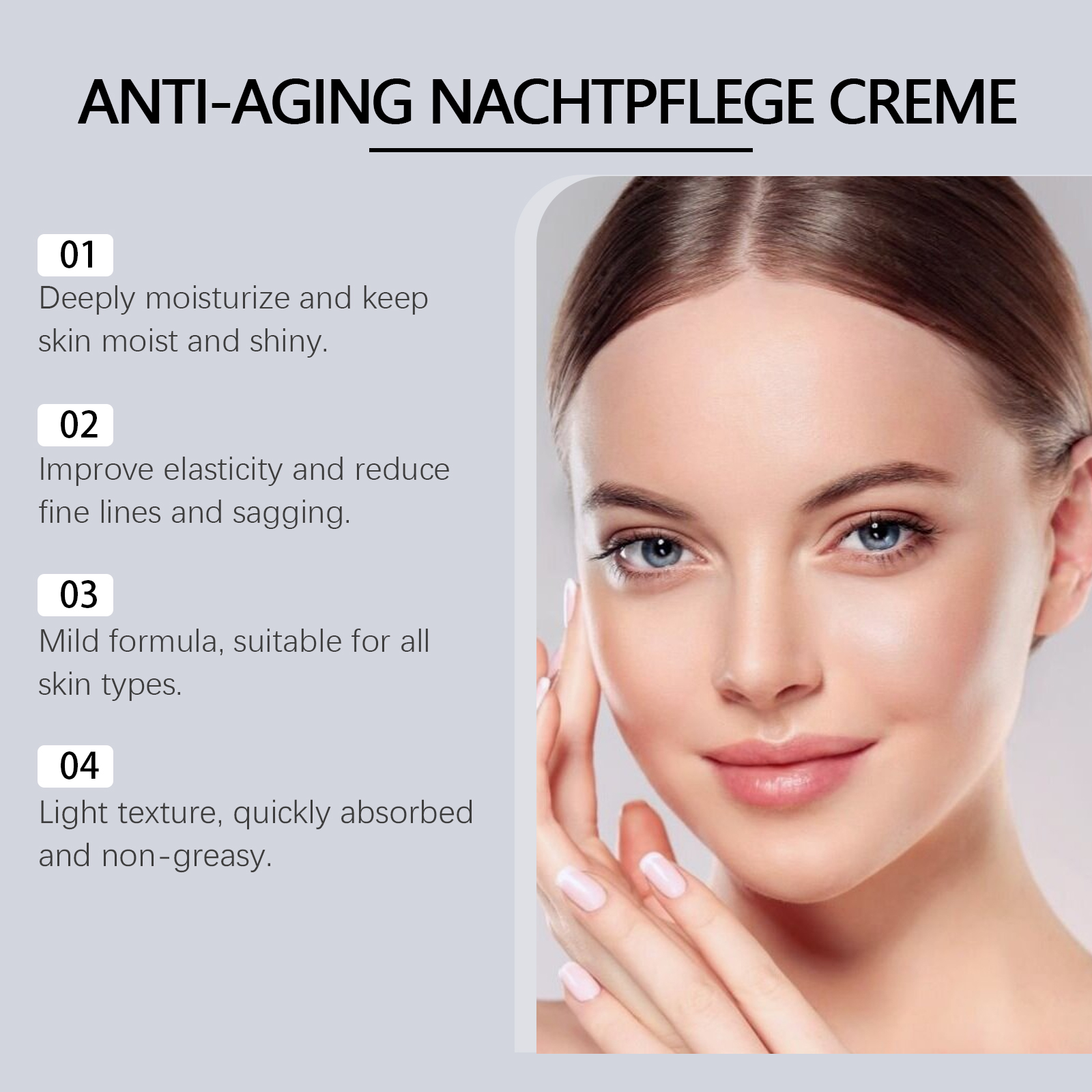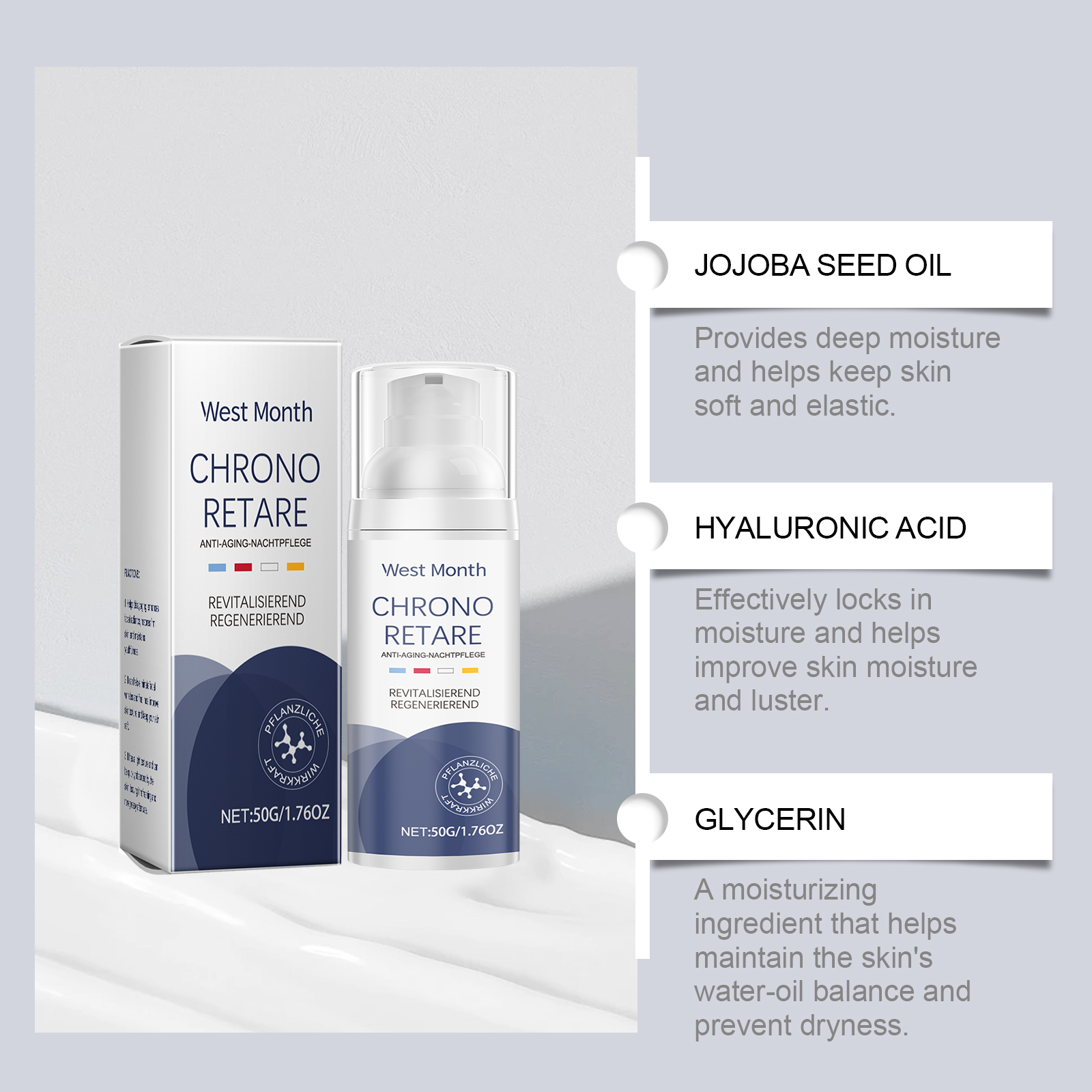 Our anti-aging firming cream contains glycerin, vitamin E (tocopherol). It effectively locks in moisture, providing lasting moisture and preventing dry skin. Its application method is very simple: clean the facial skin, keep the skin dry, apply appropriate amount of this product evenly on the facial skin, gently massage until completely absorbed. And light texture, absorption fast, not greasy.