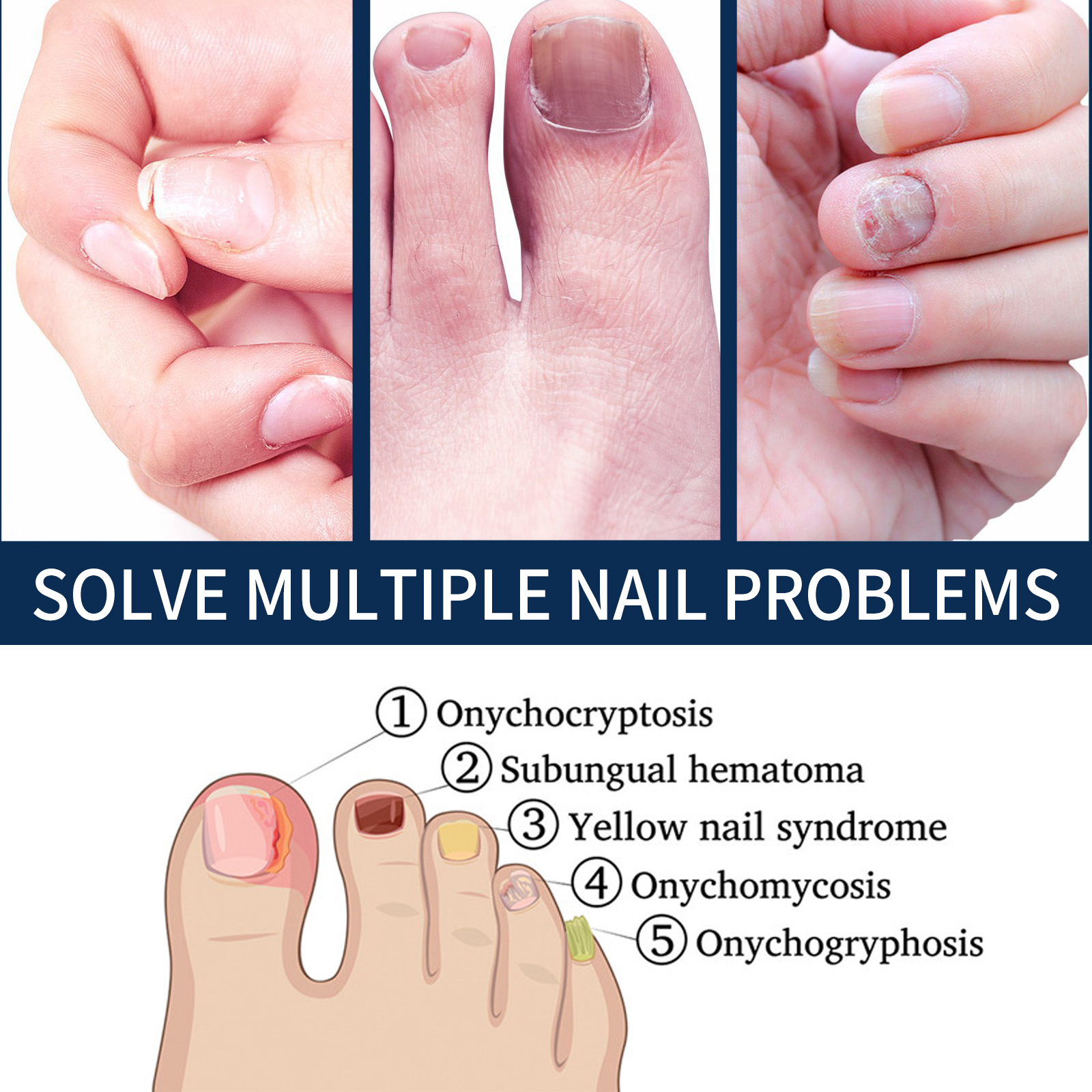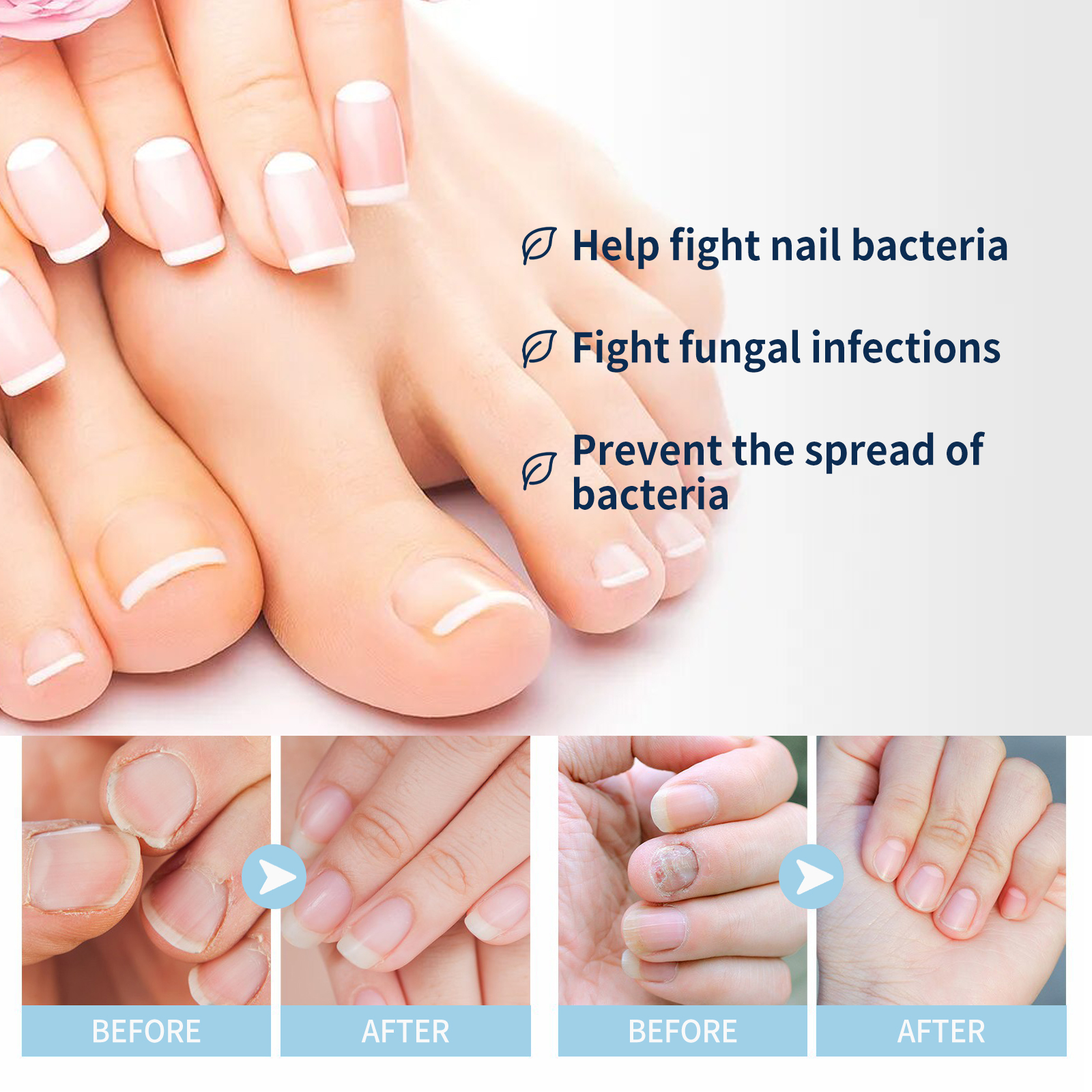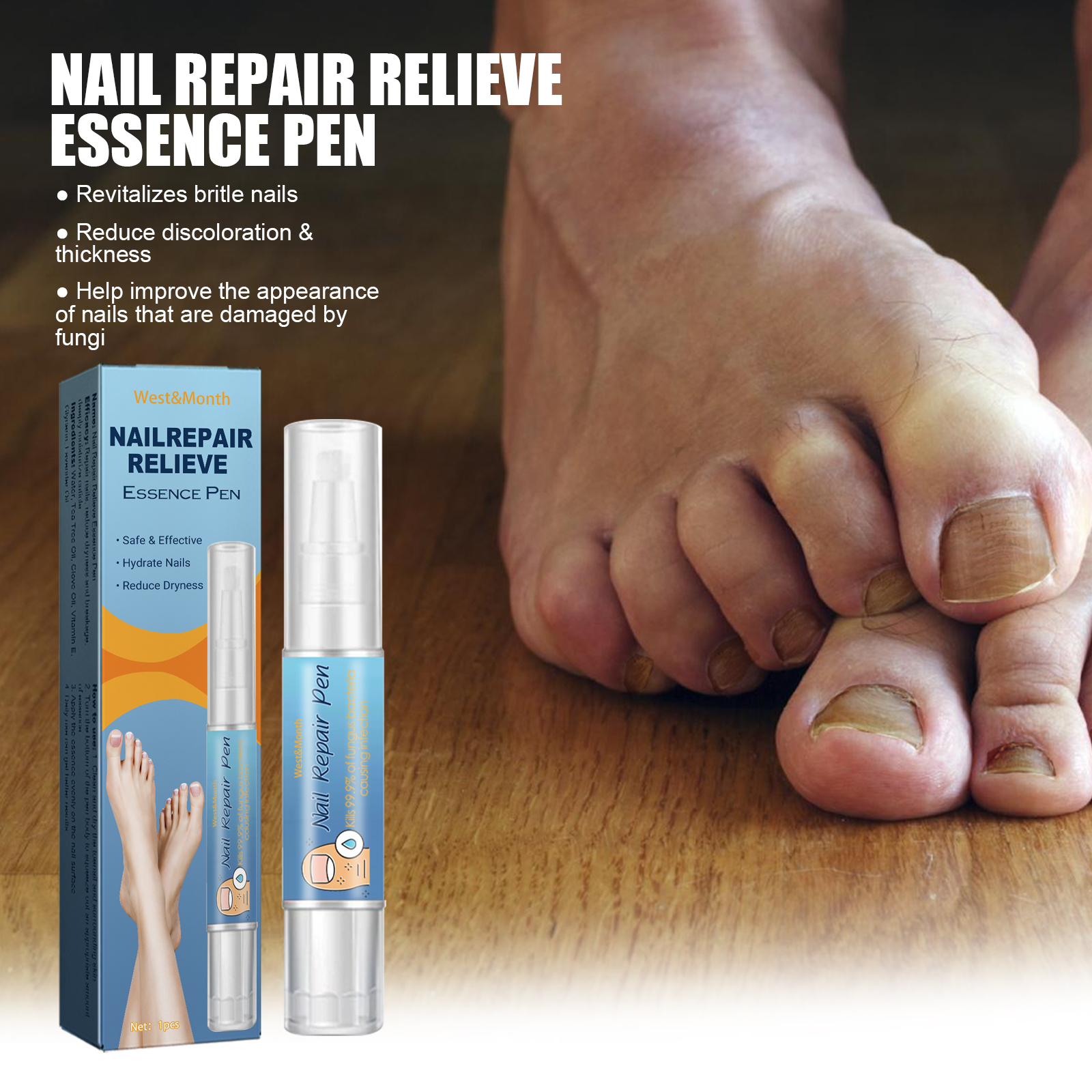 Our Nail Repair Relieve Essence Pen contain tea tree oil, clove oil and vitamin E. It can repair damaged nails, inhibit fungal growth, prevent the spread of bacteria, normalize nail thickness, and promote nail regeneration. Its use method is very simple: clean and dry the toenails, turn the bottom of the pen, squeeze out the right amount of essence evenly applied to the nail surface, daily use can get better results. Helps reduce nail discoloration, correct deformation, moisturize nails, trim nails to normal shape, and restore nail shine.