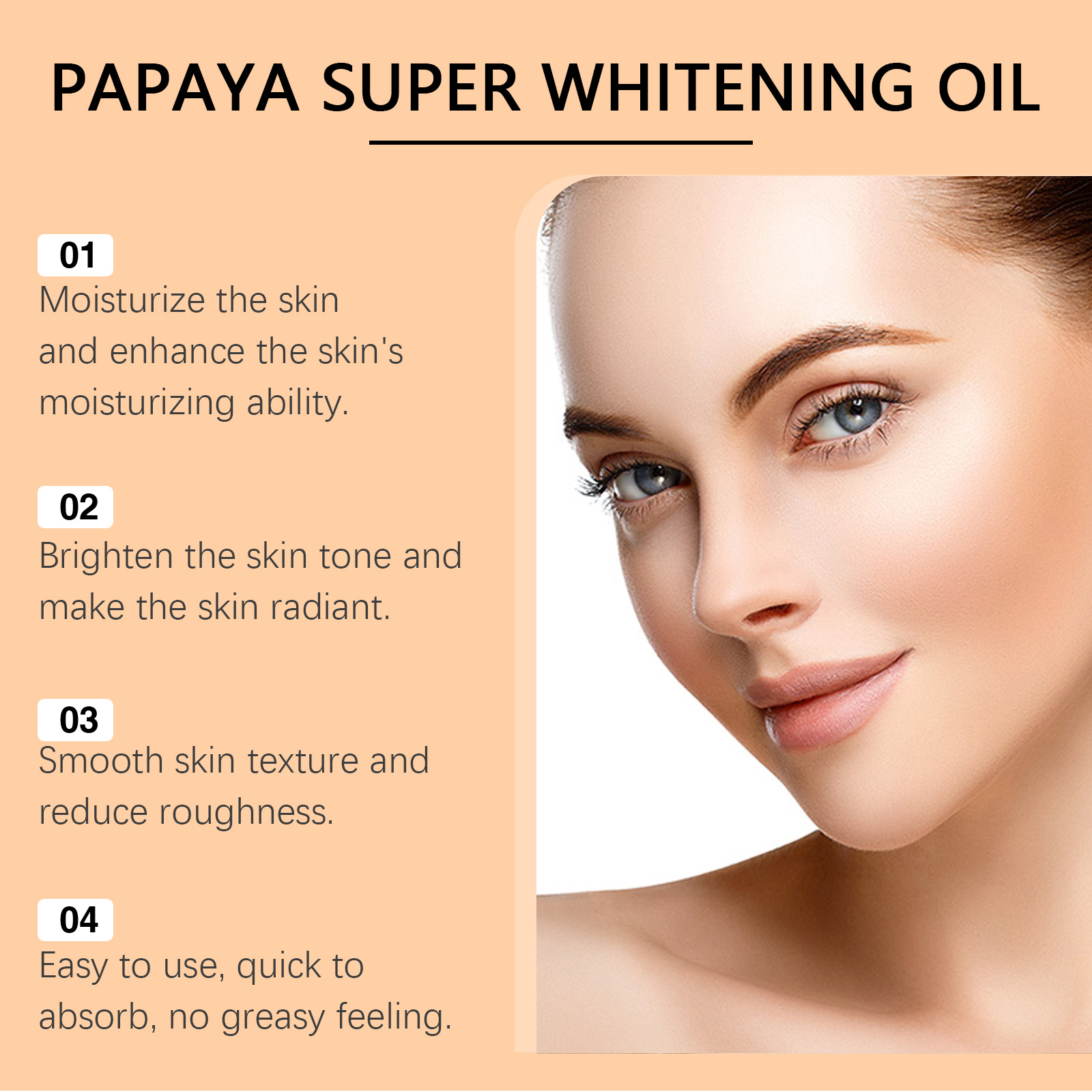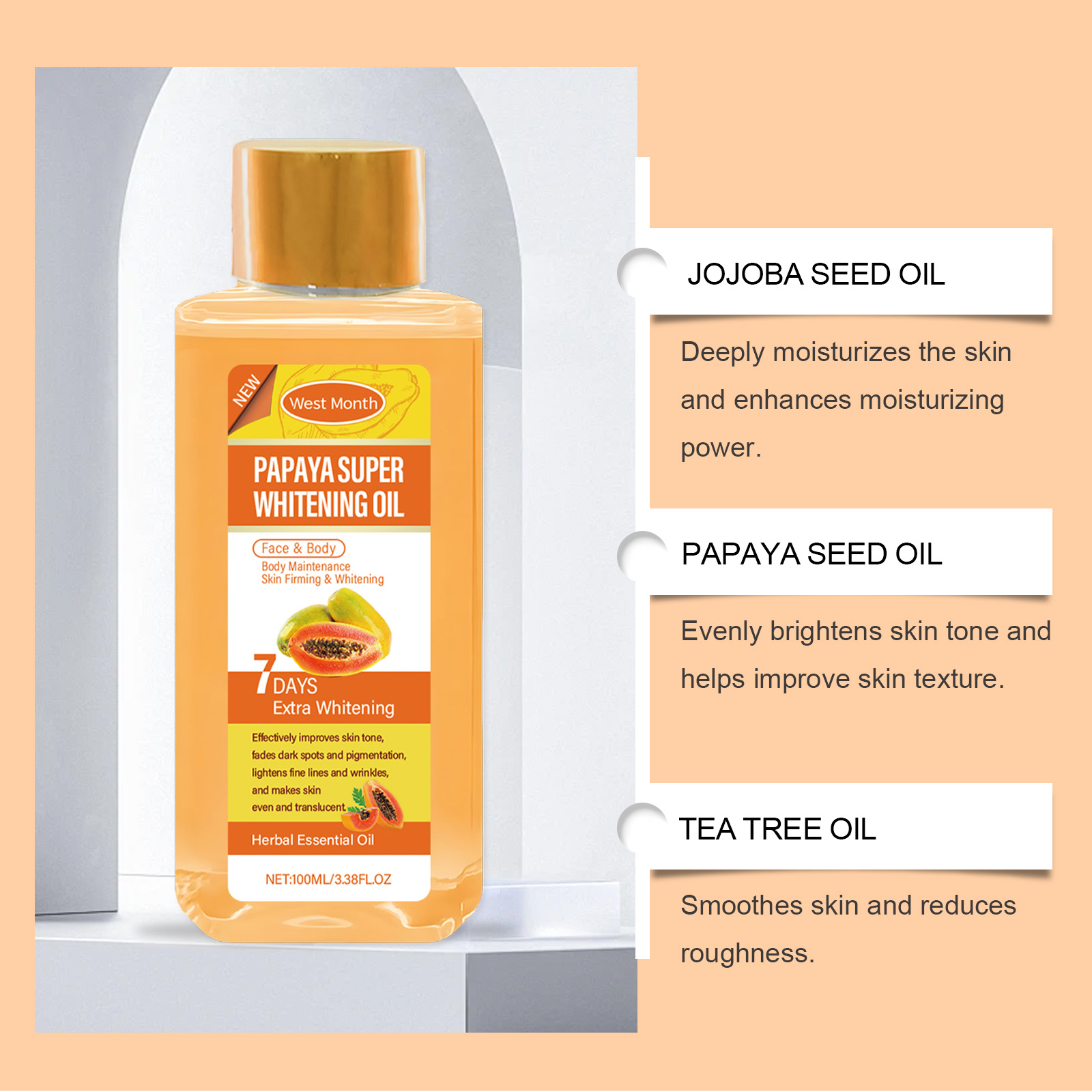 Our papaya body whitening oil contains vitamin C, hyaluronic acid. It provides long-lasting moisture and improves dryness and roughness. Its use method is very simple: clean the skin, keep the skin dry, take the right amount of essential oil evenly apply to the parts that need care, such as face, shoulders, arms, thighs, etc. Massage gently to promote absorption. And can lighten the skin, make the skin healthier, glow.