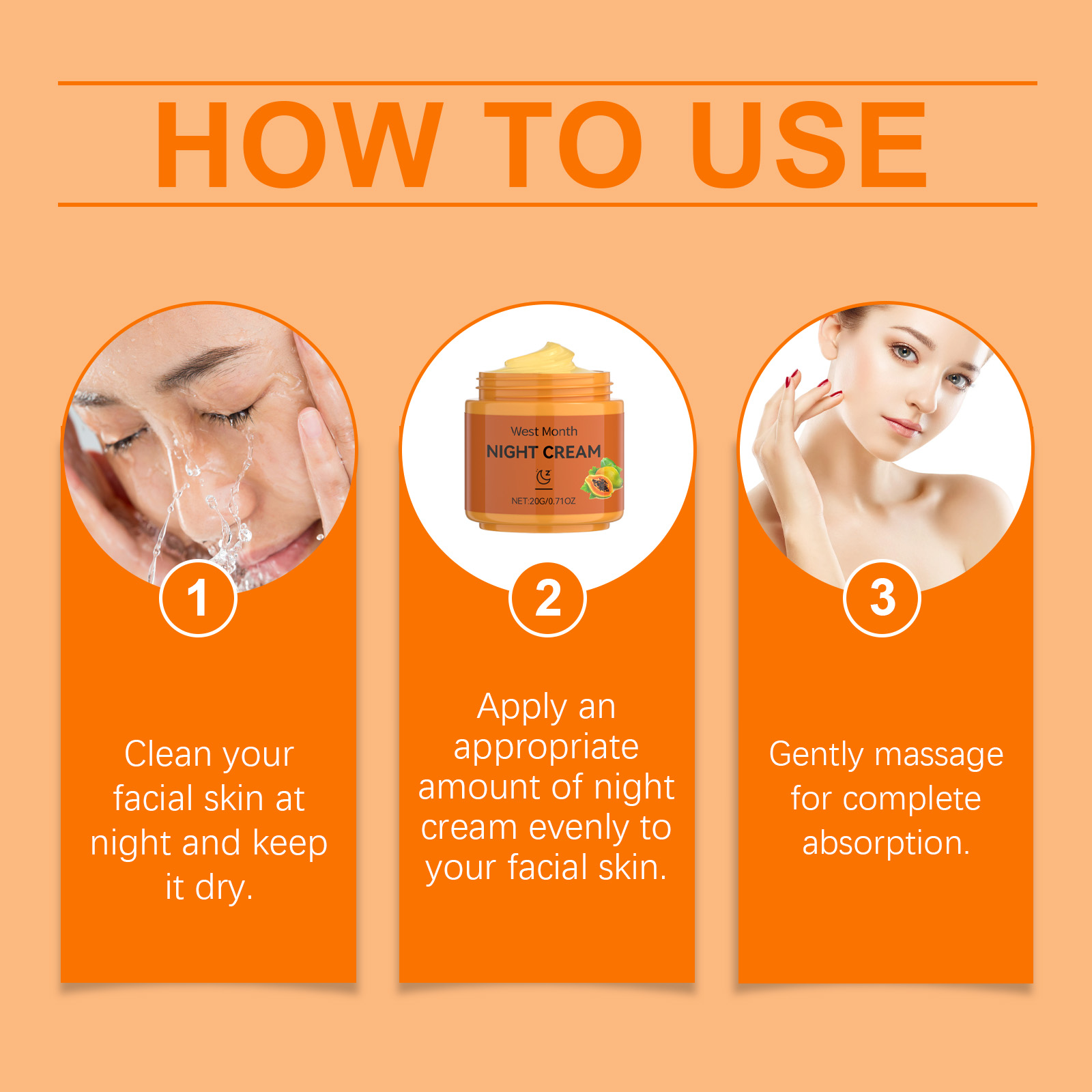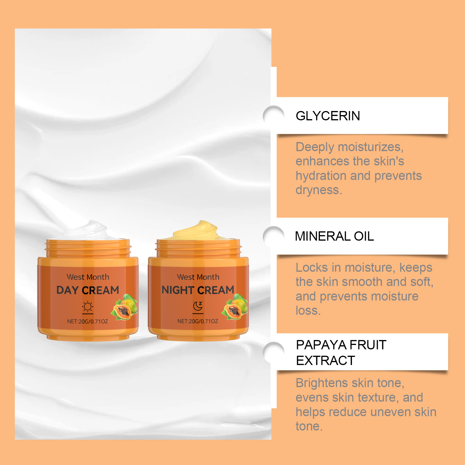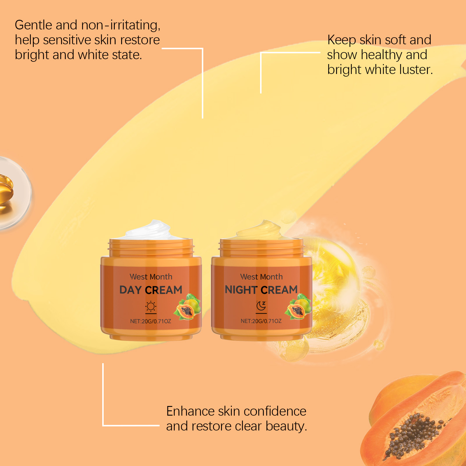 Our papaya facial cream contains day cream: papaya fruit extract, ascorbic acid (vitamin C); Night cream: papaya fruit extract, niacinamide. It can help even out the complexion and make the skin glow. Long-term use helps to reduce spots and return the skin to an even and bright state. Its application is simple: clean your face in the morning and keep it dry. Take a suitable amount of day cream and apply it evenly to your face. Massage gently to fully absorb. Cleanse your face at night and keep it dry. Apply appropriate amount of night cream to face evenly. Massage gently to fully absorb. It can also make your skin look brighter, more transparent and more radiant.