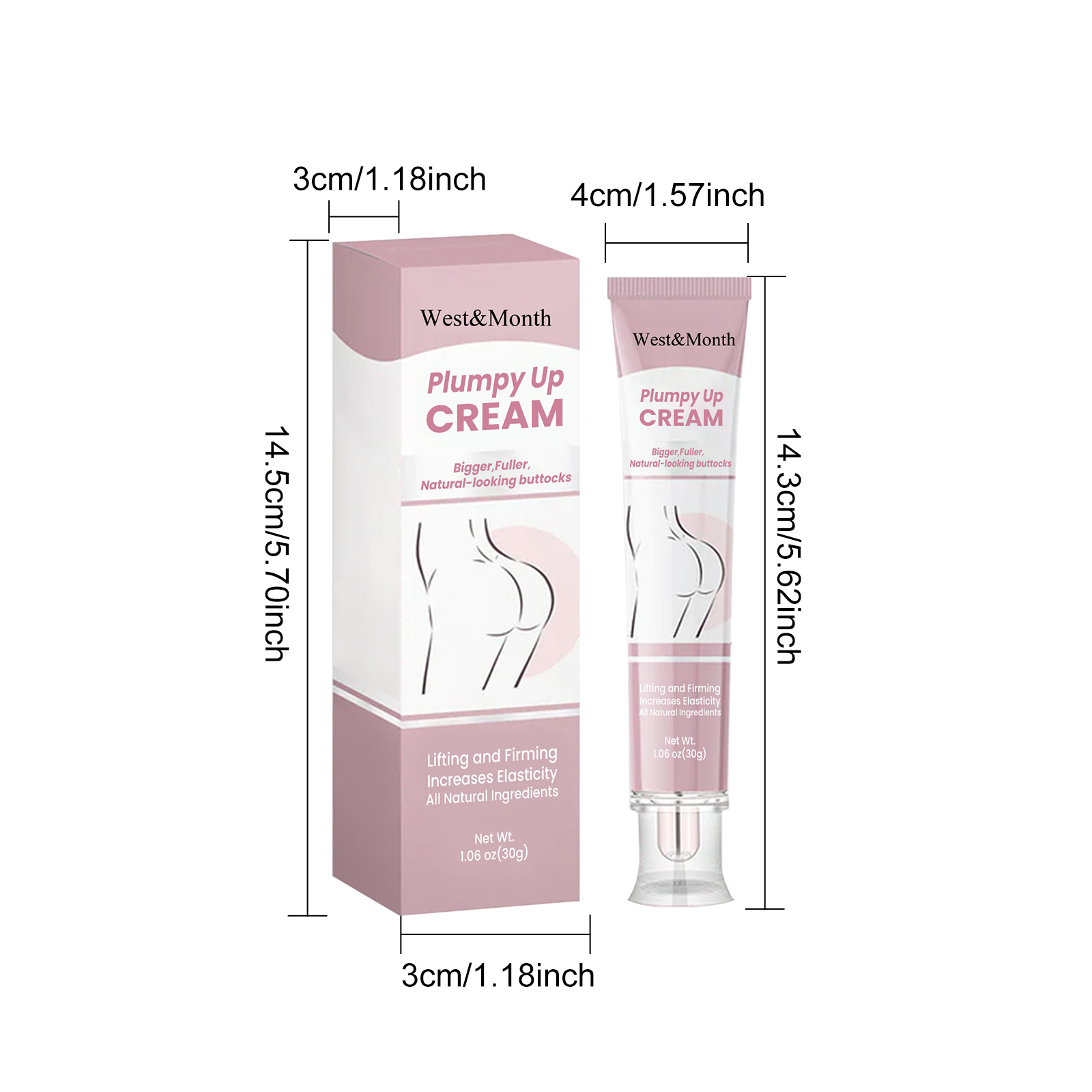 Our Plumpy Up Cream contains maca root extract, shea butter, hydrolyzed collagen. It can stimulates the metabolism of the skin and promotes the development of buttocks muscles, thereby making the buttocks and buttocks firmer and fuller. Its application method is very simple: Clean and dry buttock skin, take an appropriate amount of cream and apply it evenly on the buttocks, massage gently in circular motions with your hands until absorbed. Firm and plump hips, enhance attractiveness, and make the body more perfect.