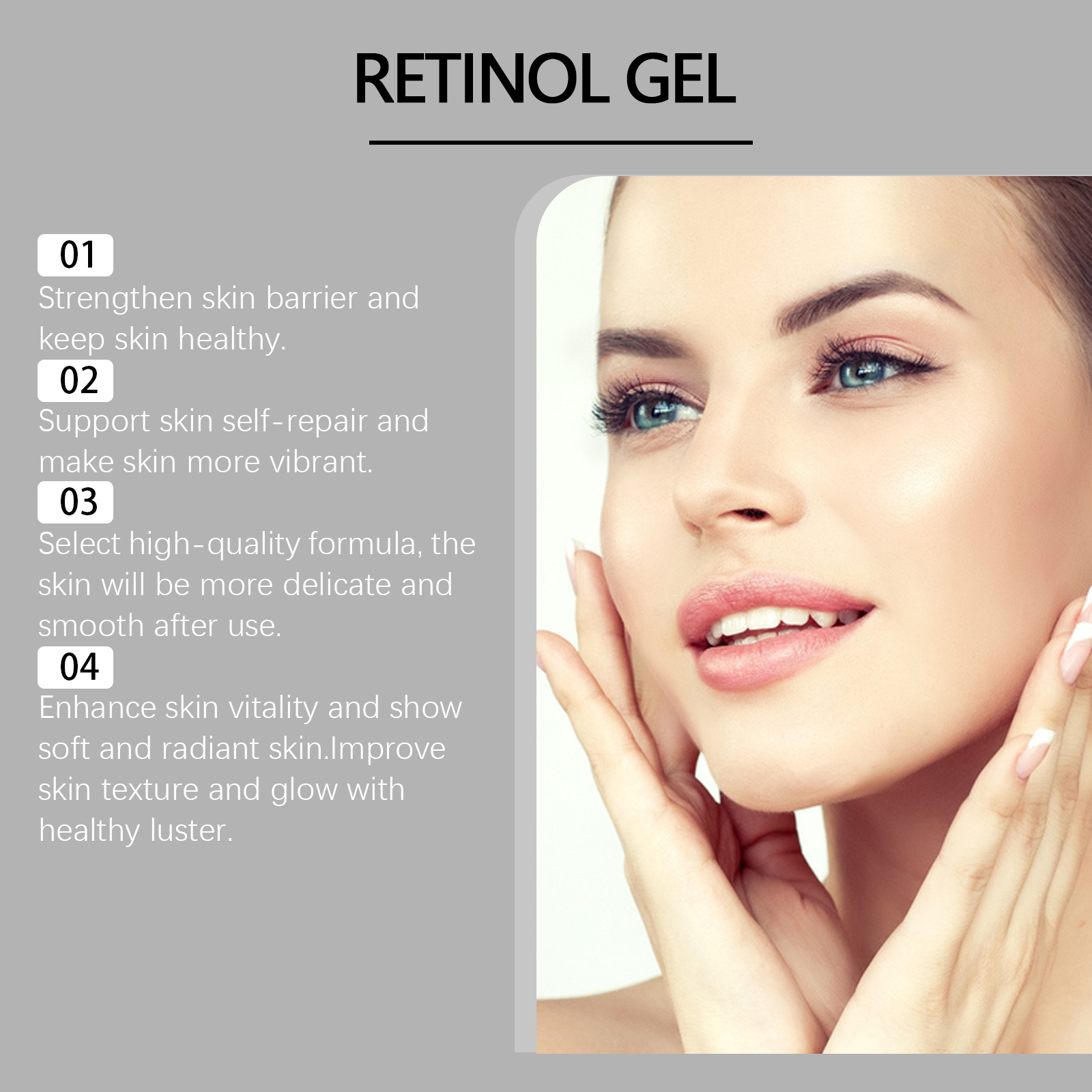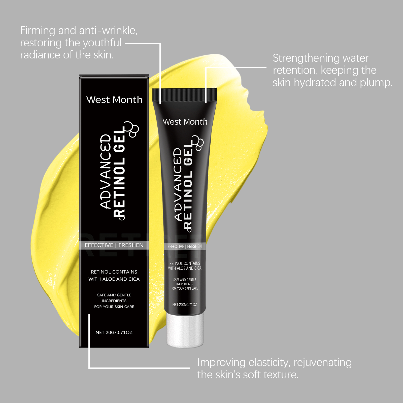 Our retinol cream contains glycerin and retinol. It reduces sagging, enhances facial contours and tightens skin. Fade fine lines, keep skin smooth and youthful. Its application is simple: clean your face and keep it dry. Apply appropriate amount of the product evenly on the face and gently massage until absorbed. And can deeply moisturize the skin, retain moisture, prevent dry rough.