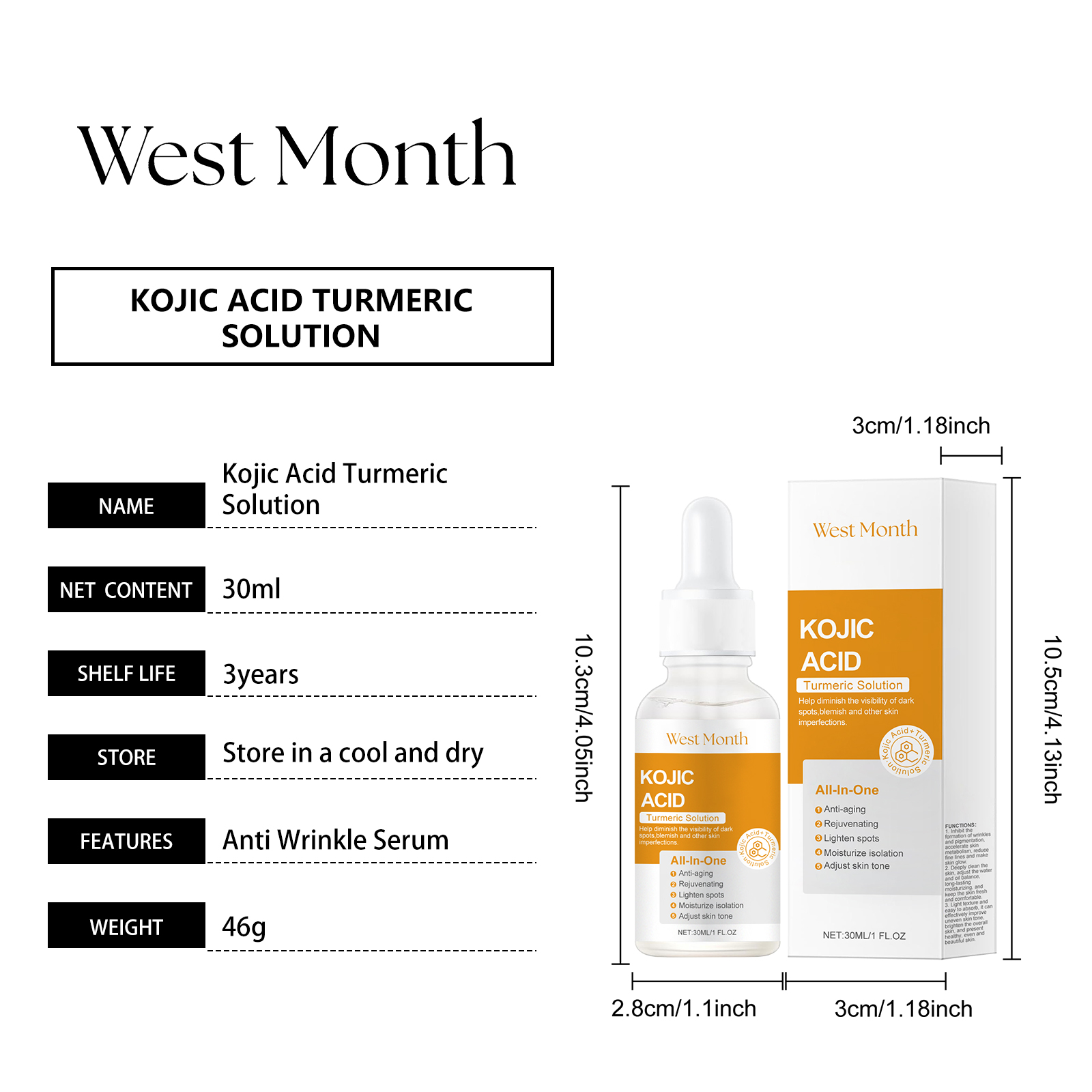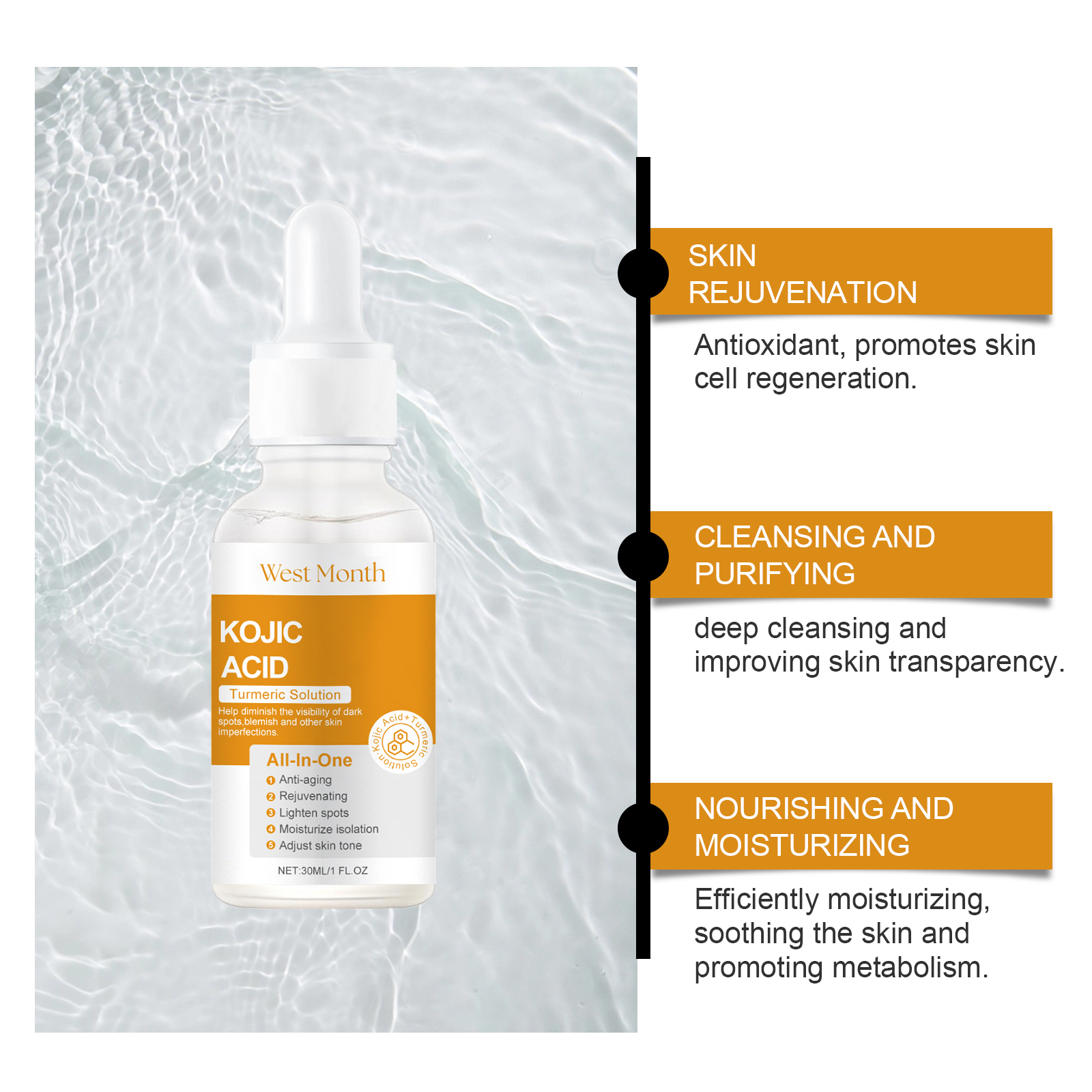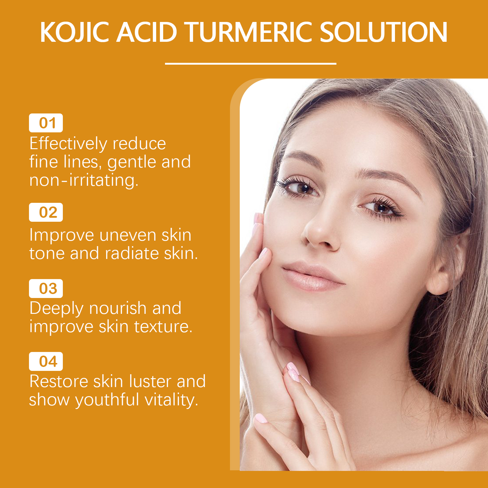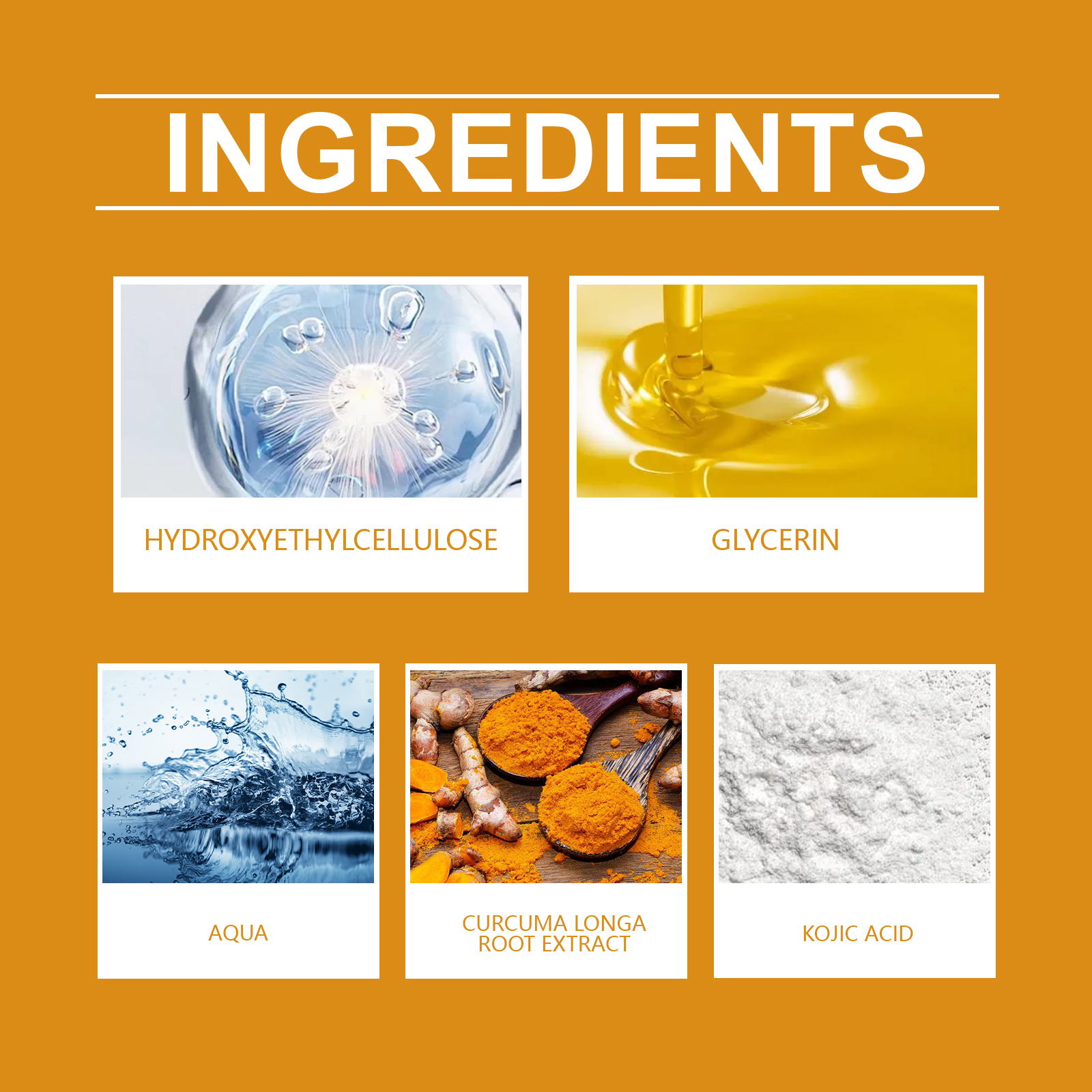 Our curcumic acid Anti-wrinkle brightening serum contains hydroxyethyl cellulose, turmeric root extract, and kojic acid. It can reduce sagging and restore elasticity. The essence is designed to accurately target wrinkles and dull areas. Improve the skin's ability to repair itself and resist external damage. Its application method is very simple: clean and dry facial skin, apply appropriate amount of this product evenly on the face, gently massage until absorbed. It can also improve blood circulation and skin health.