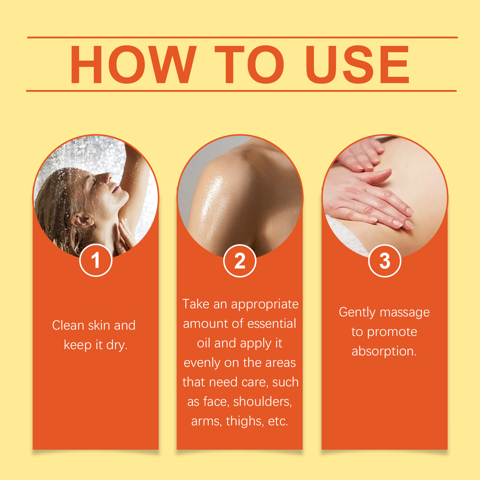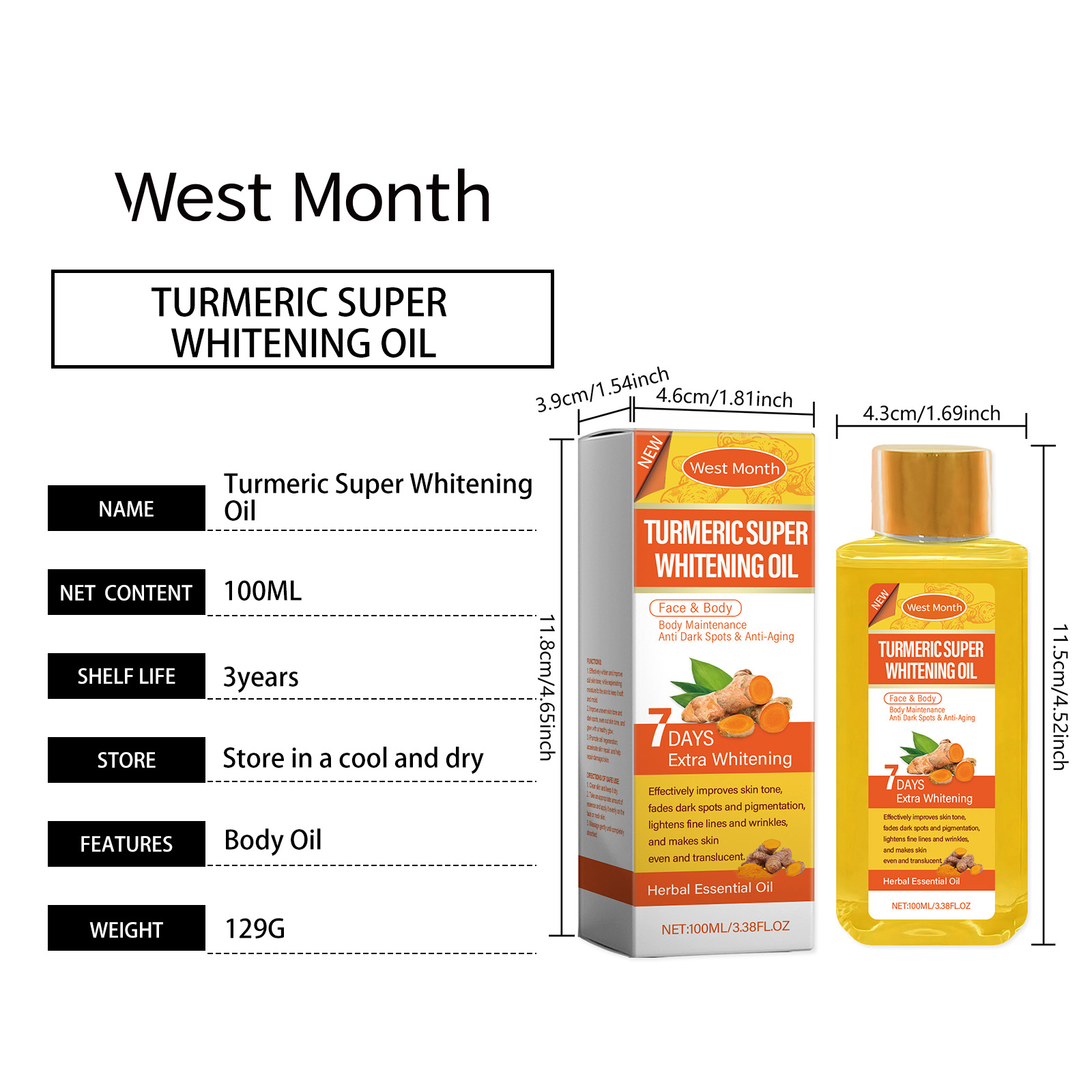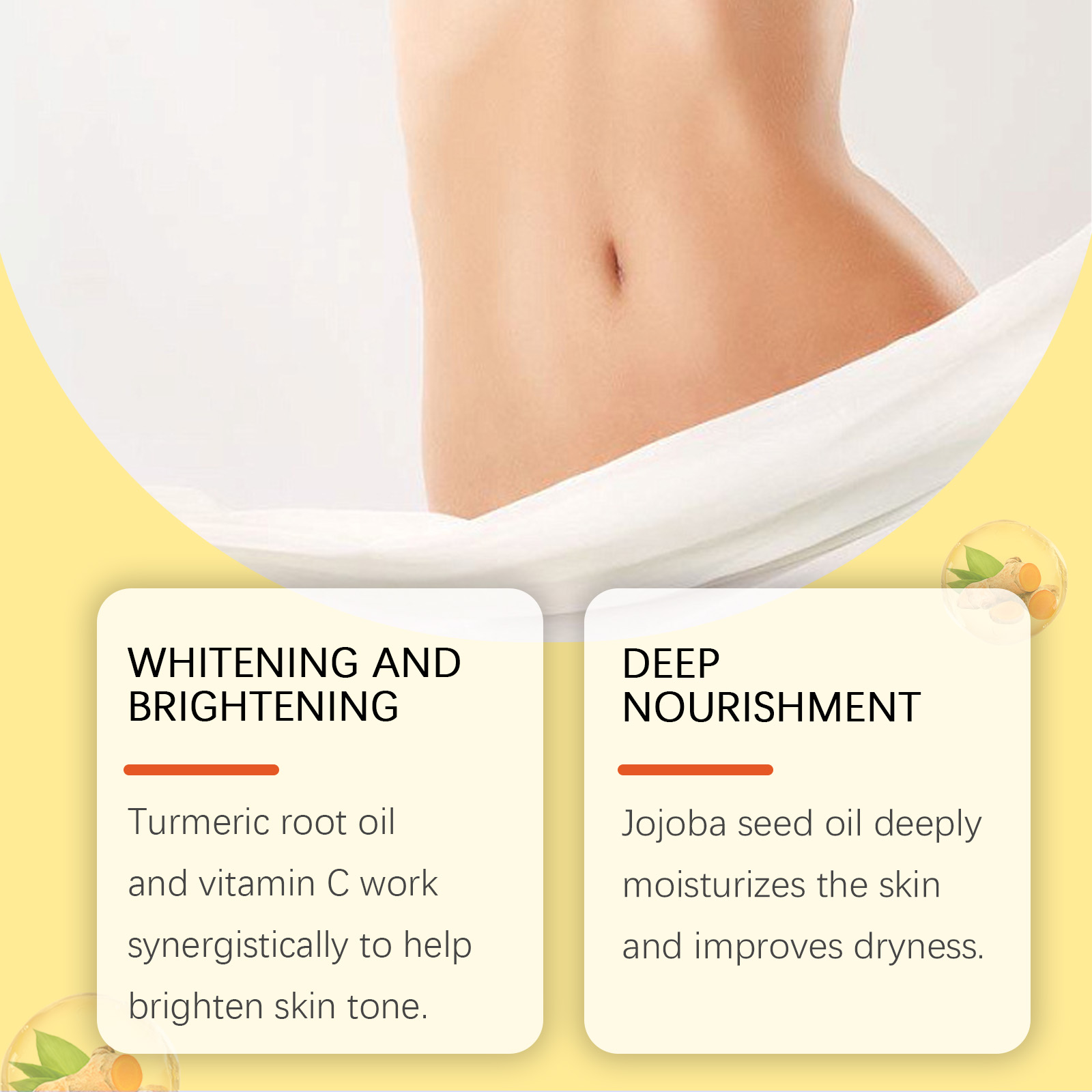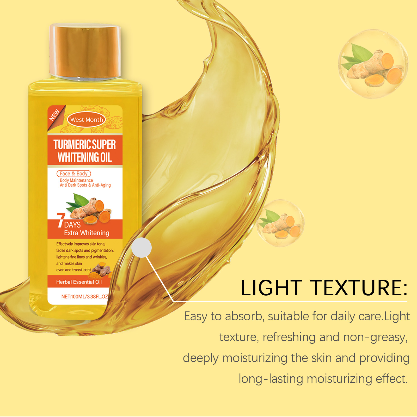 Our turmeric body whitening oil contains vitamin C, hyaluronic acid. It can moisturize for a long time without greasy, leaving skin fresh and soft. Its use method is very simple: clean the skin, keep the skin dry, take appropriate amount of essential oil, evenly apply to the parts that need care, such as face, shoulders, arms, thighs, etc., gently massage to promote absorption. It can also enhance skin elasticity and reduce the rough feeling caused by dry skin.