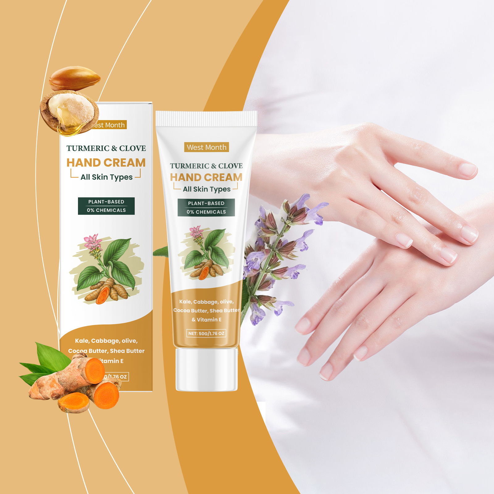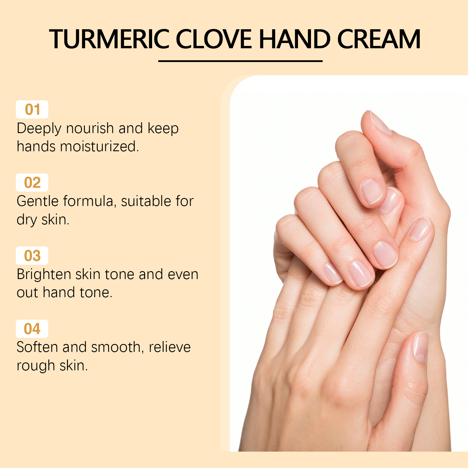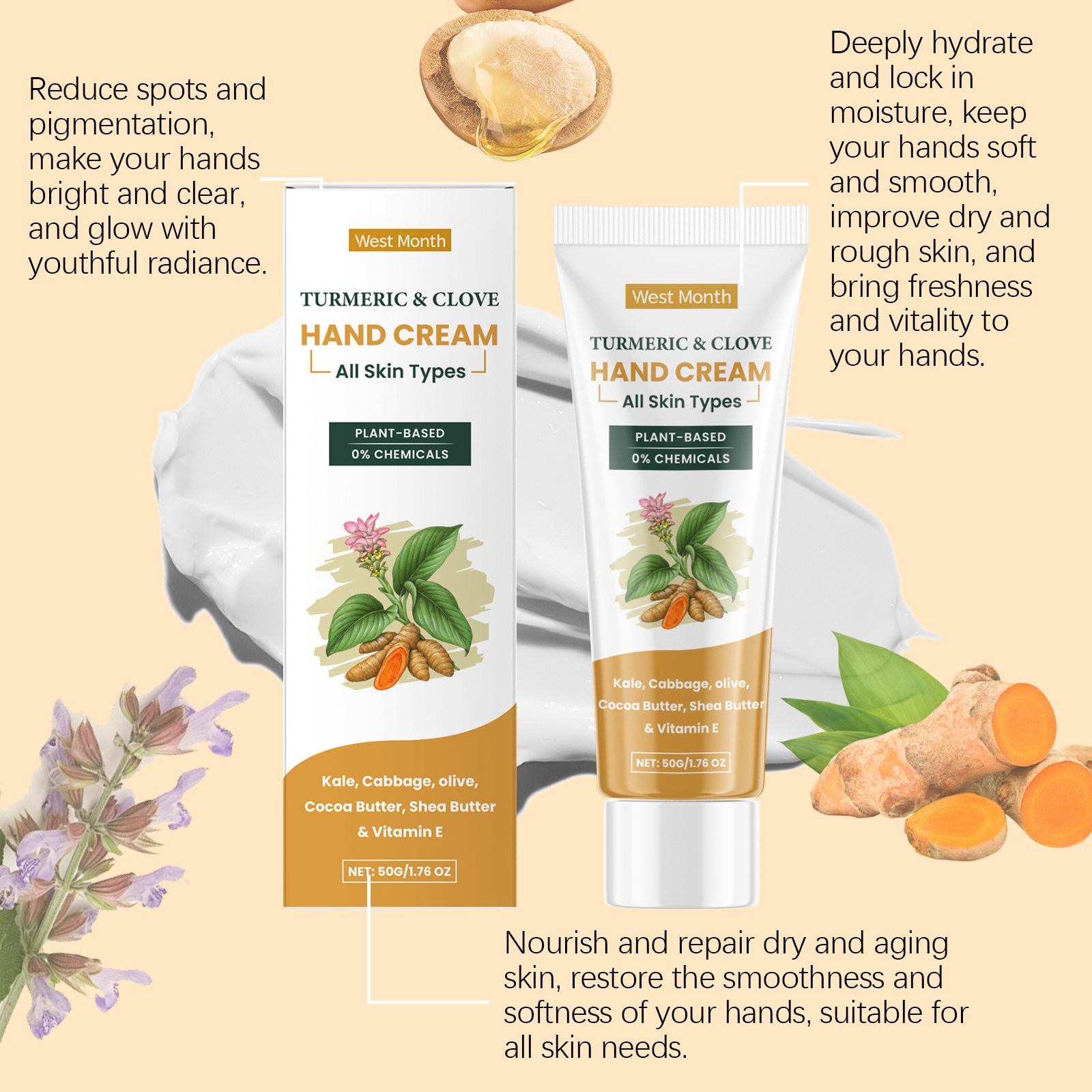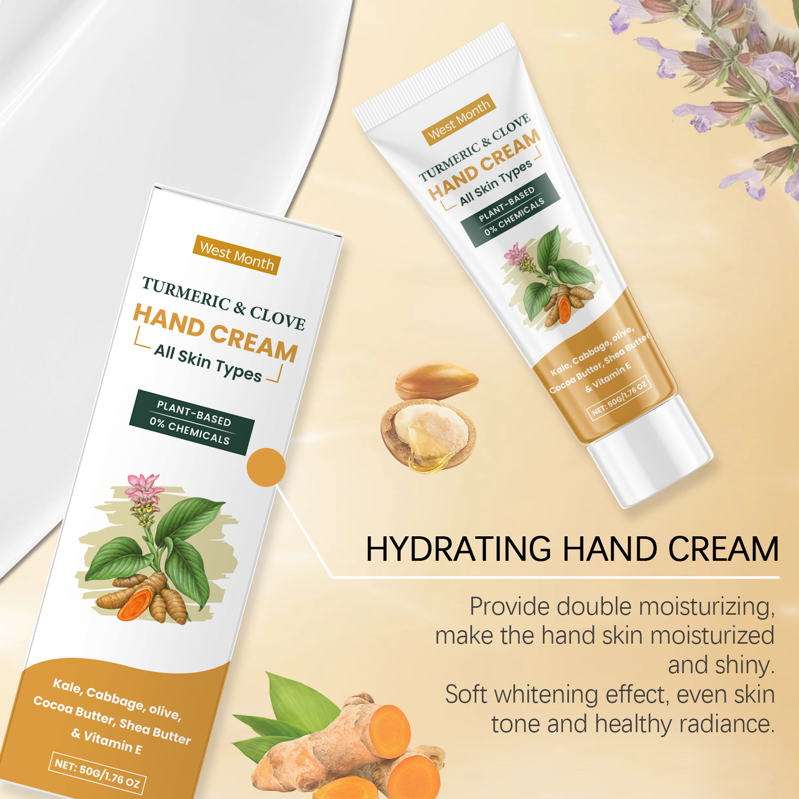 Our turmeric clove oil hand cream contains cocoa seed oil, shea butter, vitamin E (tocopherol). It helps the skin of the hands to stay moisturized and smooth. The way to use it is simple: clean your hands and keep them dry. Apply appropriate amount of the cream evenly to your hands and gently rub to promote absorption. It can also reduce pigmentation and enhance the shine of hand skin.