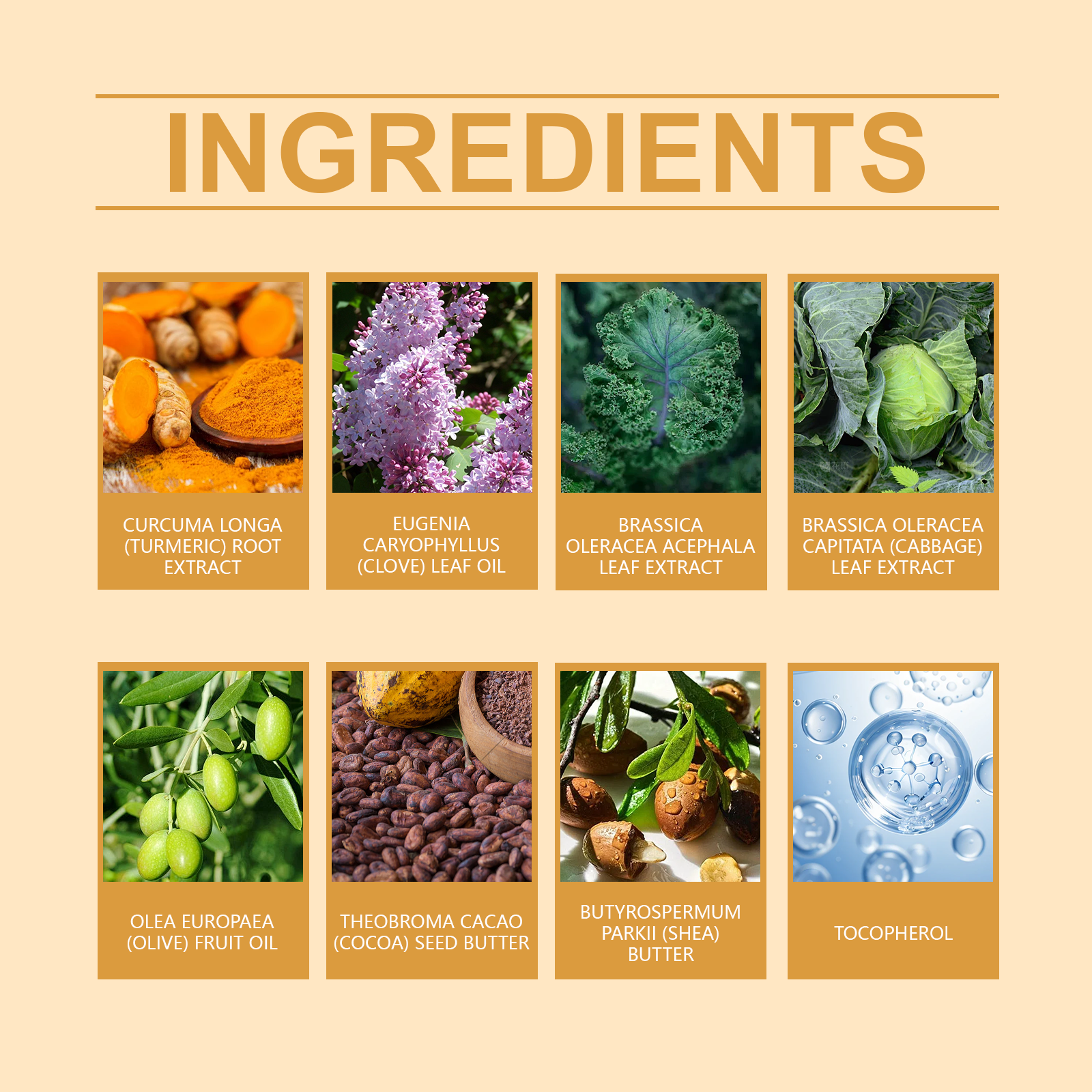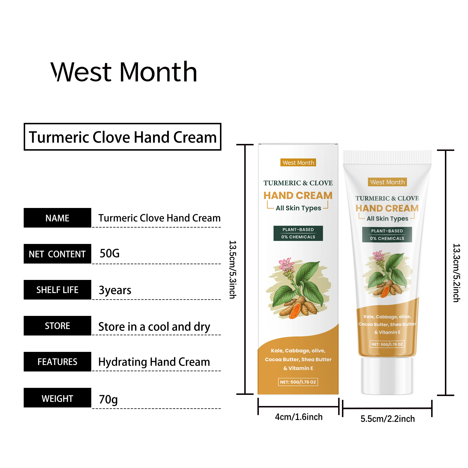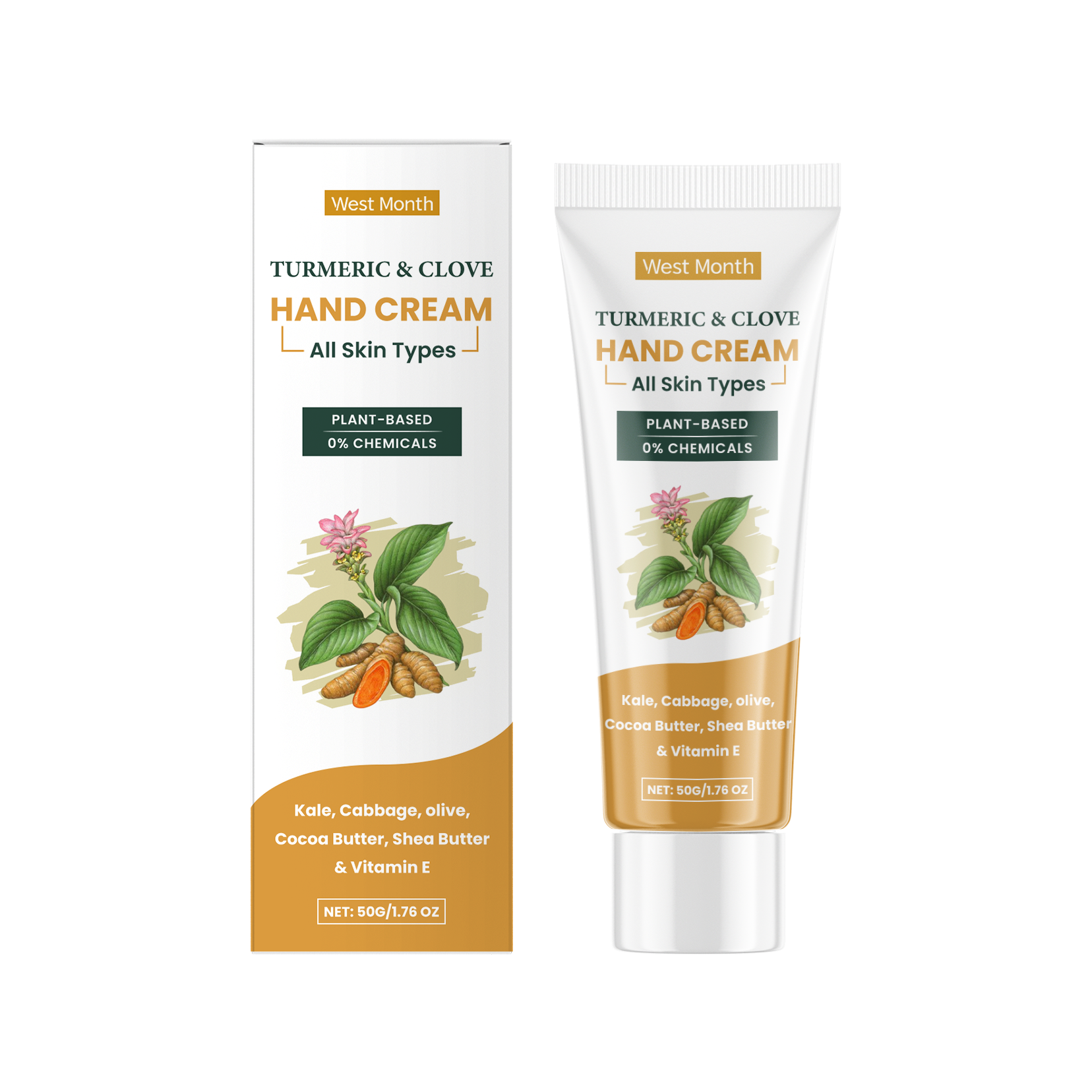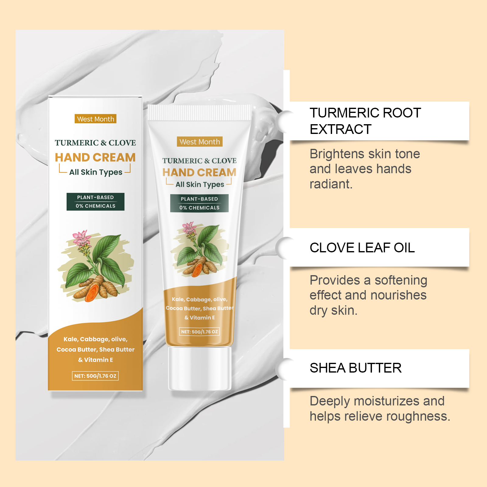 Our turmeric clove oil hand cream contains cocoa seed oil, shea butter, vitamin E (tocopherol). It helps the skin of the hands to stay moisturized and smooth. The way to use it is simple: clean your hands and keep them dry. Apply appropriate amount of the cream evenly to your hands and gently rub to promote absorption. It can also reduce pigmentation and enhance the shine of hand skin.