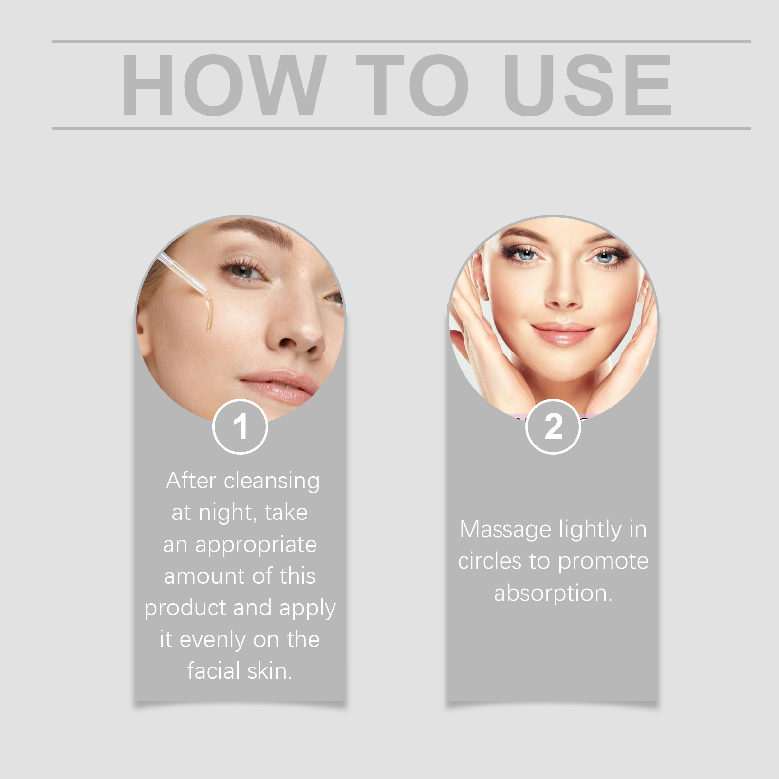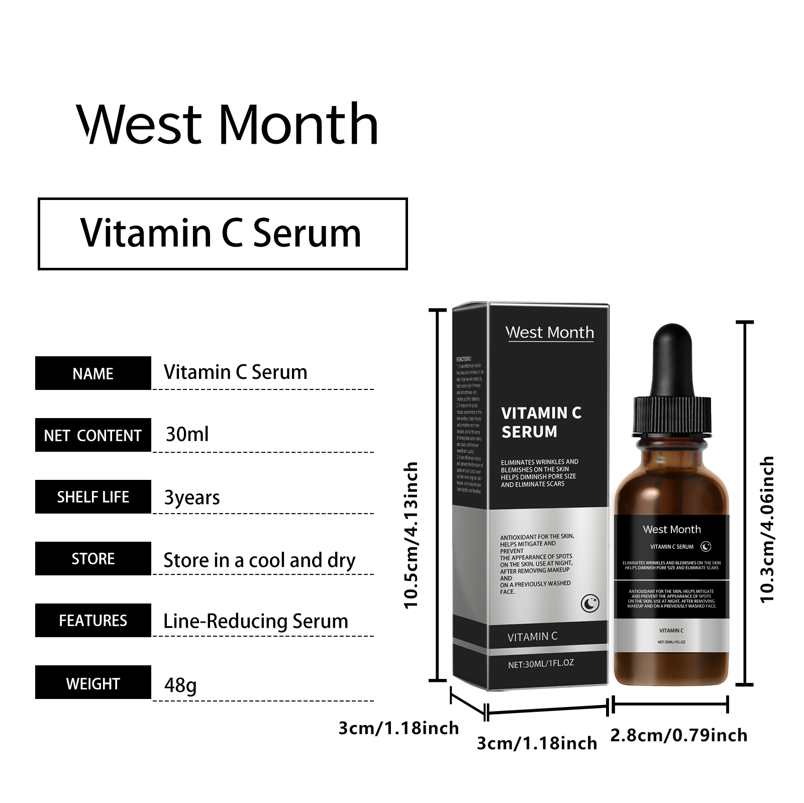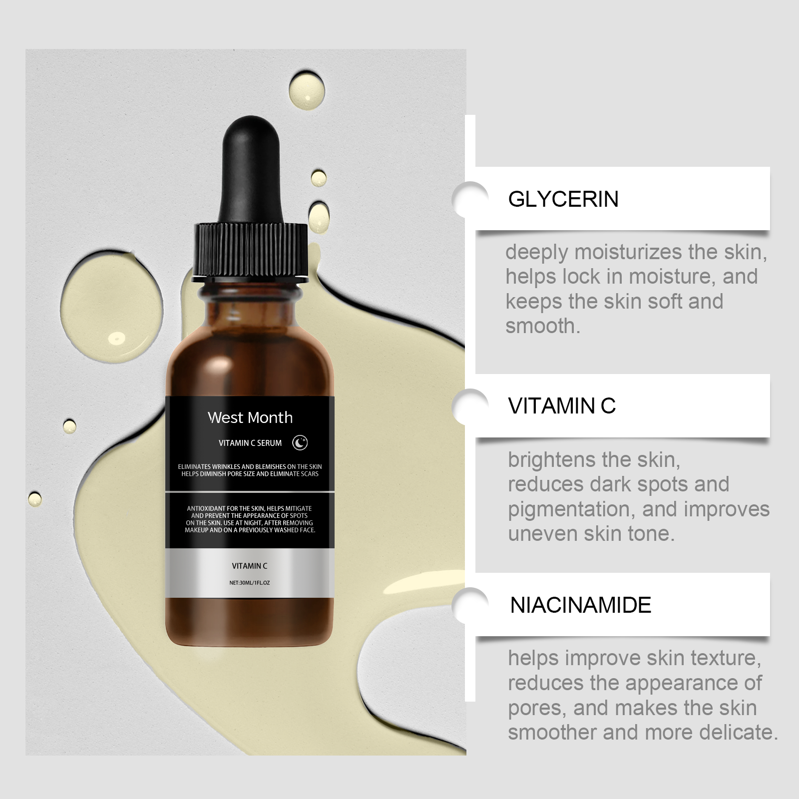 Our Vitamin C face serum contains niacinamide and witch hazel extract. It can be used for a long time to improve the appearance of pores. Its use method is very simple: after cleansing at night, apply appropriate amount of this product evenly on the face skin, gently massage in circles to promote absorption. It can also improve the texture of the skin and make the skin smoother and more delicate.