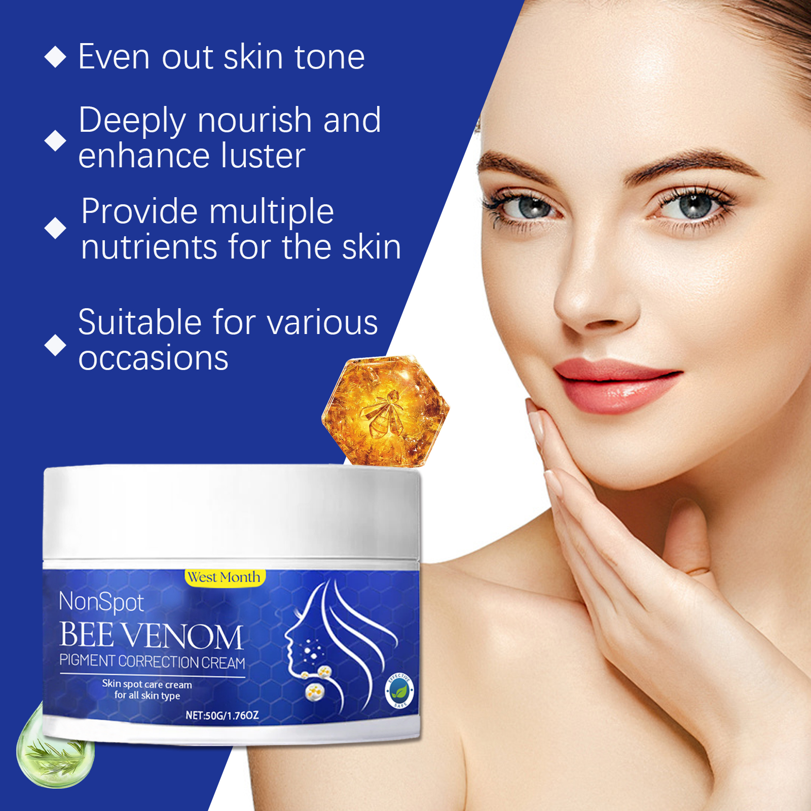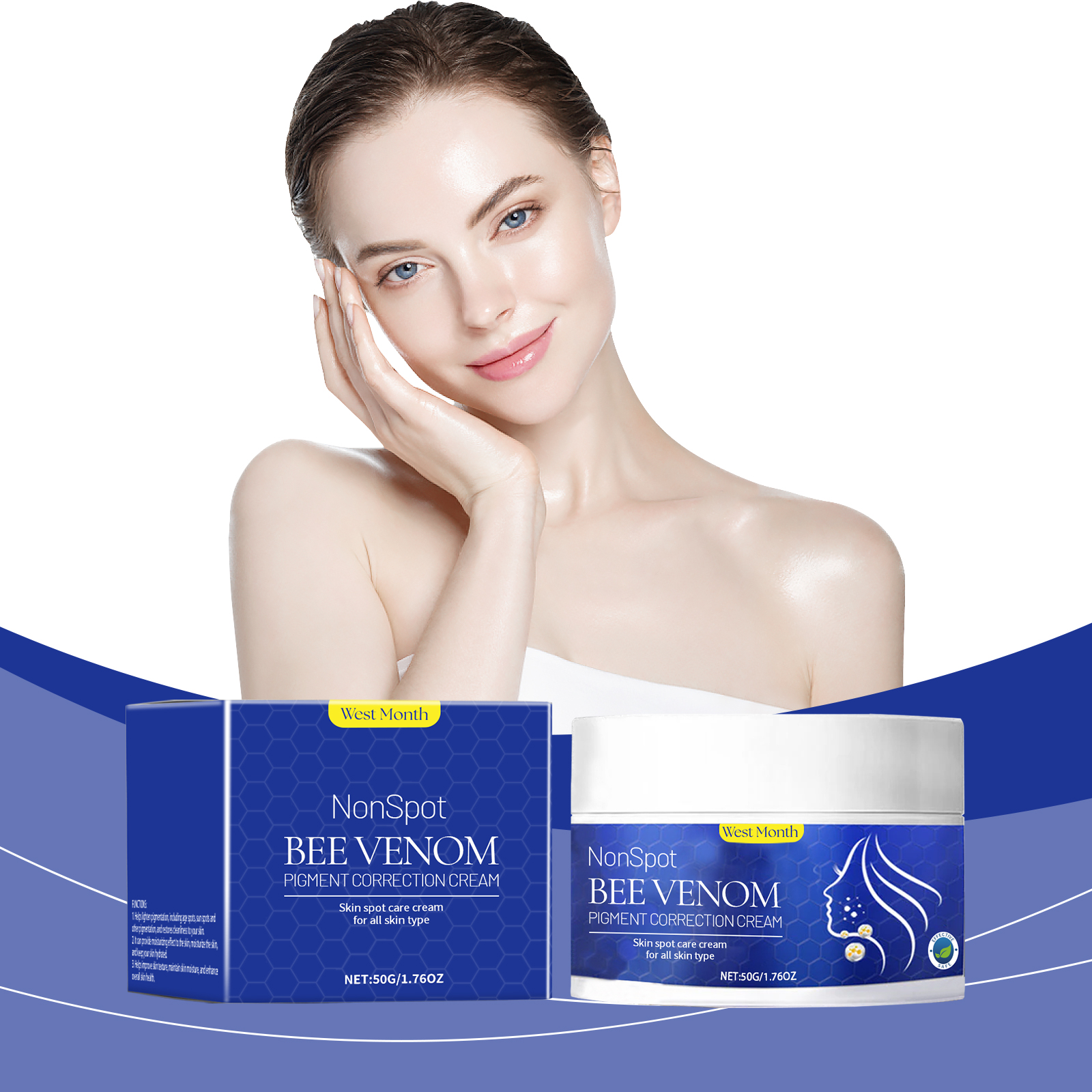 Our bee venom body care cream contains hyaluronic acid and niacinamide. It keeps the skin hydrated and enhances the overall health of the skin. Provides deep nourishment and leaves skin with a healthy glow. Its application method is very simple: clean the skin, keep the skin dry, take appropriate amount of this product, evenly apply to the skin with melanin pigmentation, gently massage until completely absorbed. And can provide moisturizing effect, moisturize the skin, keep the skin hydrated.