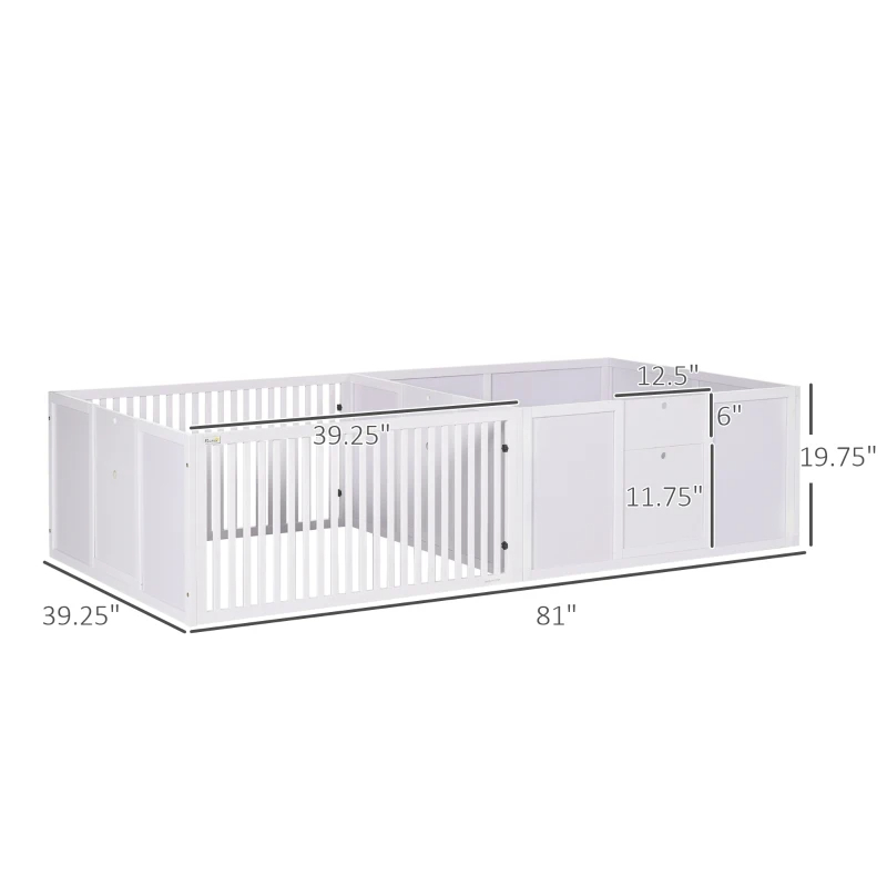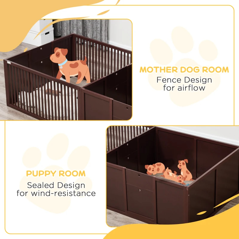 This two-room design puppy whelping box from PawHut provides a comfortable environment for a new mother dog, who can experience anxiety after having her babies. When the first two weeks have passed, it's important to allow her to have her own space, and this separated design ensures she gets what she needs, featuring a removable door for open access. With dual-sided construction, the mama can have the comfort of airflow while the puppies have a wind-resistant space. Features: - For all breeds and sizes - Offers plenty of space for security and comfort - Adjustable entrance doors, with panels that can be removed or added back - Left side offers a wind-resistant habitat for the pups - Non-slip pads protect the floor and maintain stability - Tough and durable pinewood materials - Assembly required - Please note that dog pee pad is not included Specification: - Color: Crystal White - Materials: Pinewood, MDF - Overall Dimensions: 81" L x 39.25" W x 19.75" H - Single Panel Dimensions: 12.5" W x 6" H - Door Dimensions: 11.75" W x 17.25" H, Single Panel: 12.5" W x 6" H, 12.5" W x 11.75" H - Distance Between Fences: 24mm - Item Label: D06-174V00WT Package Includes: - 1 x Pet Playpen - 1 x Manual This two-room design puppy whelping box from PawHut provides a comfortable environment for a new mother dog, who can experience anxiety after having her babies. Features: - For all breeds and sizes - Offers plenty of space for security and comfort - Adjustable entrance doors, with panels that can be removed or added back - Left side offers a wind-resistant habitat for the pups - Non-slip pads protect the floor and maintain stability - Tough and durable pinewood materials - Assembly required - Please note that dog pee pad is not included Specification: - Color: Coffee brown - Materials: Pinewood, MDF - Overall Dimensions: 81" L x 39.25" W x 19.75" H - Single Panel Dimensions: 12.5" W x 6" H - Door Dimensions: 11.75" W x 17.25" H, Single Panel: 12.5" W x 6" H, 12.5" W x 11.75" H - Distance Between Fences: 24mm - Item Label: D06-174V00CF Package Includes: - 1 x Pet Playpen - 1 x Manual This two-room design puppy whelping box from PawHut provides a comfortable environment for a new mother dog, who can experience anxiety after having her babies. Features: - For all breeds and sizes - Offers plenty of space for security and comfort - Adjustable entrance doors, with panels that can be removed or added back - Left side offers a wind-resistant habitat for the pups - Non-slip pads protect the floor and maintain stability - Tough and durable pinewood materials - Assembly required - Please note that dog pee pad is not included Specification: - Color: Light gray - Materials: Pinewood, MDF - Overall Dimensions: 81" L x 39.25" W x 19.75" H - Single Panel Dimensions: 12.5" W x 6" H - Door Dimensions: 11.75" W x 17.25" H, Single Panel: 12.5" W x 6" H, 12.5" W x 11.75" H - Distance Between Fences: 24mm - Item Label: D06-174V00LG Package Includes: - 1 x Pet Playpen - 1 x Manual Welcome your furry friend's new puppies into the world with the PawHut whelping box for dogs. Designed with seven pieces and two cozy rooms, it's great for mother dogs post-birth. Easily adjust the door height to keep puppies safe, and enjoy the clean convenience of a whelping pee pad in this thoughtfully sealed dog whelping box. It's suitable for large and smaller breeds alike. Features: - A seven-piece, two-room design caters to birthing mother dogs - Removable door adjusts height to contain puppies safely - Sealed design shields puppies from wind, - A fence-style build ventilates the mother - Included whelping pee pad absorbs liquids, reduces mess - Non-slip rubber pads prevent movement and enhance safety - Accommodates large to small dog breeds comfortably - Assembly required Specification: - Color: White - Materials: Pinewood, MDF - Overall Dimensions: 65.4" L x 31.5" W x 19.7" H - Single Panel Dimensions: 31.5" W x 19.7" H - Door Dimensions: 12" W x 14.6" H - Removable Door Panel Height: 4.9", 9.8" H - Pee Pad Dimensions: 69.3" L x 35.4" W - Item Label: D06-220V00WT Package Includes: - 7 x Whelping Box Panel - 1 x Pee Pad - 1 x Manual.