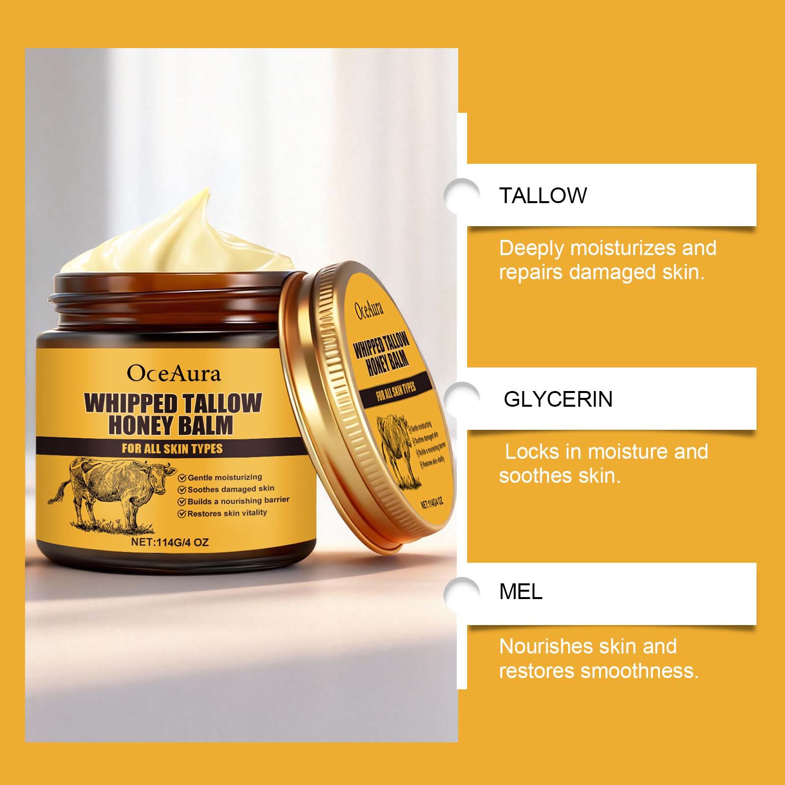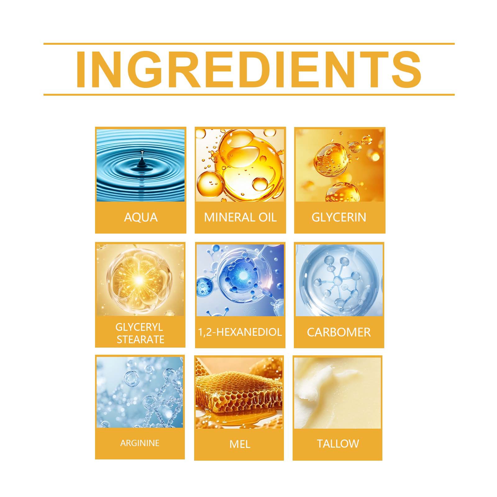 Ingredients: water, mineral oil, glycerin, glycerol stearate, 1,2- hexanediol, carbomer, arginine, honey, tallow.