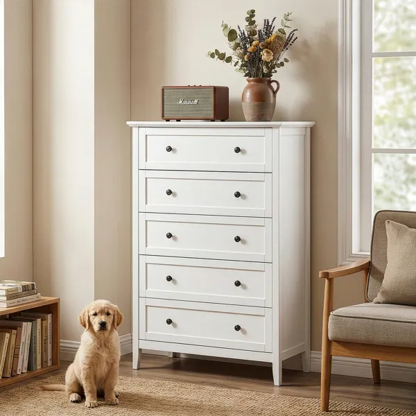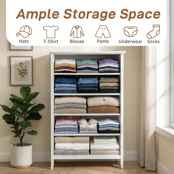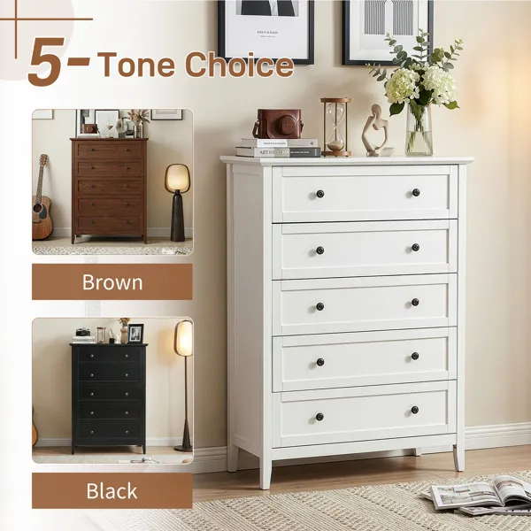Spacious & Organized Storage: Designed with five smooth-gliding drawers, this cabinet provides ample space to organize clothing, accessories, linens, or office supplies neatly. The generous drawer capacity allows for efficient categorization of items, helping to eliminate clutter and keep your essentials orderly and easily accessible within your living space.