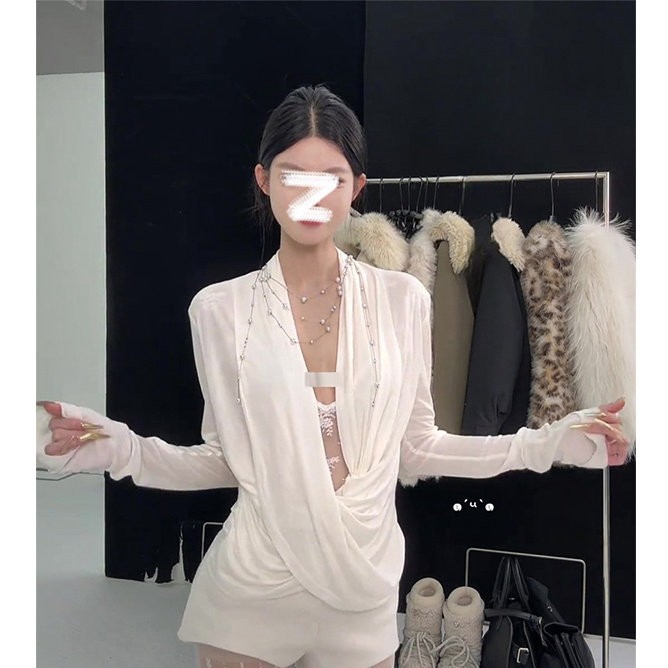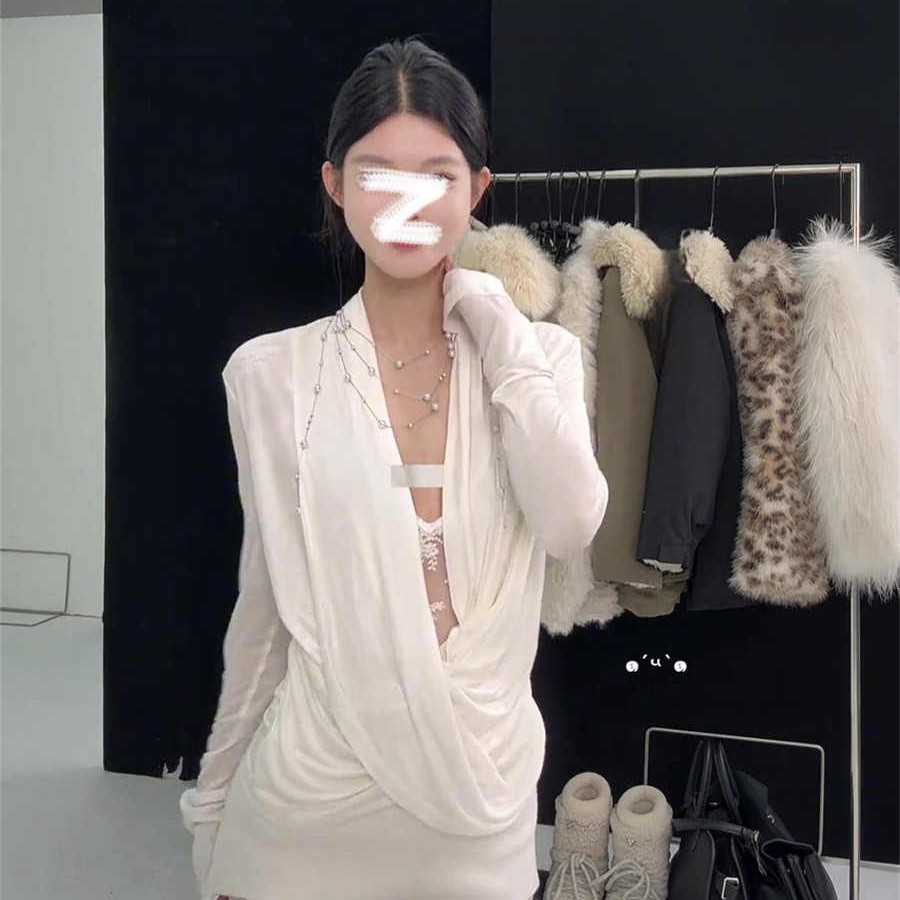White Faux Two-piece Lace Boat-neck Long-sleeve Top