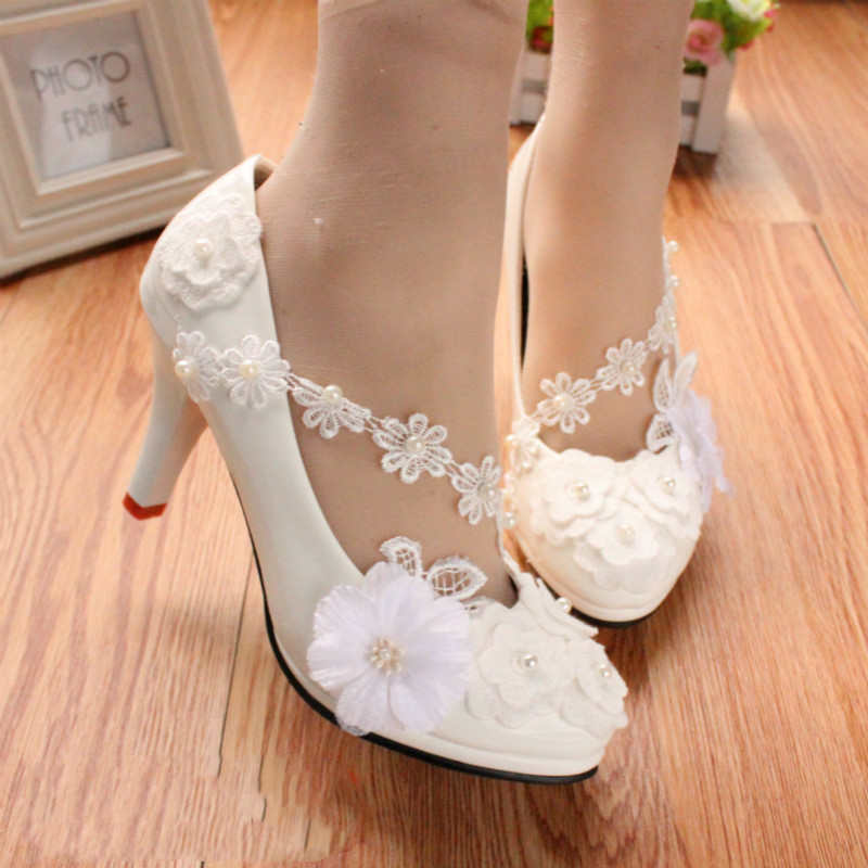 White Large Lace Low Heel Wedding Dress 3D Flower Women's Shoes