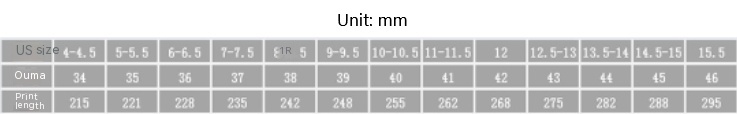Size: 34, 35, 36, 37, 38, 39, 40, 41, 42, 43, 44, 45, 46