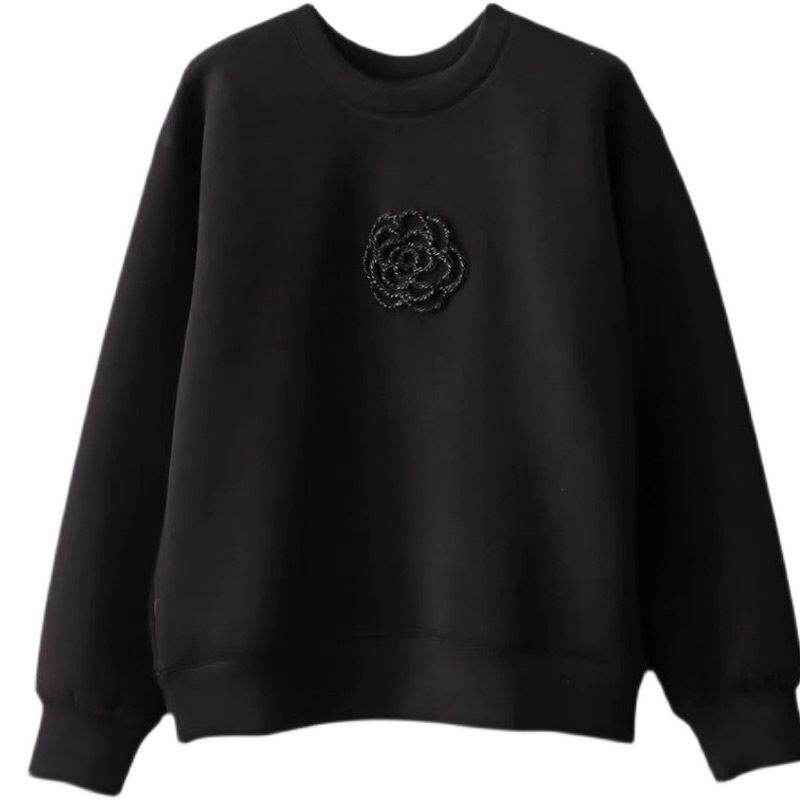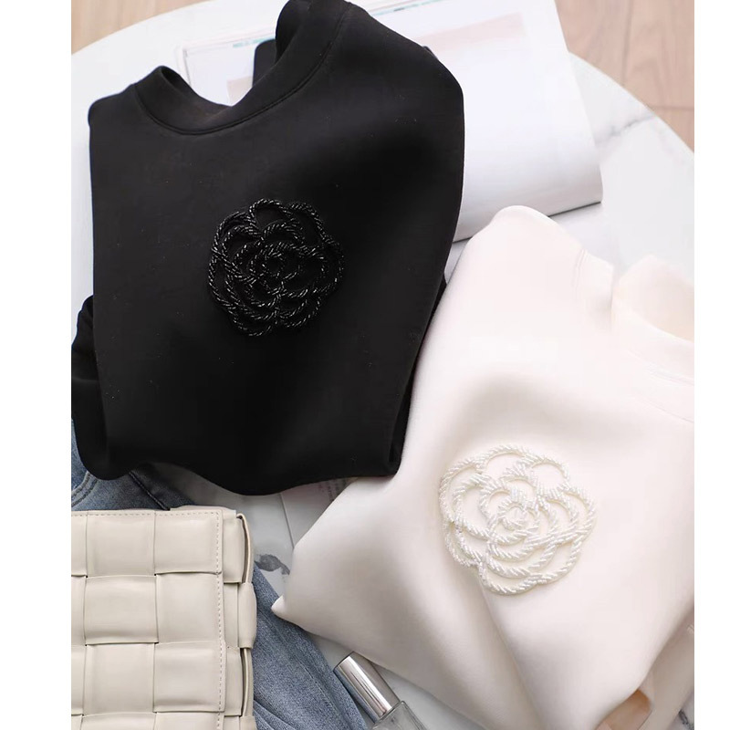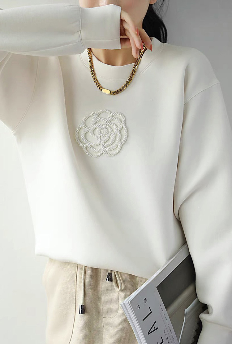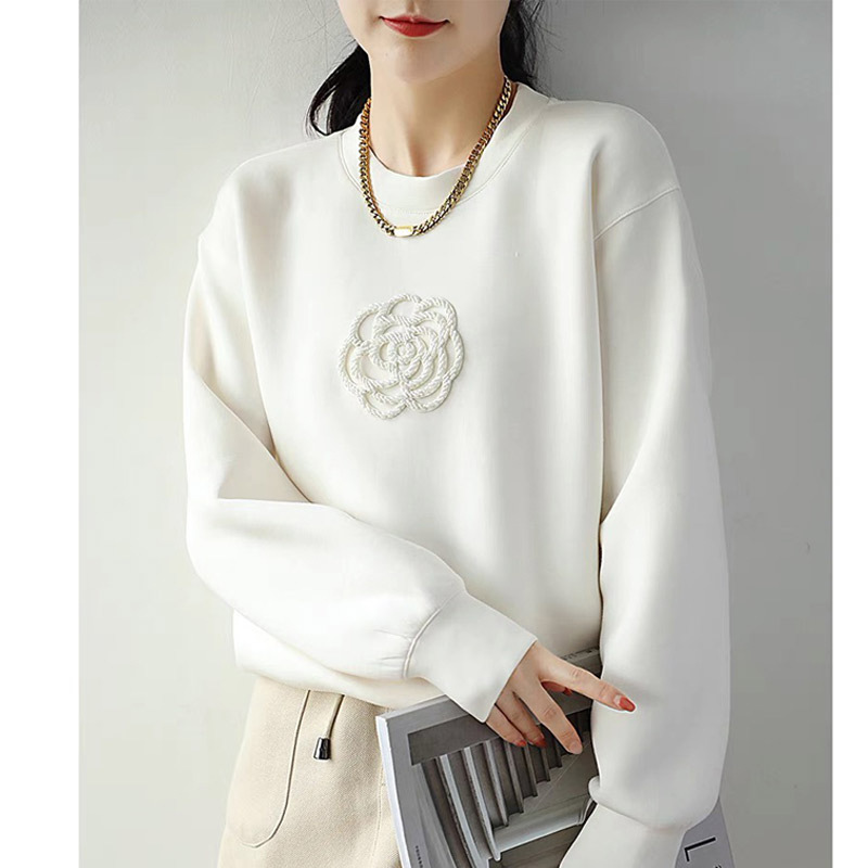 White Machine Embroidery Beaded Camellia Round Neck Loose All-match Air Layer Sweater