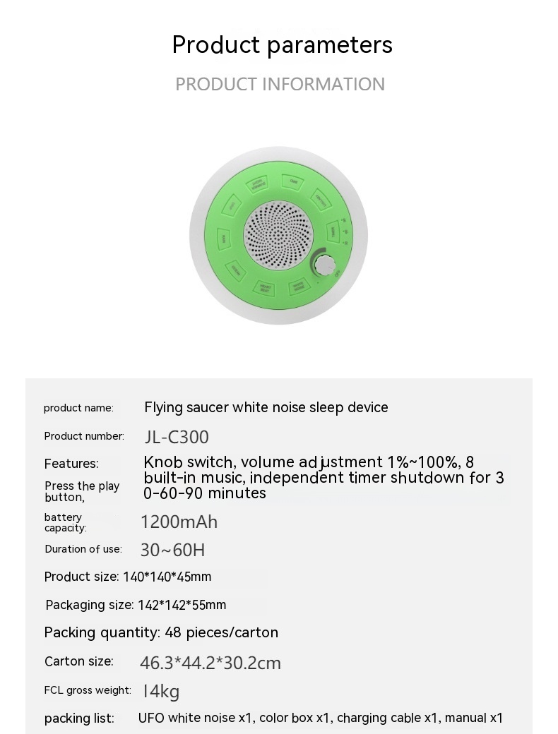 Packing List: Flying Saucer white noise * 1, color box * 1, charging cable * 1, manual * 1