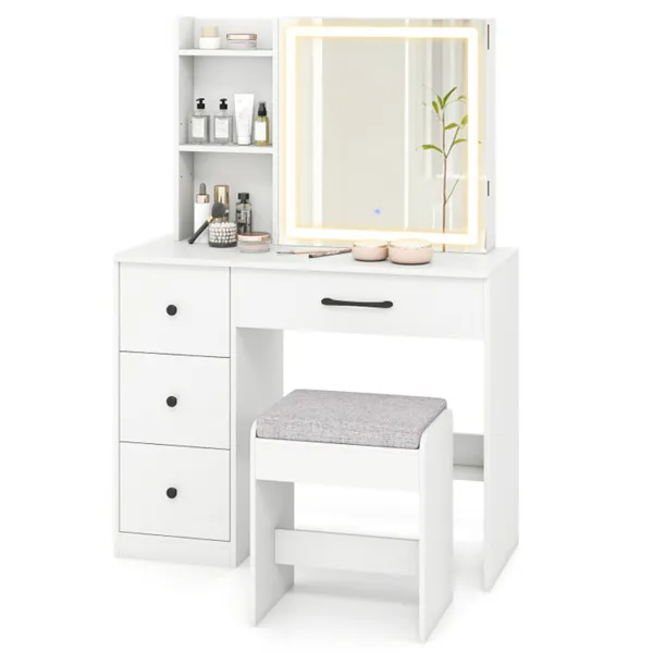 White Vanity Desk And Stool Set With Sliding Mirror & 3-Mode LED Light Strip, Anti-Toppling Dressing Table With Ample Storage