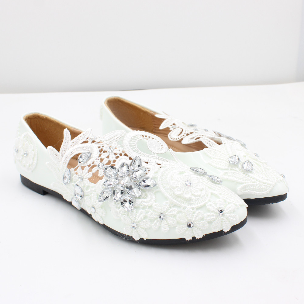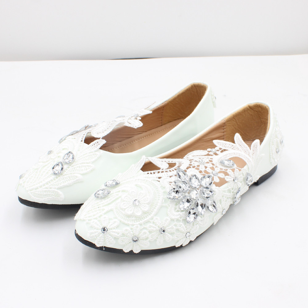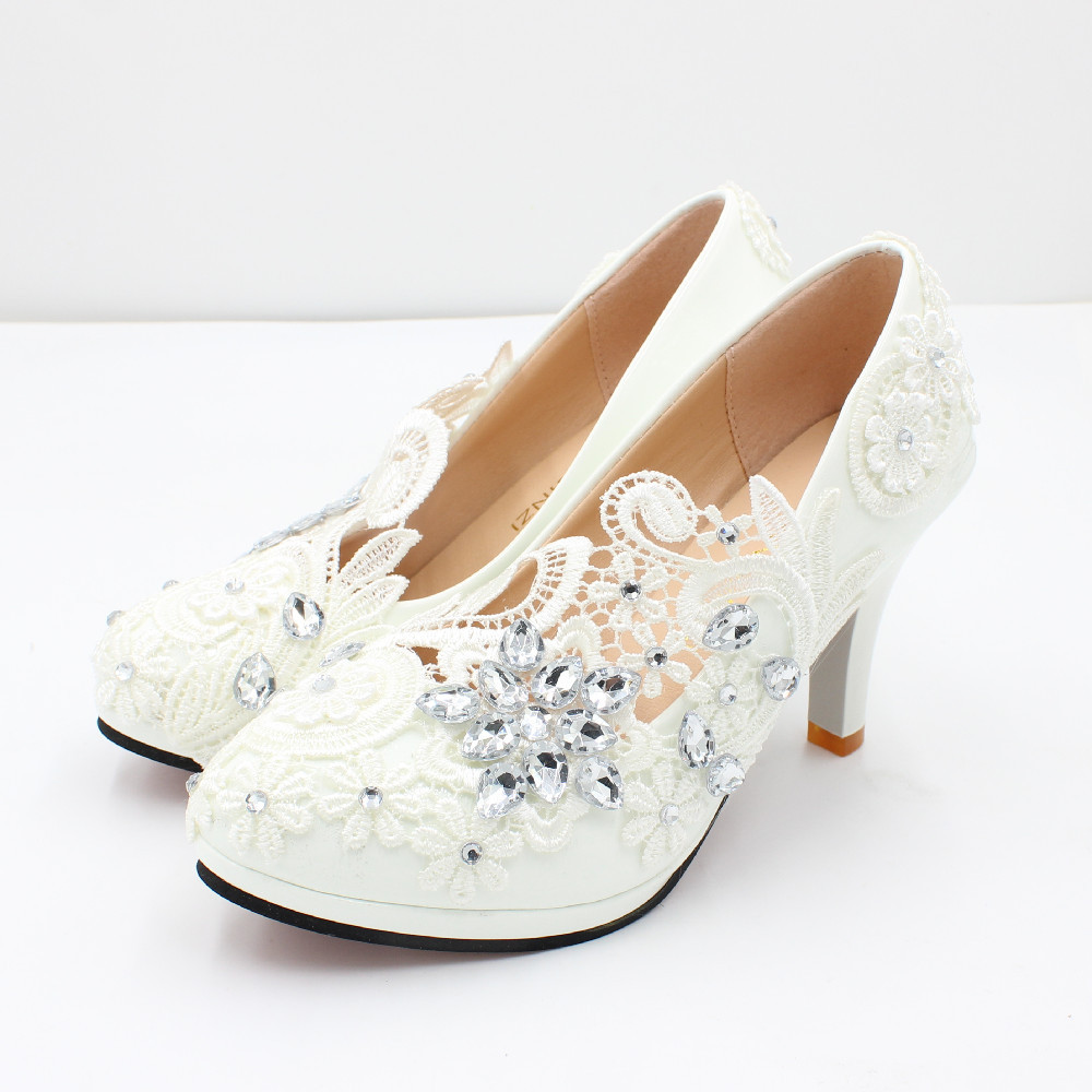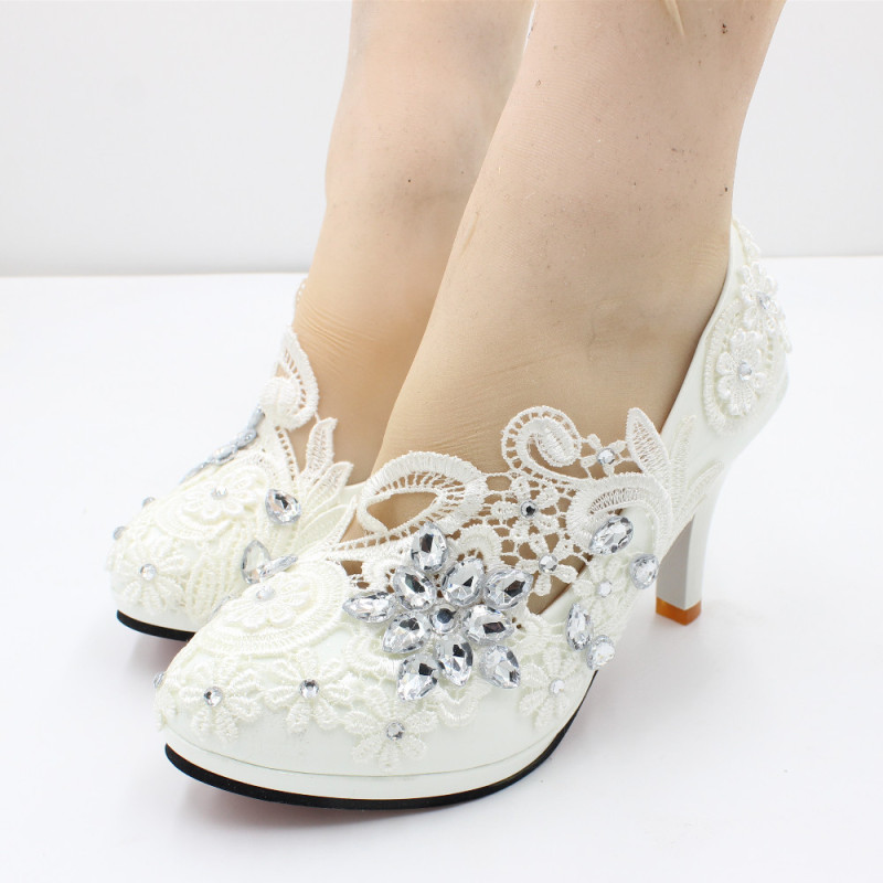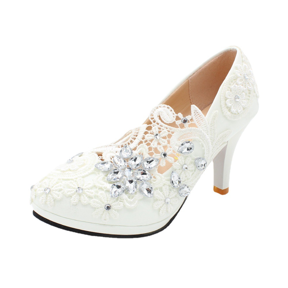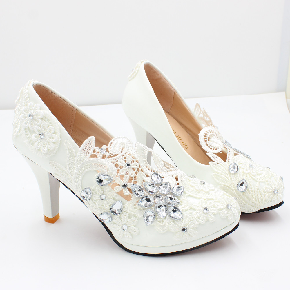White Wedding Shoes High Heel Round Head Lace Rhinestones