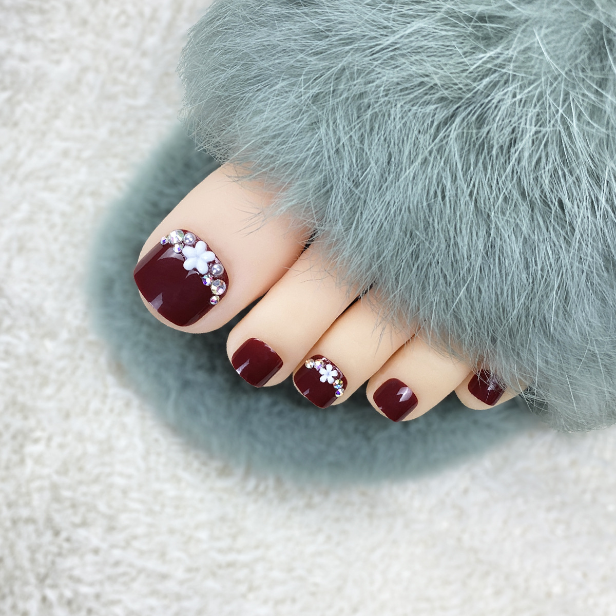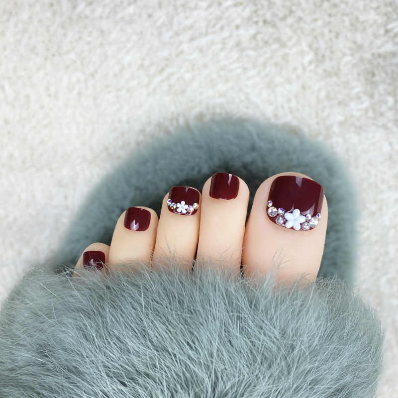 White Wine Red Toe Nails Finished Small Flower With Diamond Nail Patch