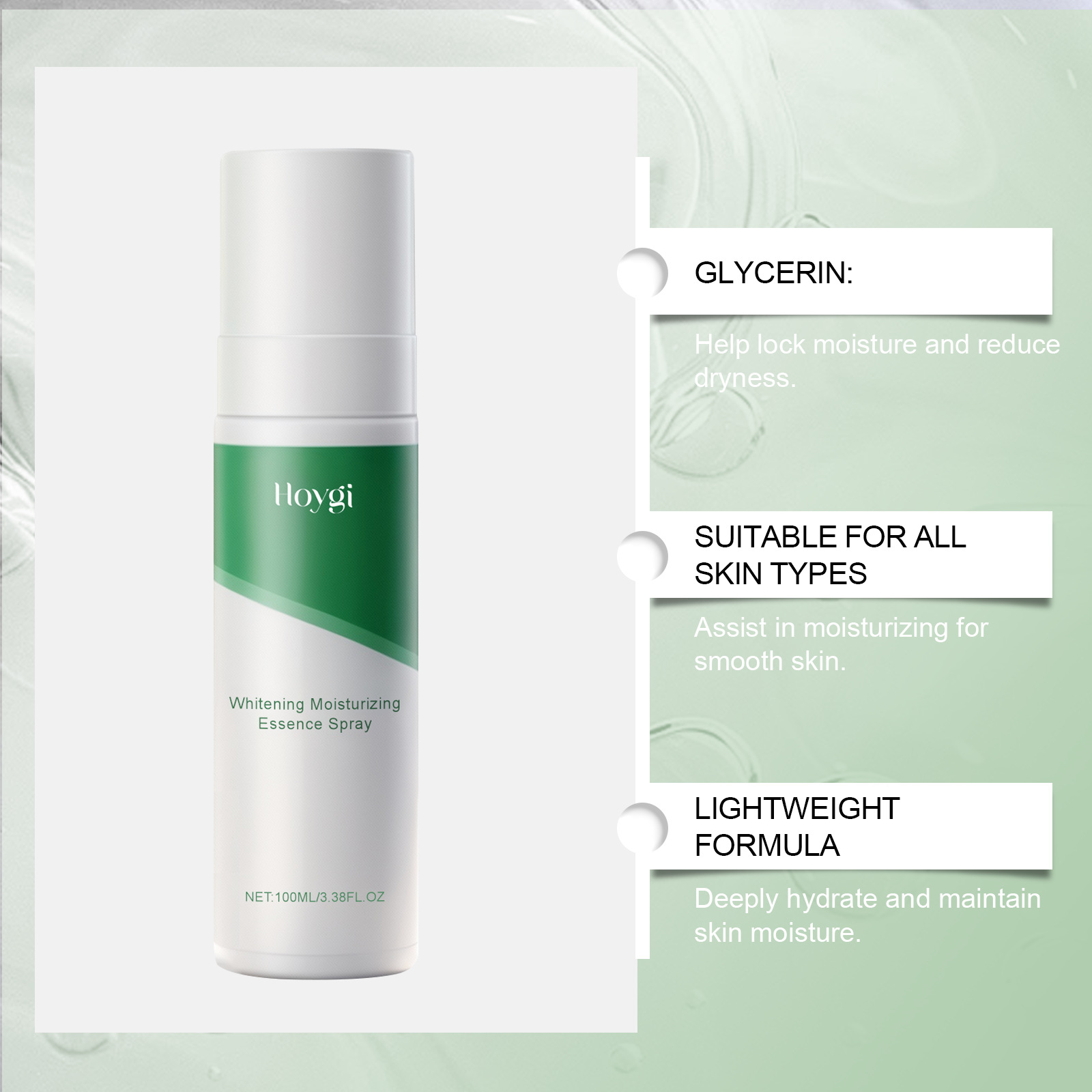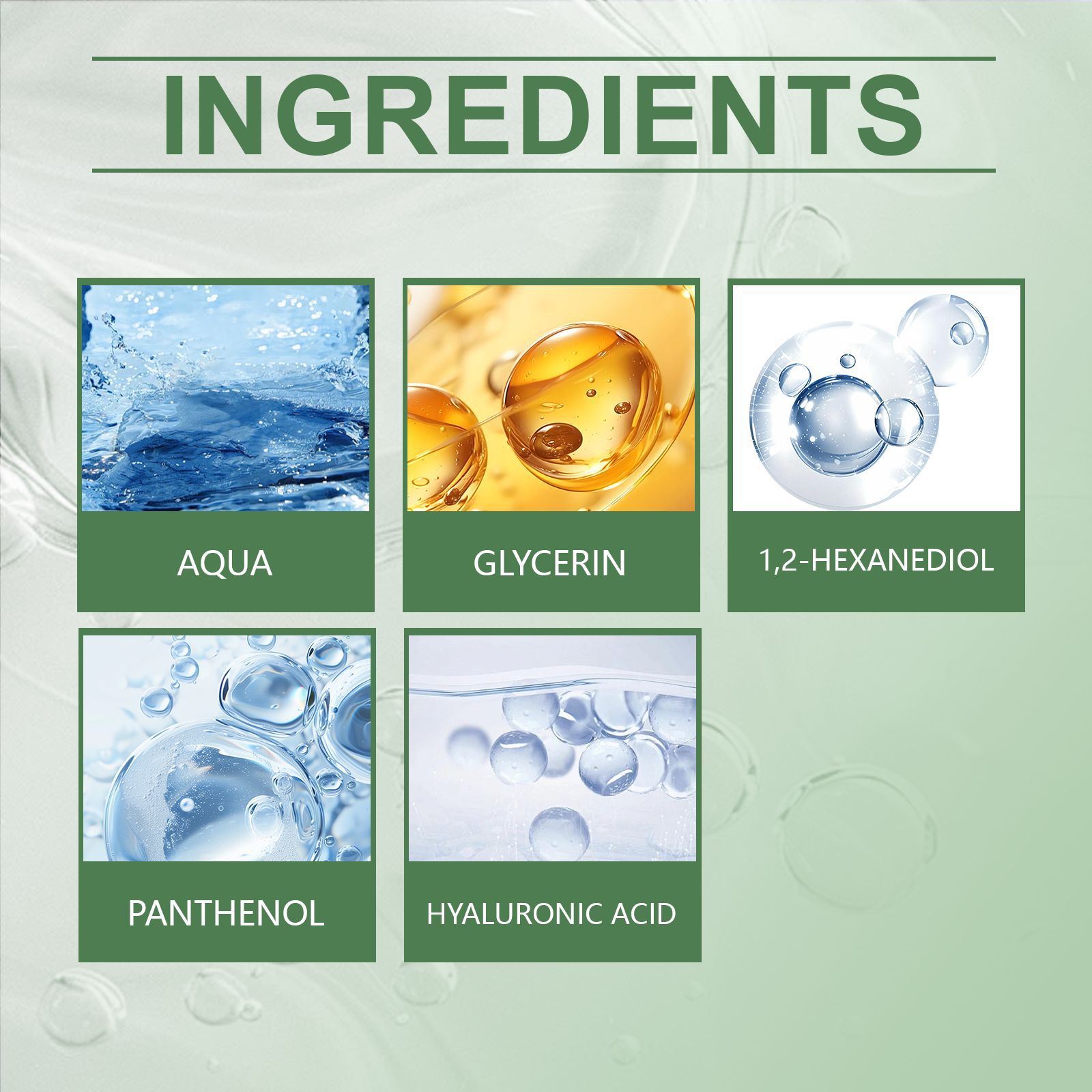 Product information:Ingredients: water, glycerin, 1,2- hexanediol, panthenol, hyaluronic acid.