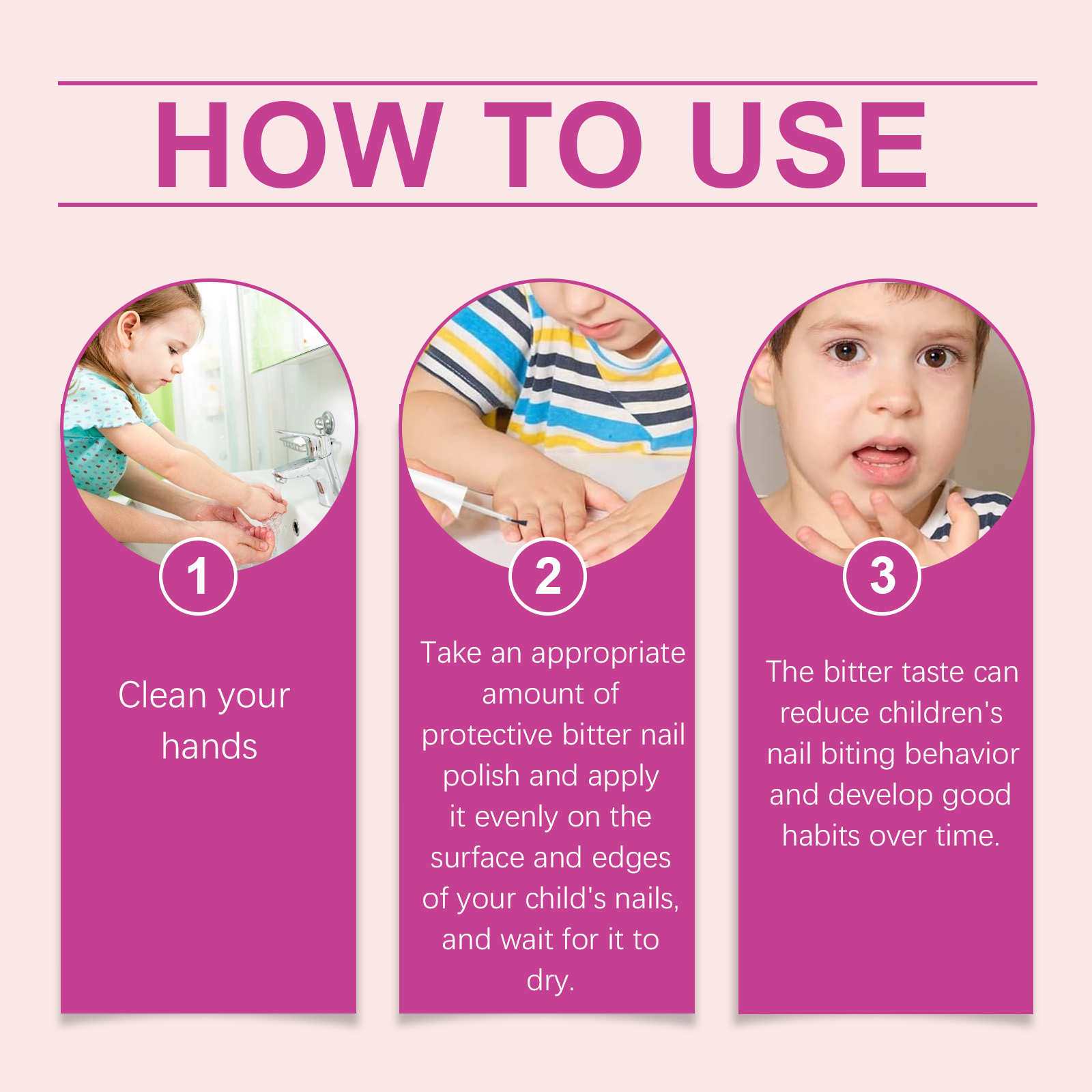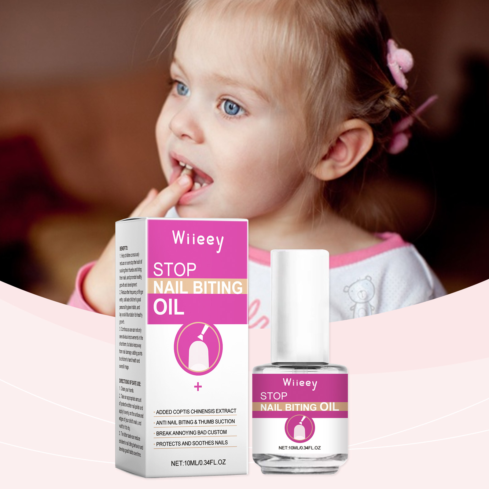 Our Children's Protection Bitter Nail Water contains bitter melon extract, bitter almond oil, grapeseed oil. It can help children consciously reduce or even stop thumb sucking and nail biting habits, promoting healthy growth and development. Its use method is very simple: 1. Clean hands; 2. Take the appropriate amount of bitter nail polish, evenly apply to the surface and edge of the child's nails, and wait for it to dry. 3. Bitter taste can reduce the child's snail biting behavior and develop good habits over time. Especially bitter taste, gentle reminder to avoid bad habits; Single-use, long-lasting, reduce frequent repetition.