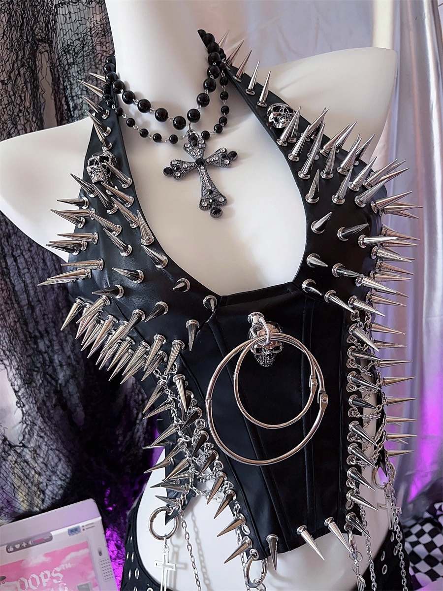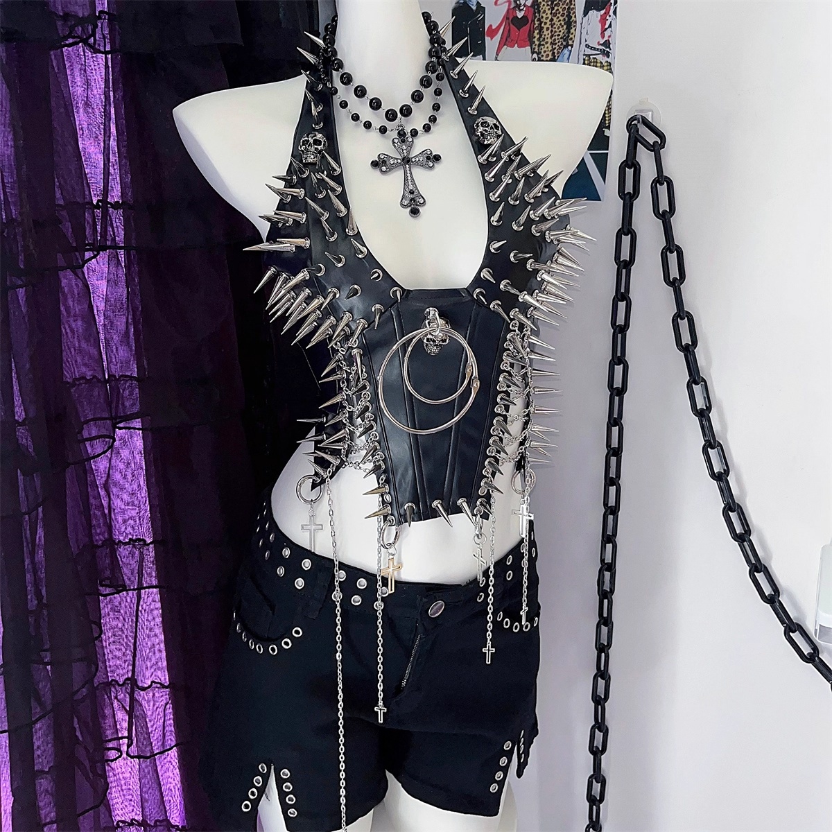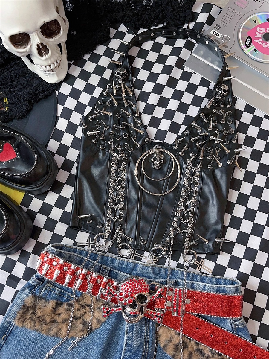 Wild And Sweet Cat Pure Desire Spicy Girl Metal Rivet V-Neck Cross Chain PU Leather Music Festival Y2K Vest