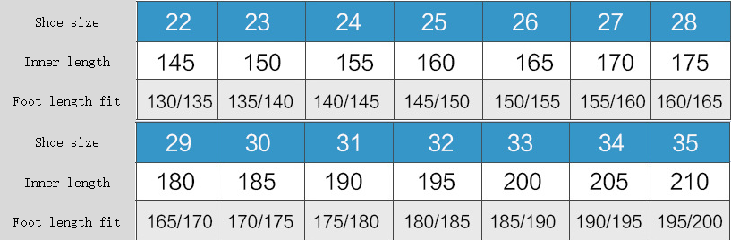 Size: 22cm, 23 15cm, 24cm, 25 16cm, 26cm, 27 yards inner length 17cm, 28 yards inner length cm, 29 yards inner length 18cm, 30 yards inner length CM, size 31 inner length is 19CM, size 32 inner length is CM, size 33 inner length is 20CM, size 34 inner length is CM, the internal length of size 35 is 21cm