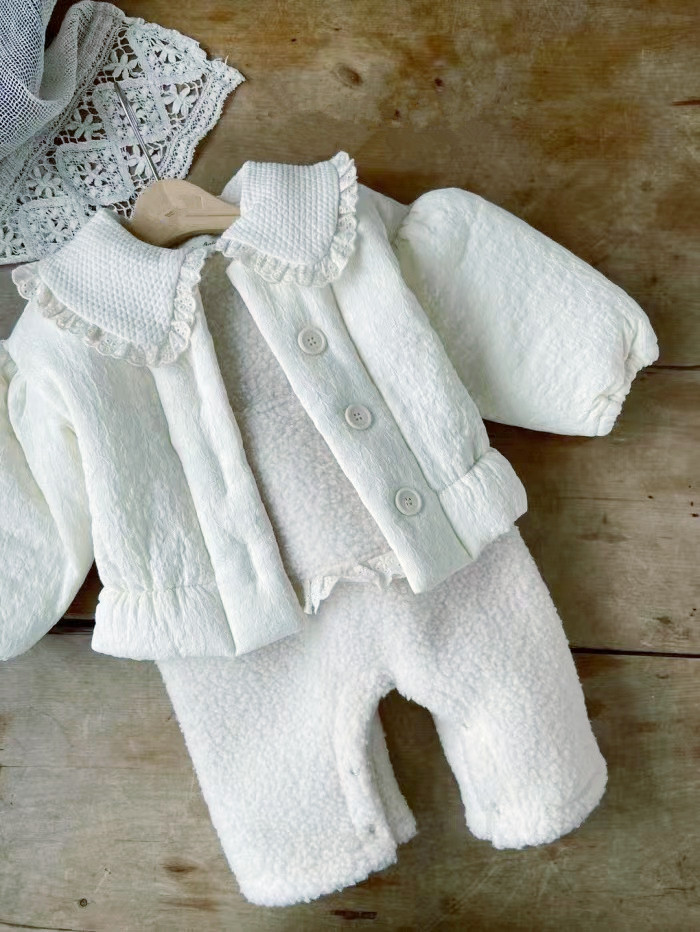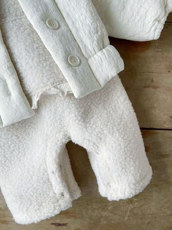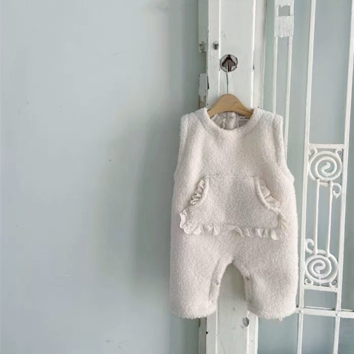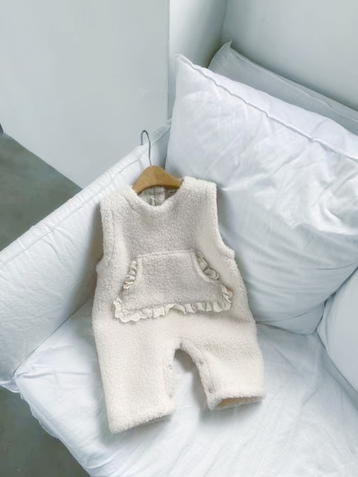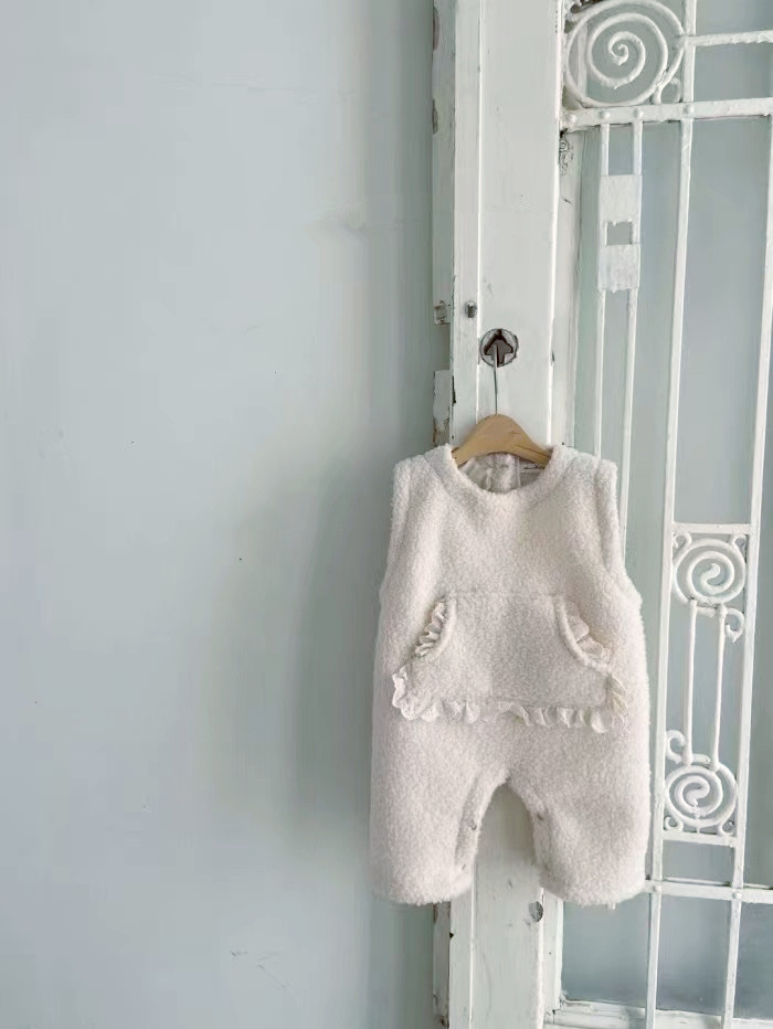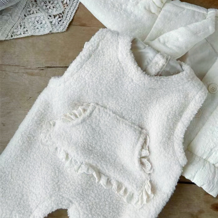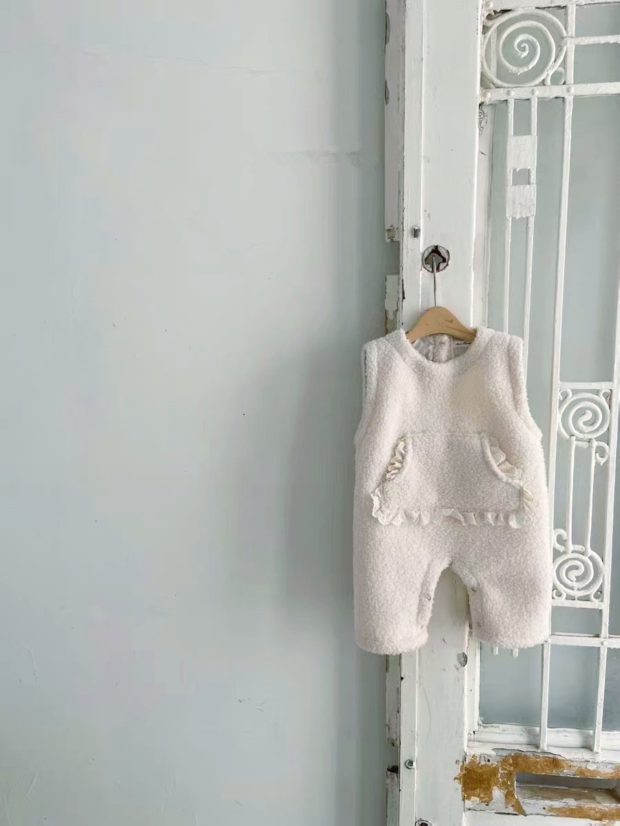 Color: beige lambswool lace large pockets sleeveless long climbing-double layer fleece-lined, khaki lambswool sleeveless romper-double layer fleece-lined, creamy-white lambswool sleeveless romper-double layer fleece-lined