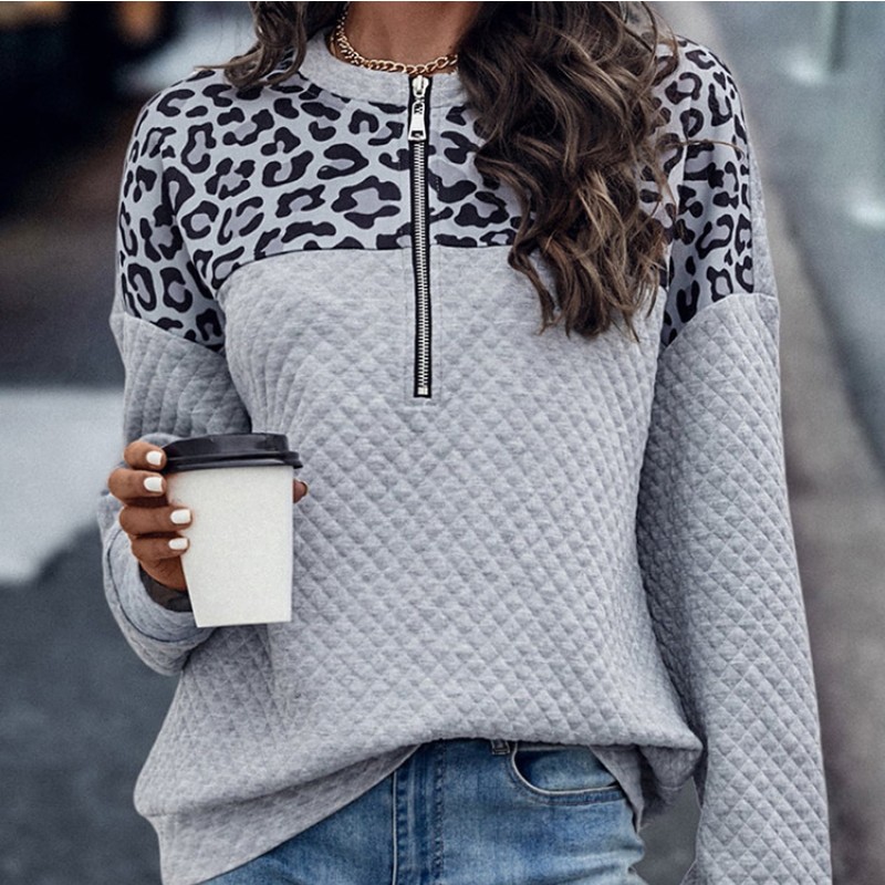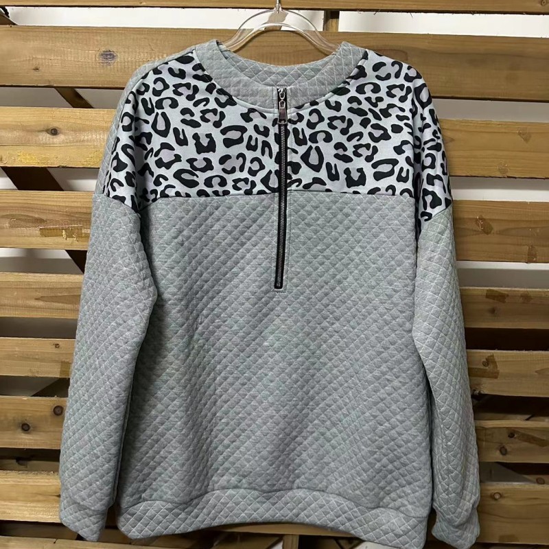 Winter New Leopard Splicing Drop Shoulder Zipper Sweater For Women