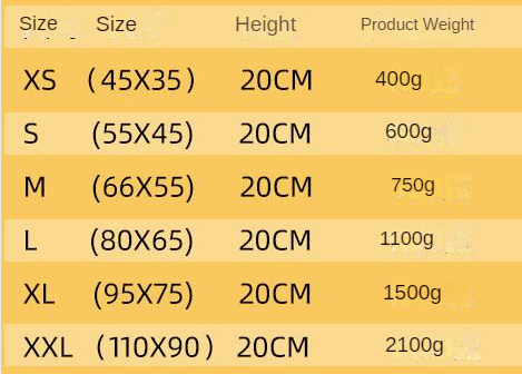 Specifications: XS (45X35), S (55X45), M (66X55), L (80X65), XL (95X75), XXL (110X90)