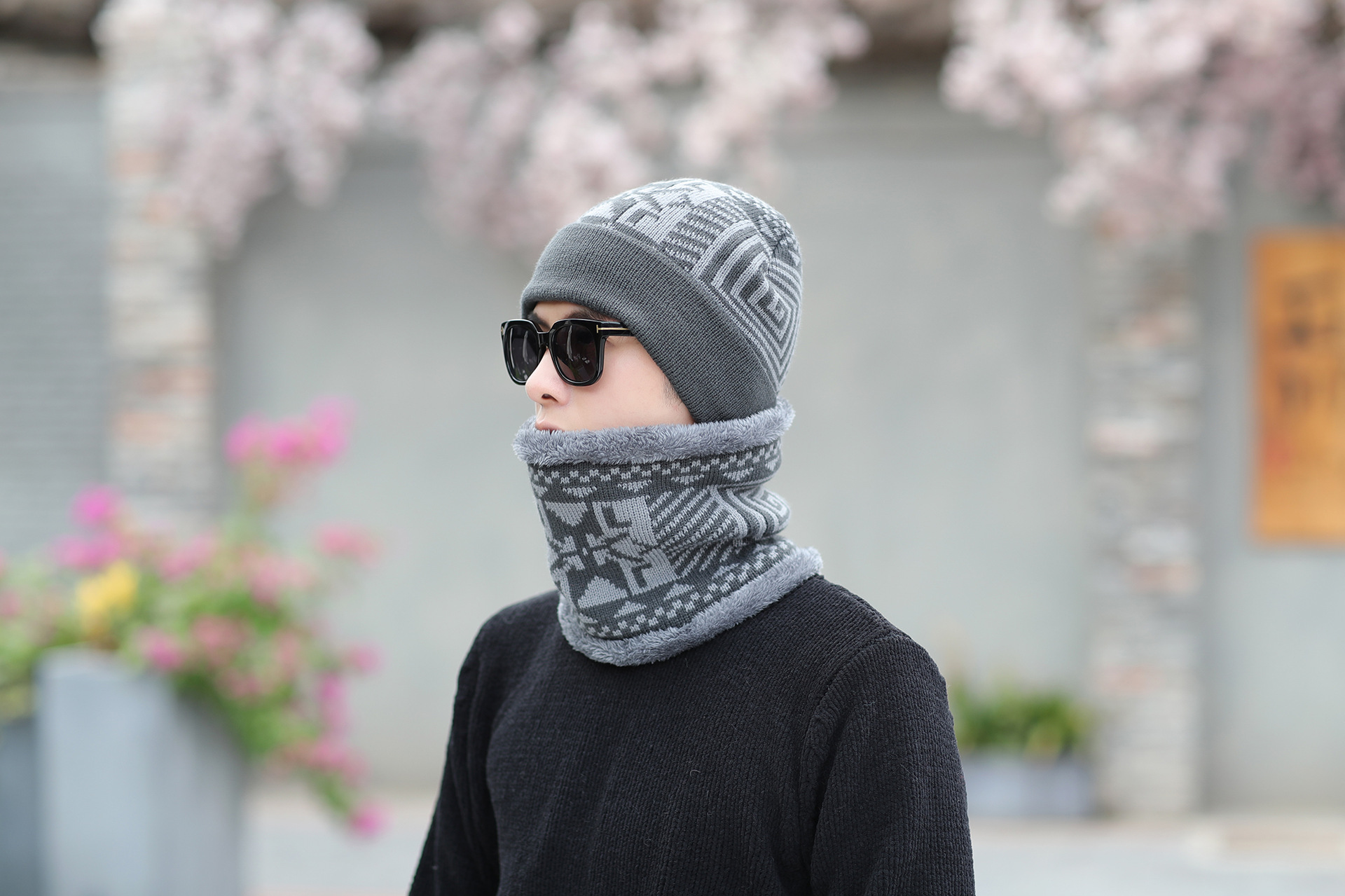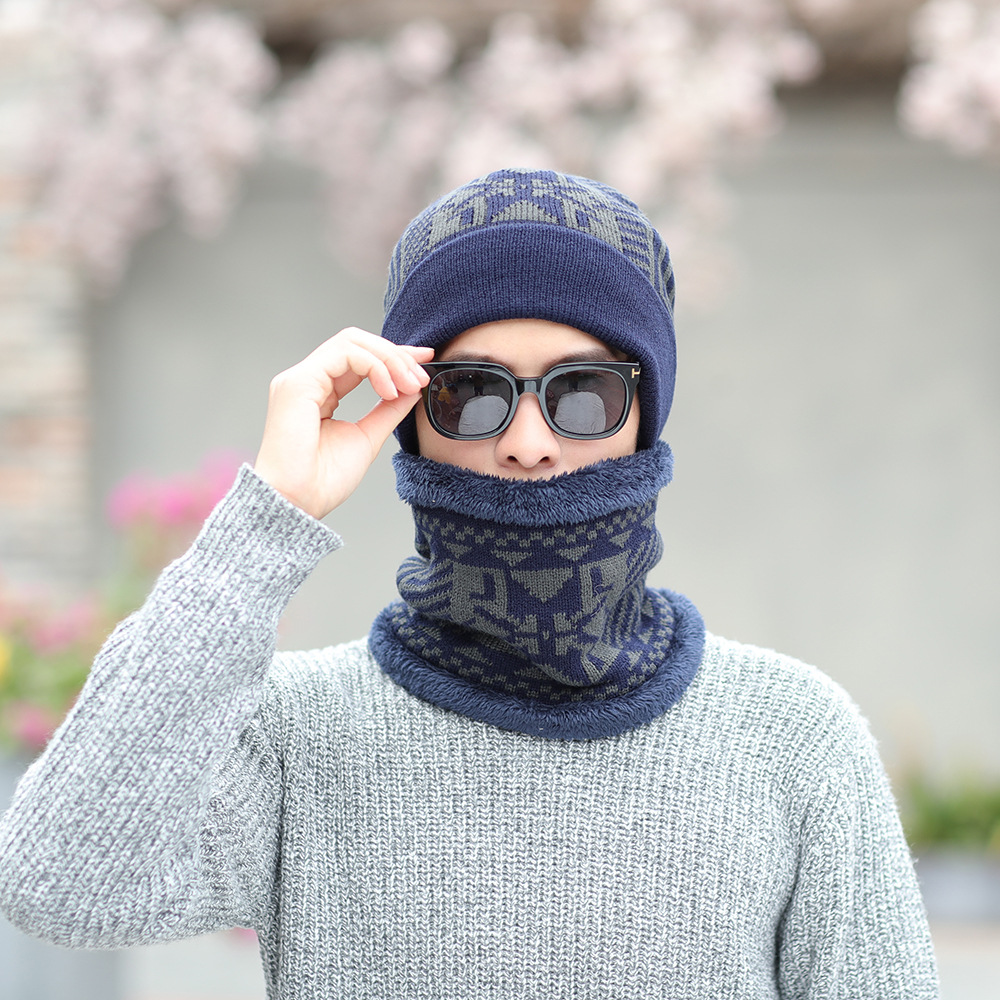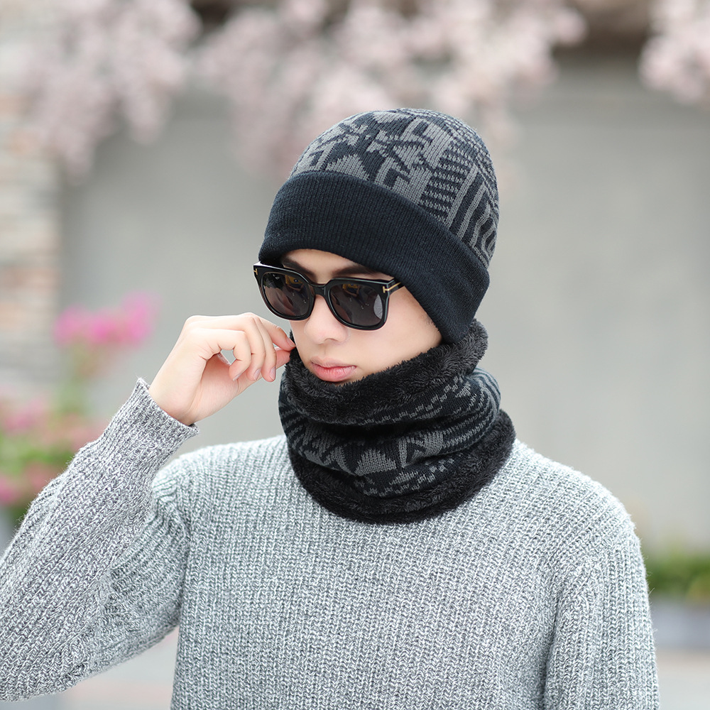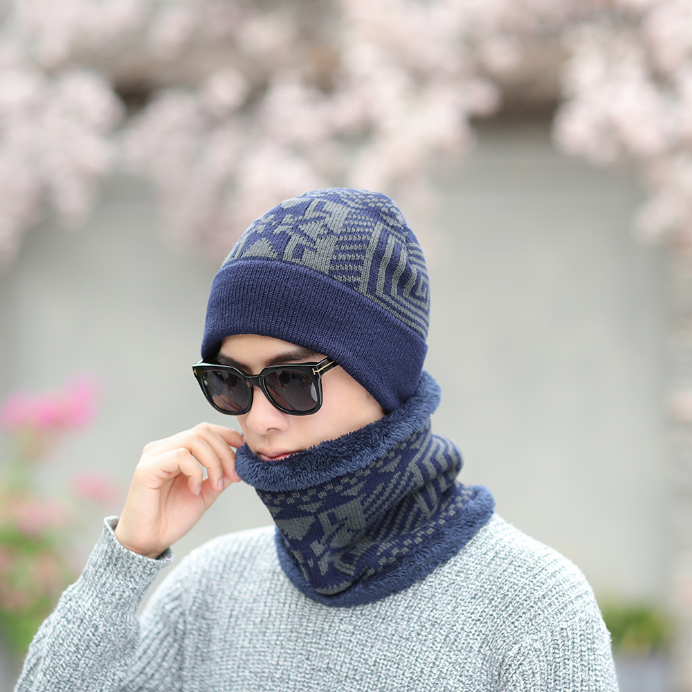 Product category: knitted hat Applicable gender: Male Knitting method: plain weave Processing method: tie dyeing Fashion element: Nude Color: Men's Jacquard geometric cap and neck two-piece set - black, men's Jacquard geometric cap and neck two-piece set - gray, men's Jacquard geometric head cap and neck two-piece set - Navy Size: m (56-58cm)