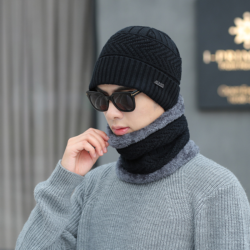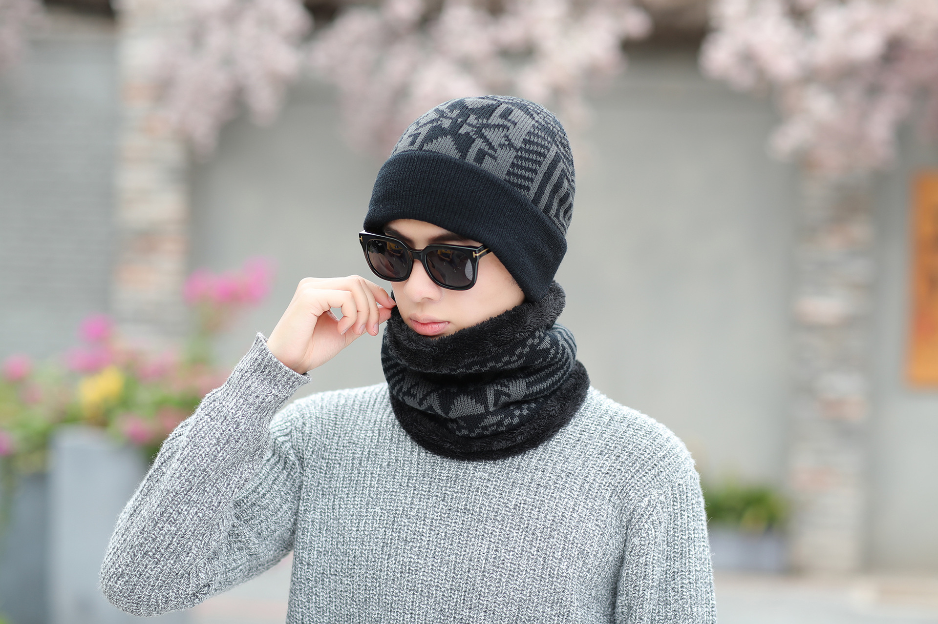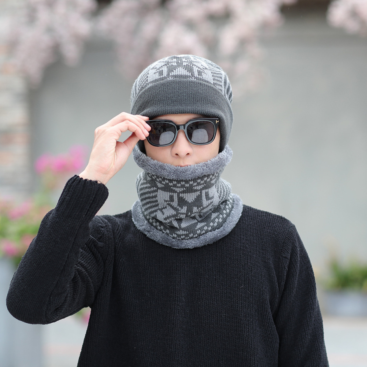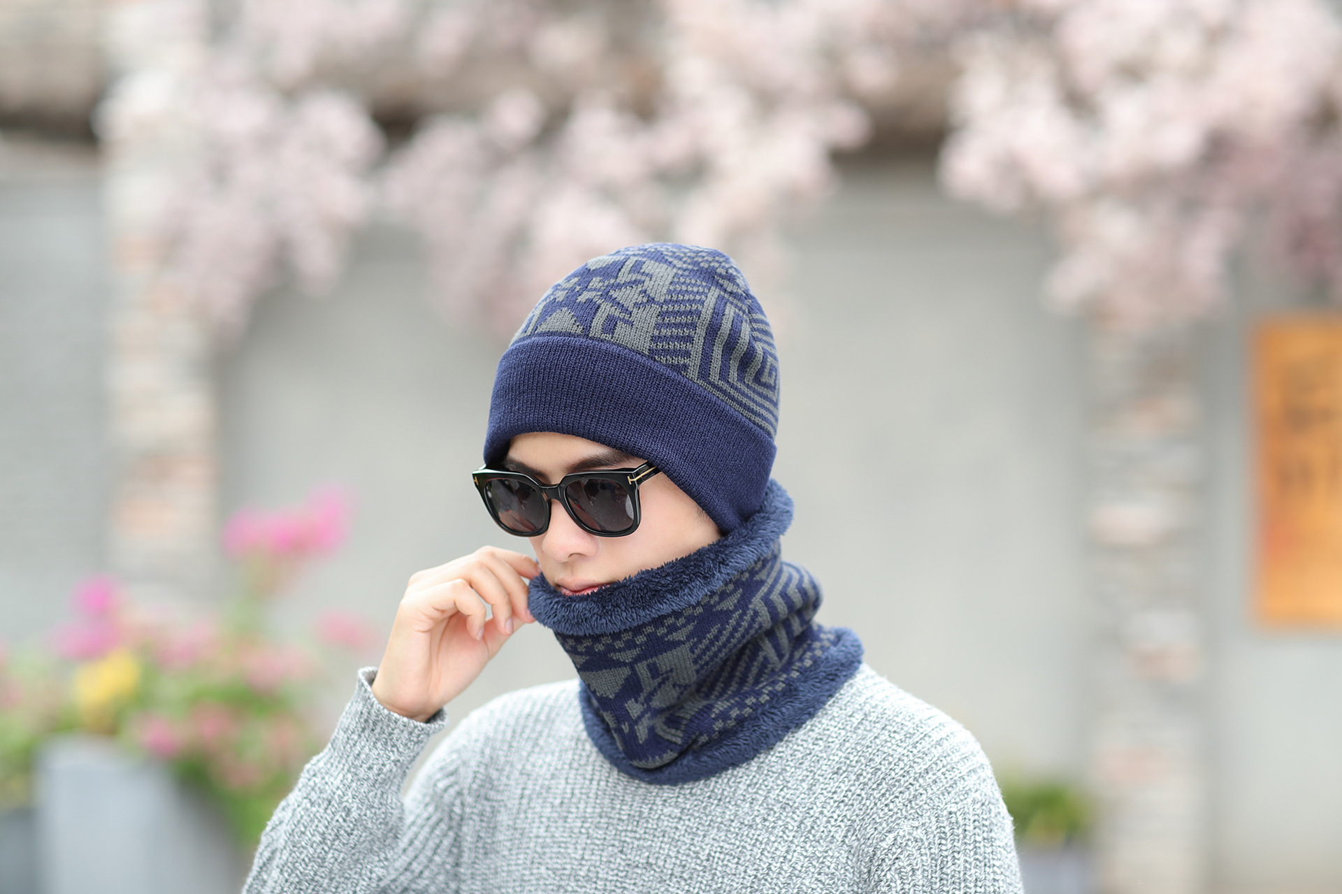 Product category: knitted hat Applicable gender: Male Knitting method: plain weave Processing method: tie dyeing Fashion element: Nude Color: Men's Jacquard geometric cap and neck two-piece set - black, men's Jacquard geometric cap and neck two-piece set - gray, men's Jacquard geometric head cap and neck two-piece set - Navy Size: m (56-58cm)