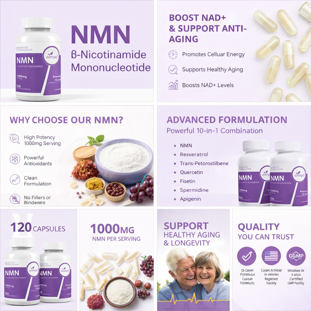 WINYEL NMN Complex 1000mg is a powerful 10-in-1 anti-aging and cellular energy formula designed to support NAD+ levels, promote healthy aging, and enhance overall vitality.