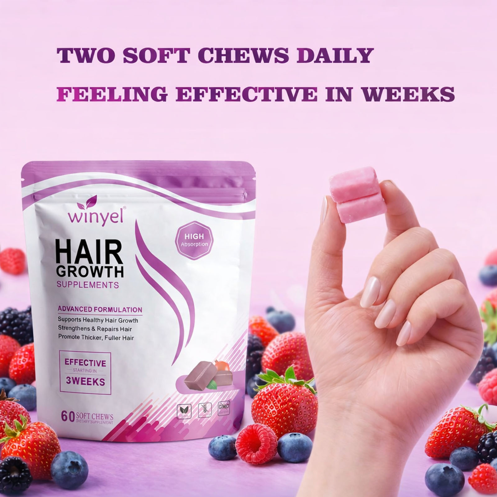 WINYEL Hair Growth Soft Chewables, Containing Hair Growth Vitamins For Men And Women, Biotin, To Help Create Thicker, Fuller, And Stronger Hair, Mixed Berries, 60 Soft Chewables.
