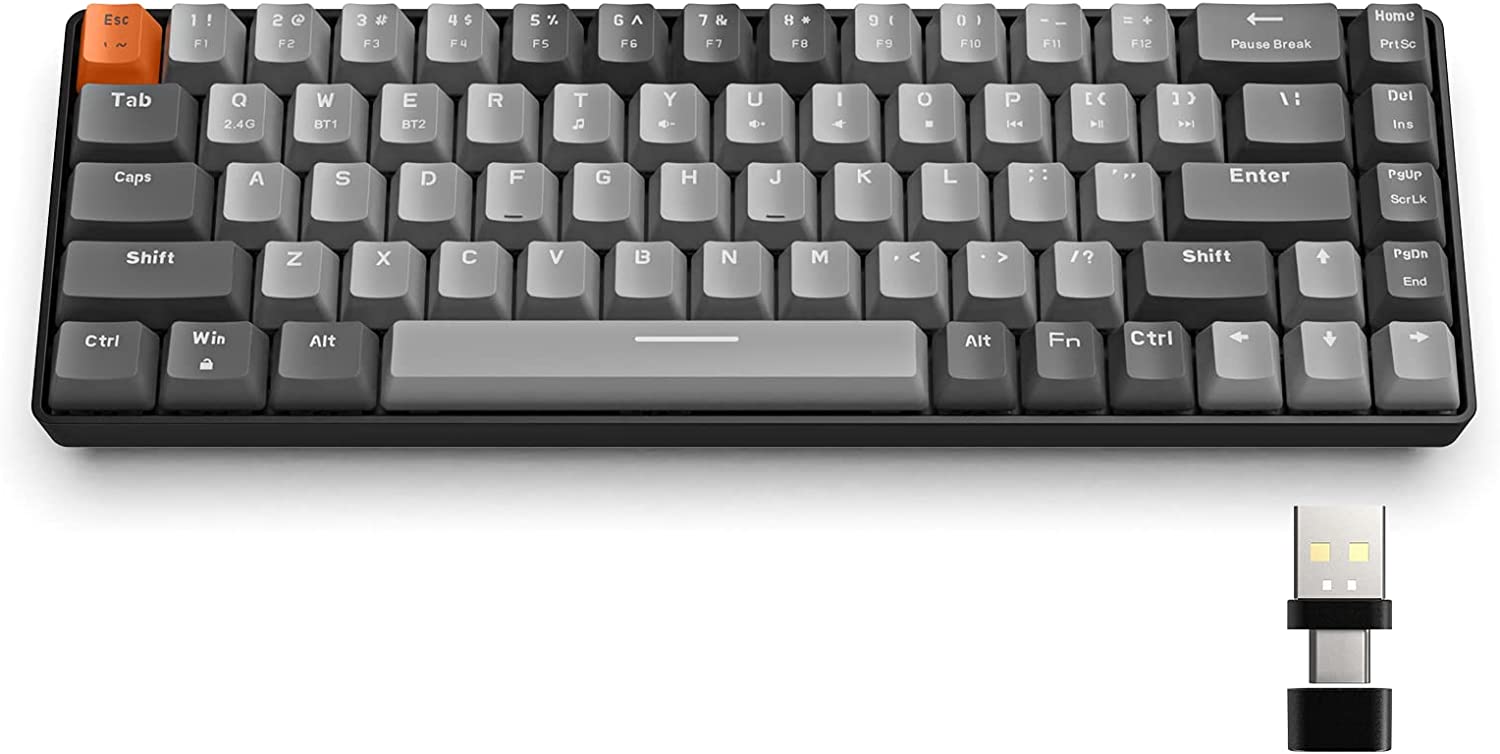 • 【Bluetooth 5.0/2.4Ghz Wireless Mechanical Keyboard】Bluetooth keyboard supports connecting PC,Laptop,Ipad,mobile phone,PS4 and other devices through Bluetooth and the latest 2.4Ghz USB-C Dual purpose receiver,No lag connection,convenient and reliable.It can connect 3 devices at the same time and press FN+ Q/W/E switch devices easily to maximize your work efficiency.The keyboard adopts the latest Bluetooth 5.0 version and supports connection to Bluetooth version 4.0/3.0/2.0.
