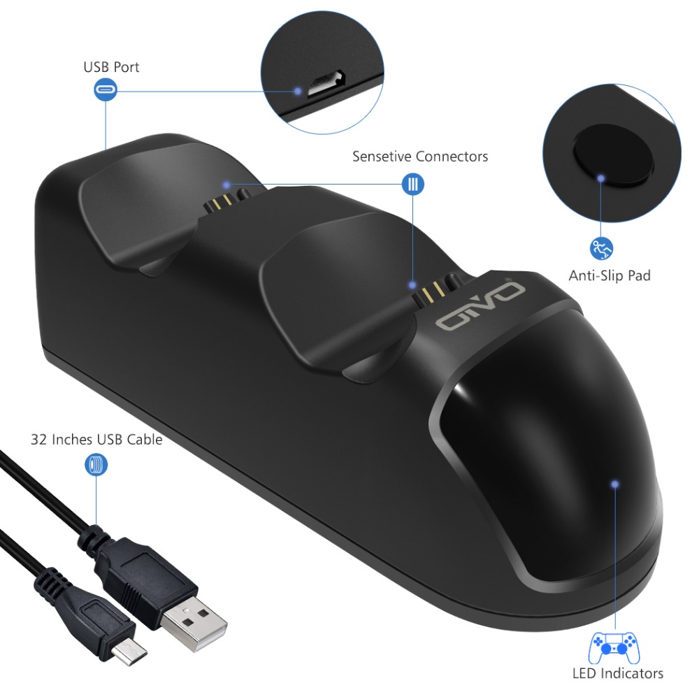 PS4 handle dual charging is a product designed according to the charging needs of PS4 handles. This product can charge two PS4 handles at the same time. Through the groove at the bottom of the product, you can more intuitively see the light status of the PS4 handle charging lamp. Standard With a DC5V input voltage, it is easier to obtain power from the PS4 host USB interface, computer USB interface or other 5V power adapter USB interface, without the need to use the PS4 host equipment and its dedicated power supply. The appearance of the product is novel and lightweight, simple to use, convenient, and practical. It is a must-have for PS4 gamers.