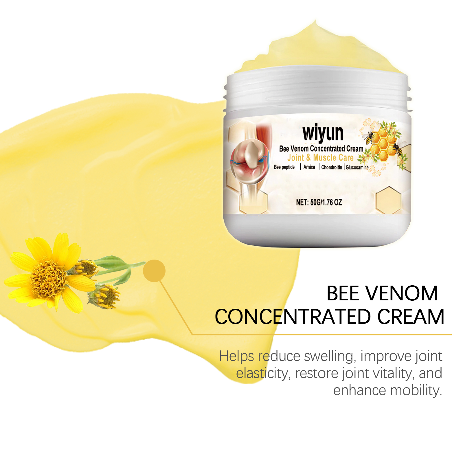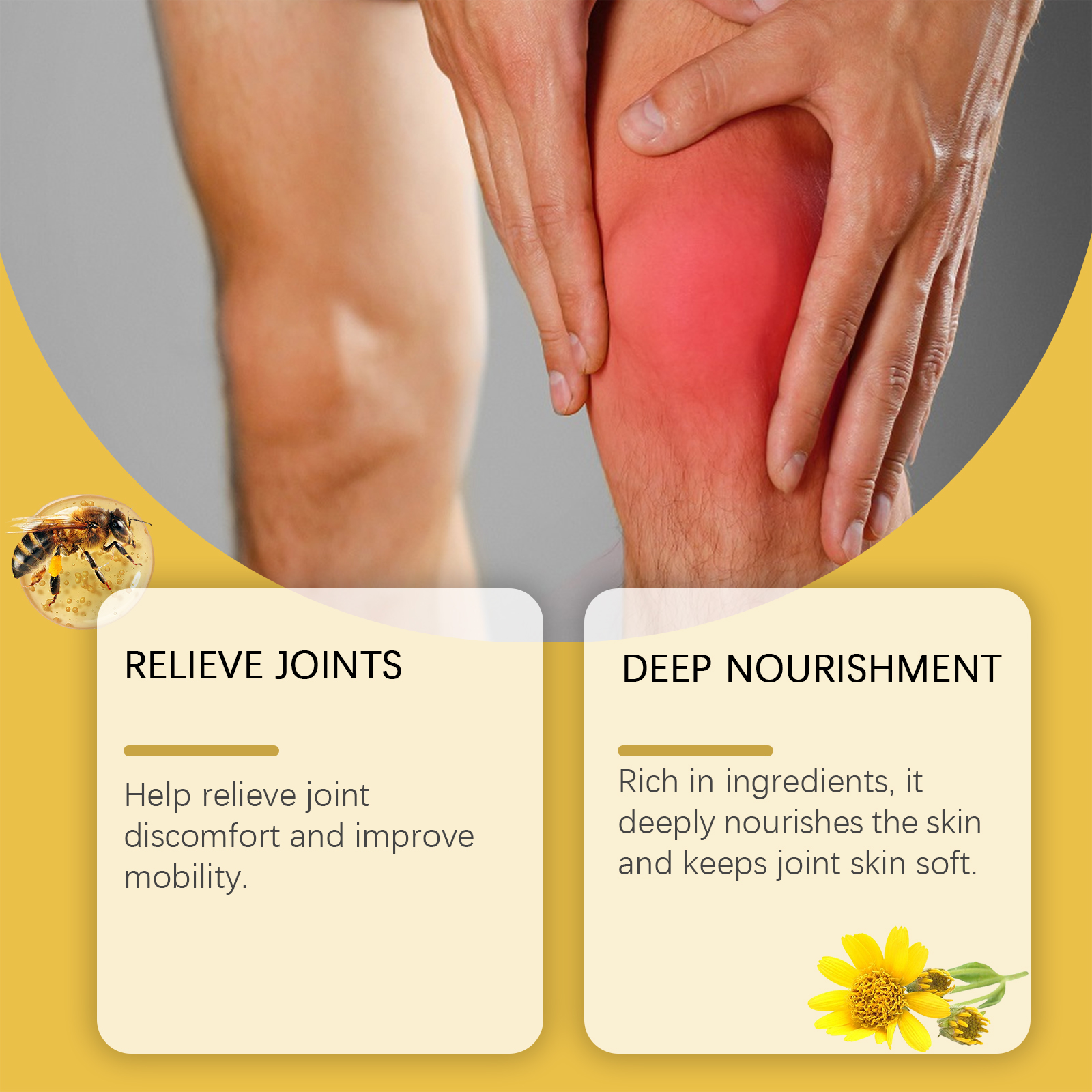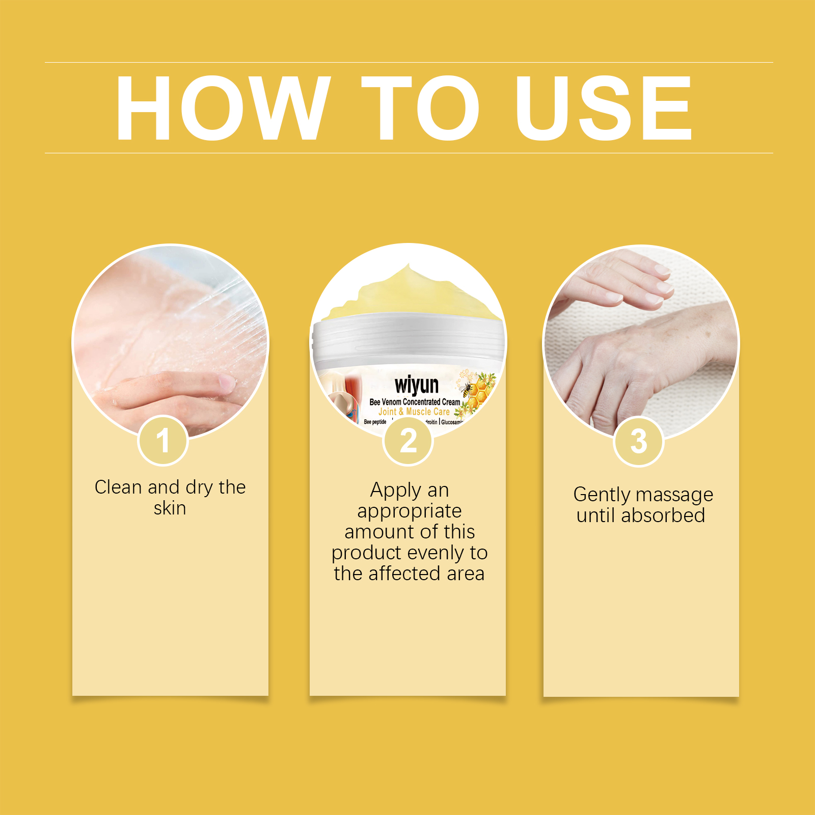 Our bee venom bone soothing cream contains glucosamine and tocopherol (vitamin E). It can deeply nourish the skin and keep the joint skin soft. Its application method is very simple: clean and dry the skin, apply appropriate amount of this product evenly to the affected area, gently massage until absorbed. It can also relieve joint discomfort and improve mobility.