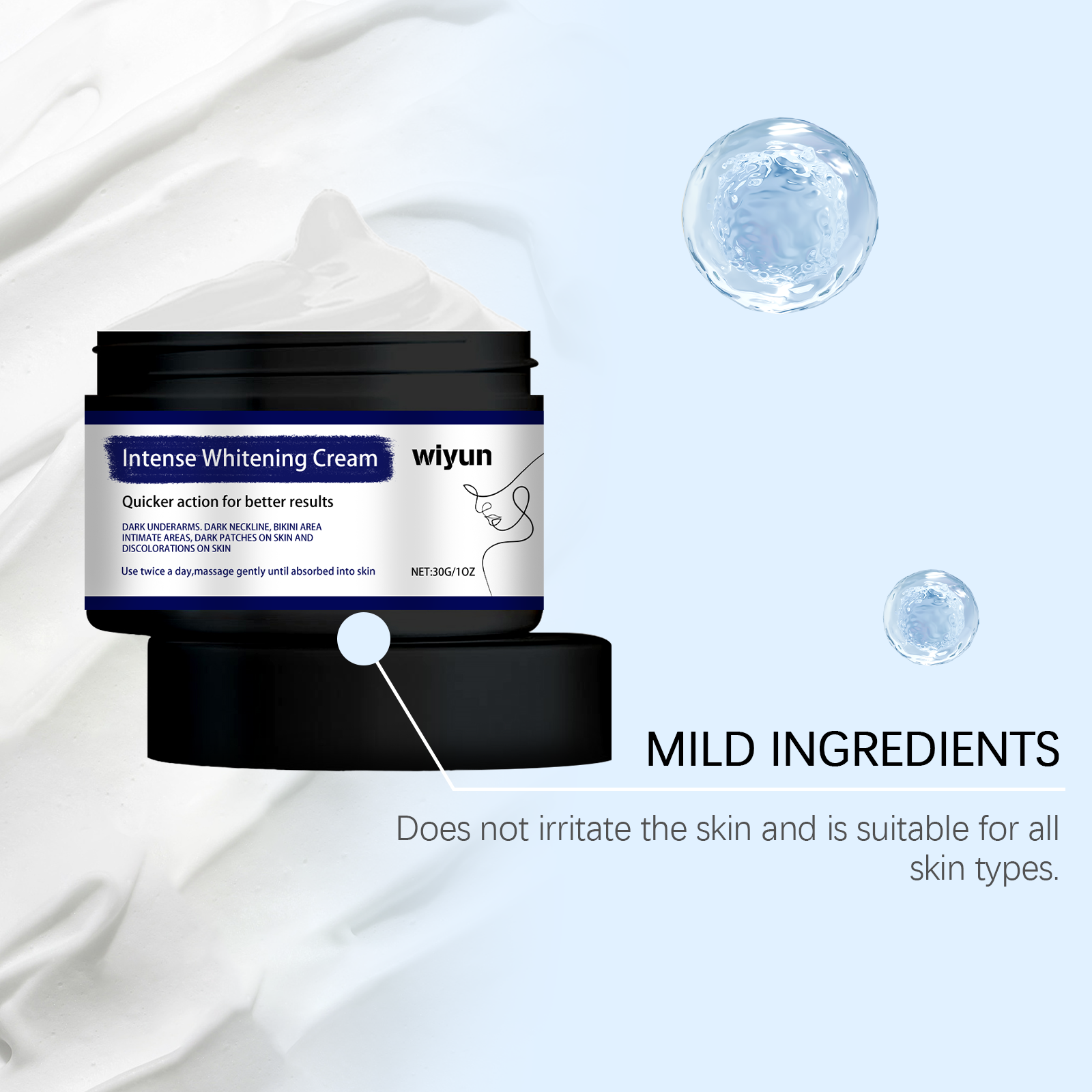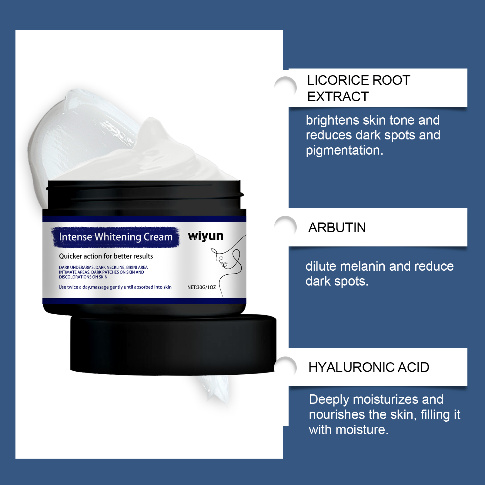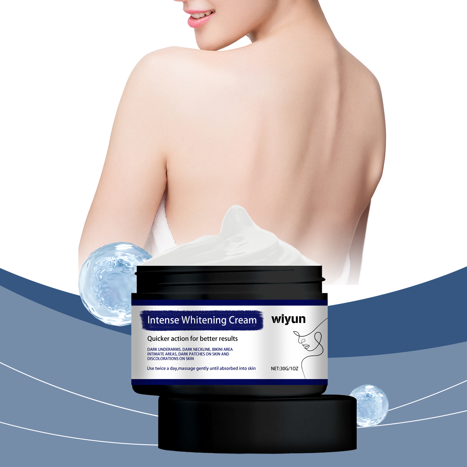Our body brightening cream contains licorice root extract, arbutin, and hyaluronic acid. It can effectively remove dark spots, even skin tone, whiten skin; Deeply moisturize the skin and provide lasting moisture. Its application method is simple: 1. Thoroughly clean and dry the skin; 2. Apply appropriate amount to neck, armpit and private area evenly. 3. Massage gently to promote full absorption. Rich in whitening ingredients, brightening skin. Reduces pigmentation and improves skin dullness.
