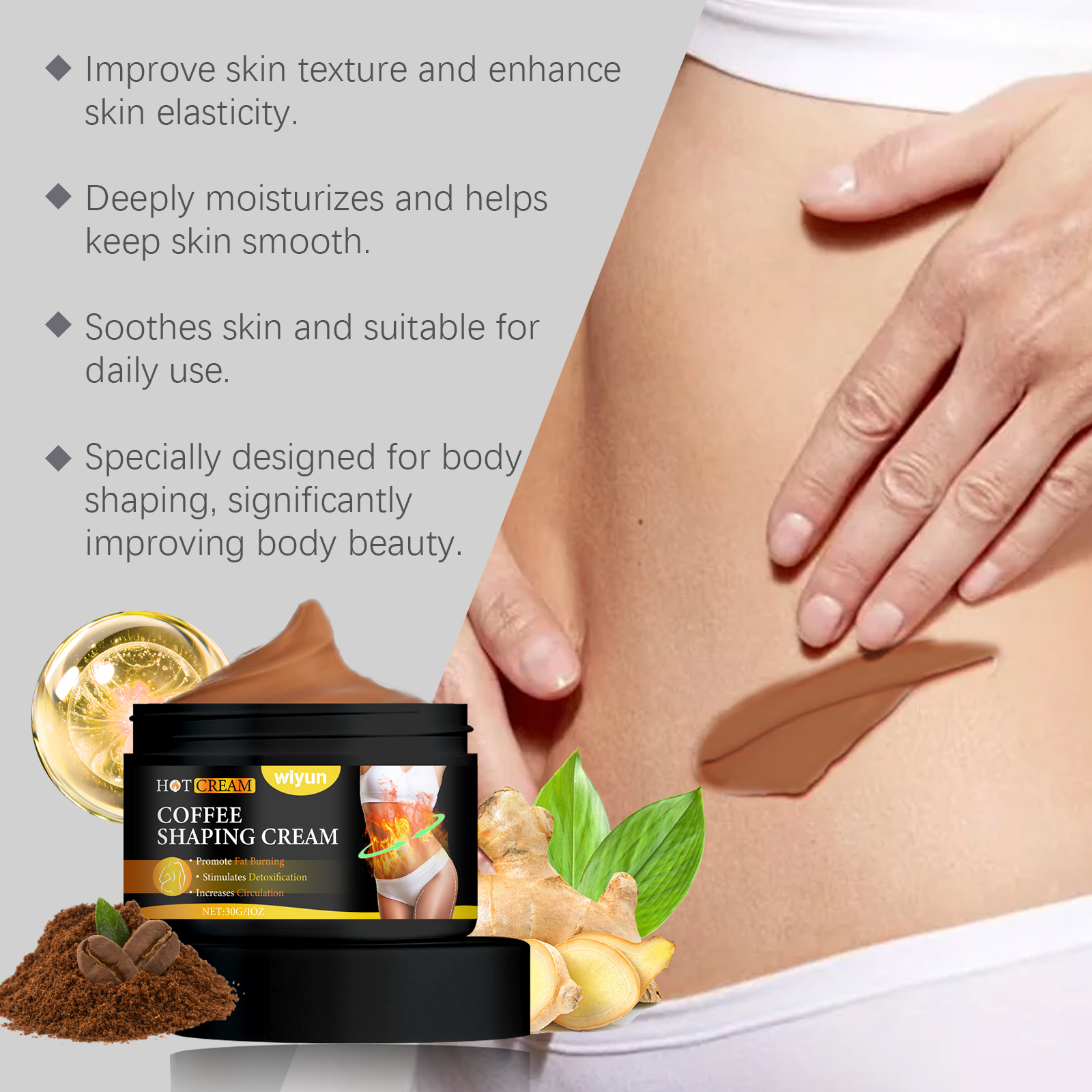 Our body massage cream is carefully formulated with Arabica coffee seed extract, ginger root extract and aloe vera leaf extract from Curacao. Specifically designed to invigorate the skin and shape its curves. Designed to promote blood circulation and firm the skin. The usage method is extremely convenient: 1. Clean the skin of the body and keep it dry; 2. Take an appropriate amount of this product and apply it evenly to the areas that need fat loss. 3. Gently massage until fully absorbed. And it is rich in moisture, making the skin soft and smooth.