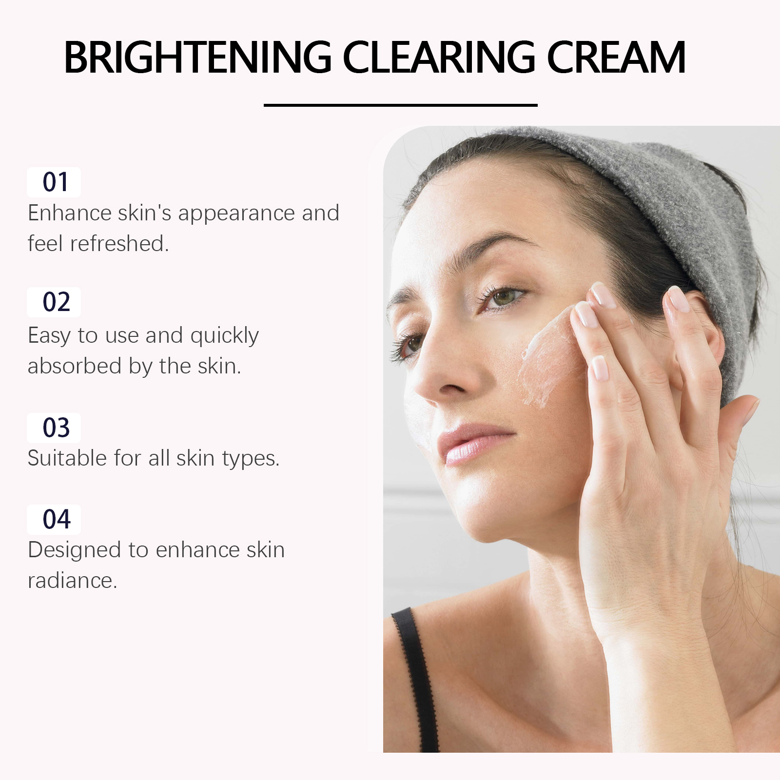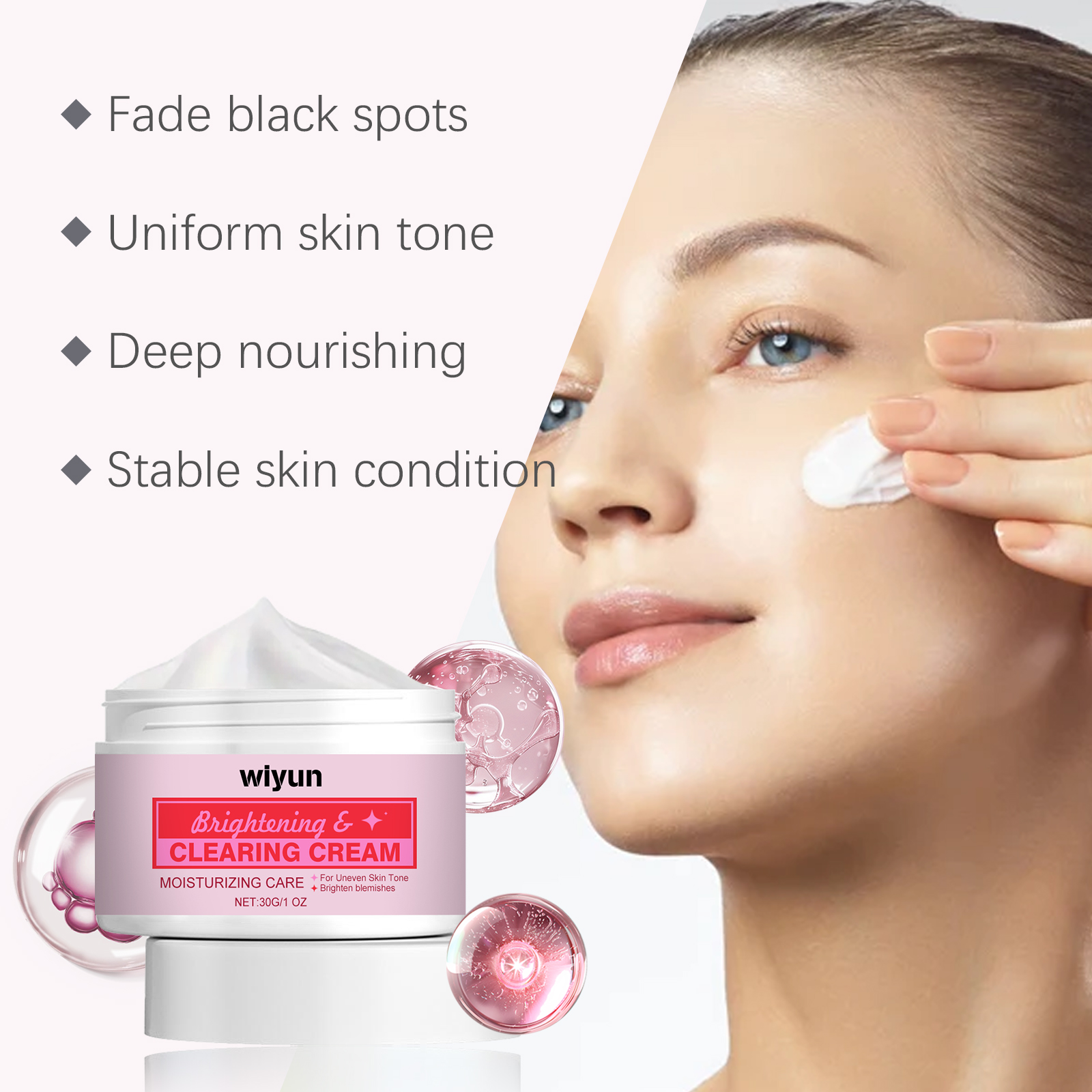 Our dark spot whitening cream contains glutathione and vitamin C. It strengthens the skin protective layer and protects the skin. Its application method is very simple: clean facial skin, keep dry, apply appropriate amount of this product evenly on facial skin, massage gently with fingertips in circular motions until completely absorbed. And keep using it, and your skin will feel better.