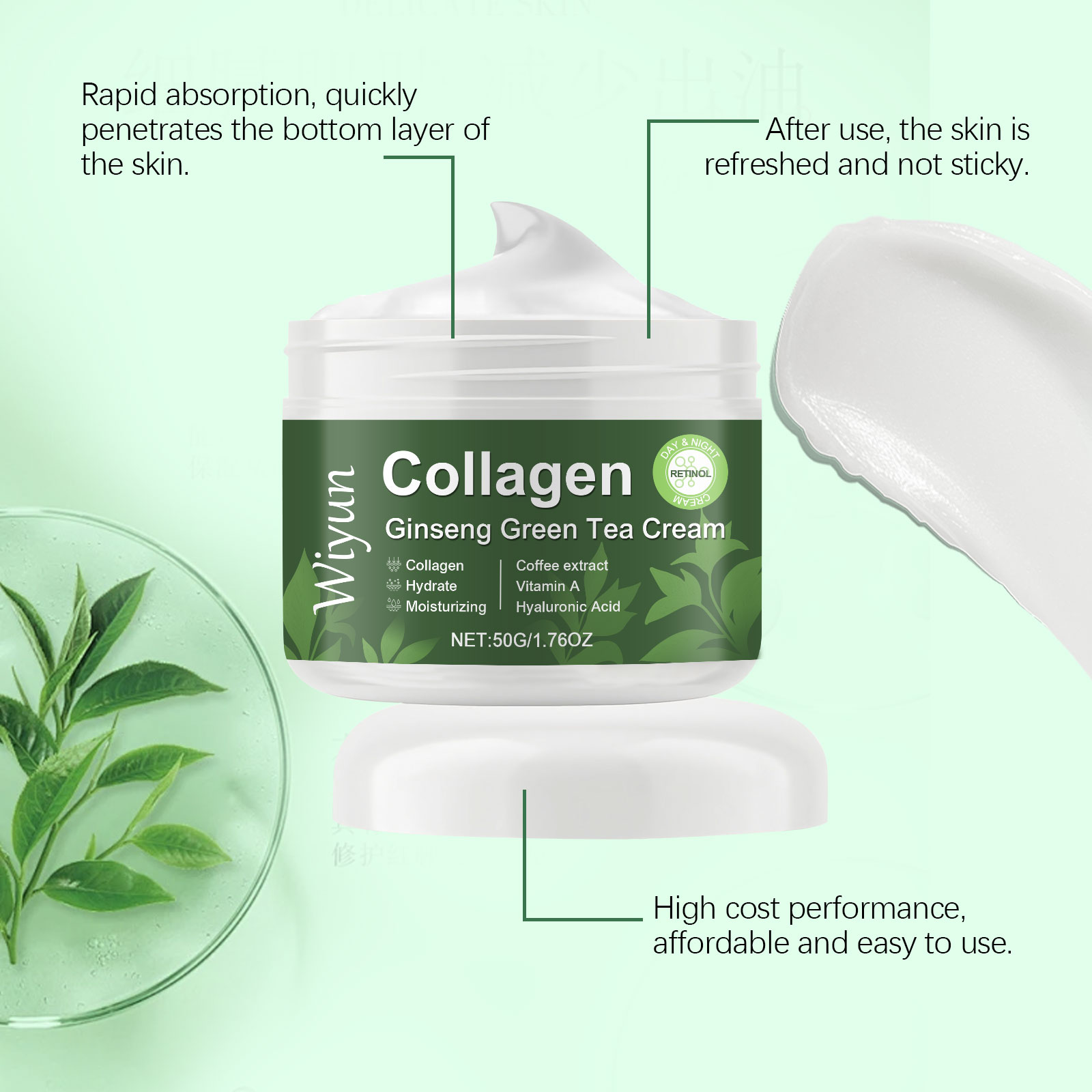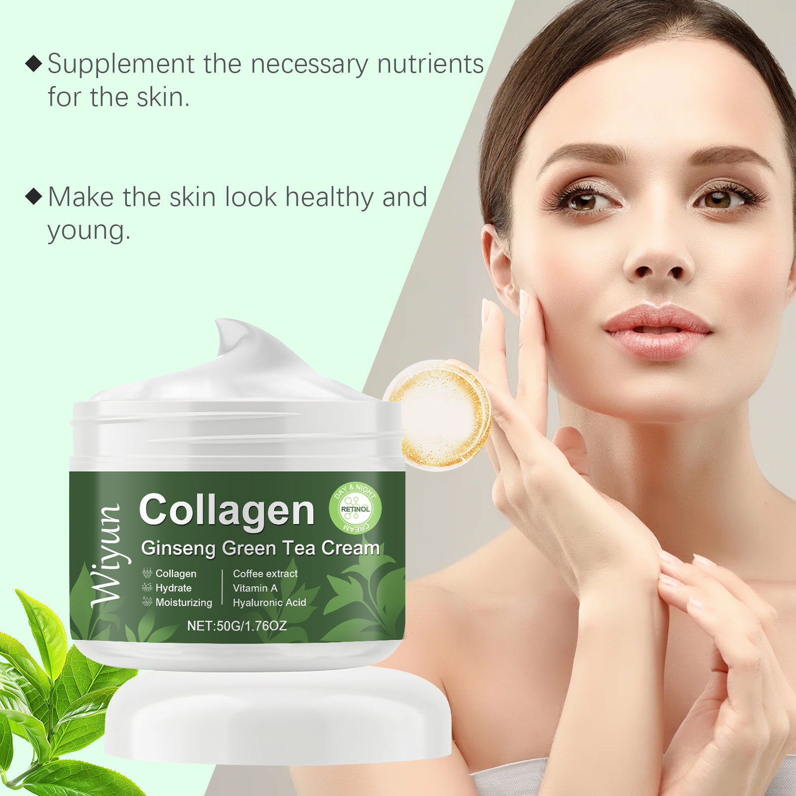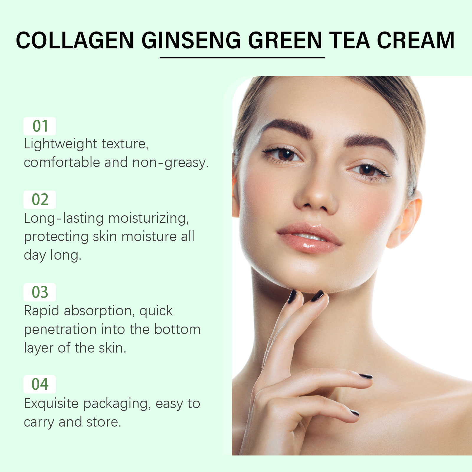 Our collagen ginseng green tea moisturizer is carefully blended with glycerin, glycerin stearate and mineral oil. Designed to help skin firm and smooth. Easy to use: Thoroughly clean and dry your skin. Take appropriate amount of this product, evenly apply to facial skin, gently massage to promote better absorption. And can be easily applied and evenly covered to improve the overall condition of the skin.